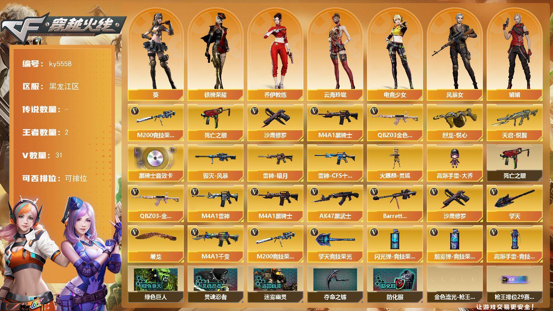 - [16169353]黑龙江区-28V-1王者-0炫金 【传说武器】:传说幽冥 【热门武器】:传说幽冥,G36C-幻影,QBZ03-金色蔷薇,M200-幻神,Kar98K-星神,C.A.T,COP-白鲨,沙鹰-修罗 【皮肤】:M200-幻神-黄忠皮肤,幻神-丹凤,金色蔷薇-量子蔷薇 皮肤,裁决-运输船 皮肤,雷神-暗月,雷神-传奇N9,雷神-烈虎皮肤,火麒麟-AG战队皮肤,火麒麟-雷神,AK47-火麒麟-传奇EVEN*2,火麒麟-心动糖果,毁灭-战神张飞,毁灭-英雄计划 皮肤 【角色】:星际战将,战地猎狐,王者-瞳-闭月羞花,王者凌霄,王者潘多拉,奇洋探员,乔伊教练,修道士,云海玲珑,暗夜-X,芳心审判者,风暴女,虎妞,嘉年华灵狐,娟娟,兰妹妹,灵狐者-X,灵狐者-七夕宝贝,龙儿,麻雀,曼陀罗-X,潘多拉-X,潘多拉-甜心教官,青霞仙子,斯沃特-X 【人偶武器】:COP-白鲨,Scar Light-马枪,AWM-灵狐-15周年嘉年华,C.A.T,迷你超能女侍,灵狐娃娃手雷*2 【暴走生化】:超级对讲机 【挑战大师】:冰龙粉碎者-白马银枪,神圣爆裂者-末日III 【英雄级武器】:AK47-火麒麟,M4A1-雷神,无影-神兵利器,G36C-幻影,黑武士-锦绣游龙,QBZ03-金色蔷薇,黑骑士-海王,王者之烈-觉醒版,Barrett-毁灭,AWM-裁决,M200-幻神,Kar98K-星神,沙鹰-修罗,天神-动感闪耀,麒麟刺,幻灵之锋,屠龙-动感闪耀,高爆手雷-幻灵,手雷-动感闪耀,闪光弹-幻灵,烟雾弹-幻灵,M4A1-赤狱骑士 【道具】:CFS限定背包,云山科技背包,亚洲杯纪念炫彩背包,炫彩背包,超级背包,救世主-黑桃战神,黄金生化钩,绿色巨人,灵魂忍者,迷雾幽灵,生化弹匣,夺命之镰,防化服*3,金色流光-枪王排位*2,星辰流光-枪王排位,巅峰赛先锋-金色流光,枪王排位28赛季金色流光,枪王排位29赛季金色流光,动感闪耀表情,C4-再燃火线,防弹头盔*4,防弹衣*4,C4工具钳*4,手雷包*4 【特殊枪械】: