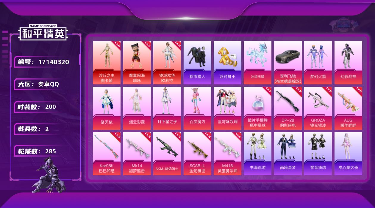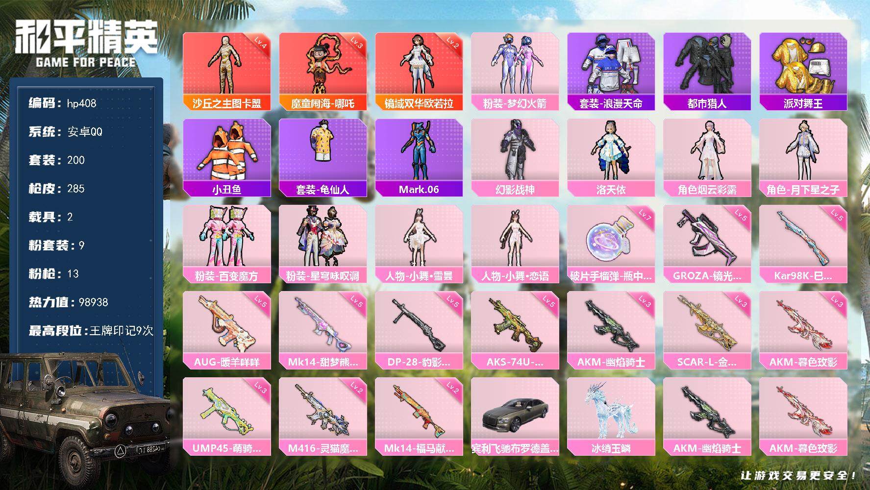 [17140320]安卓 手Q-3神装-9粉装-13特效枪-2载具-13粉色飞行器-98938热力值-9王牌印记-200套装-285枪皮