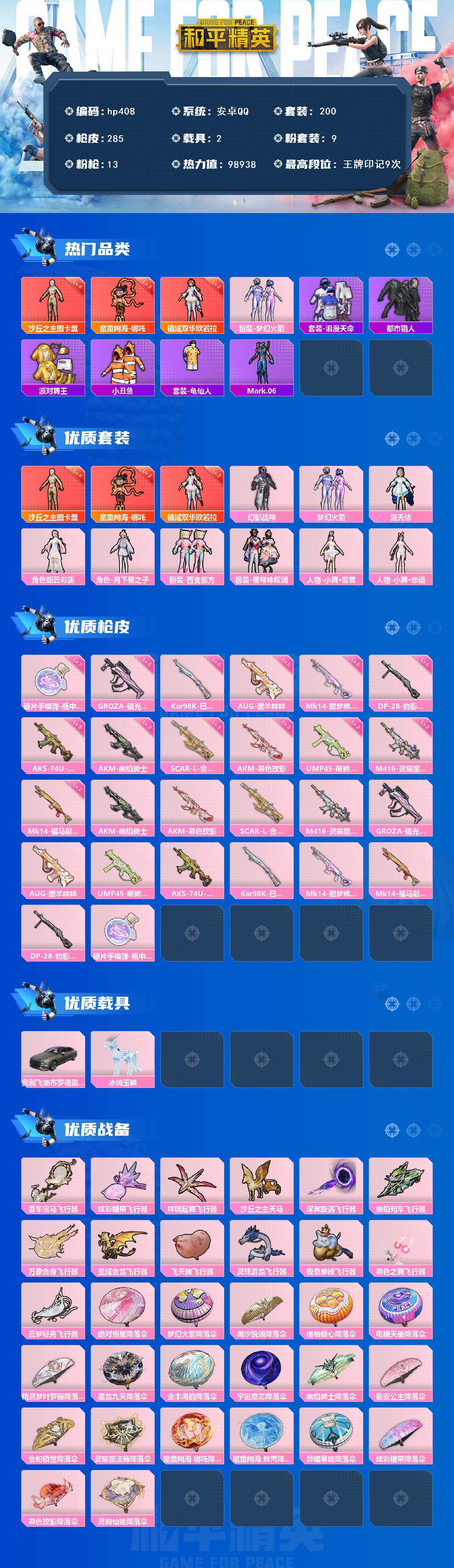 [17140320]安卓 手Q-3神装-9粉装-13特效枪-2载具-13粉色飞行器-98938热力值-9王牌印记-200套装-285枪皮 【红色神装等级】:魔童闹海-哪吒(三级),镜域双华-欧若拉(二级),沙丘之主-图卡盟(四级) 【红色角色神装】:魔童闹海-哪吒,镜域双华-欧若拉,沙丘之主-图卡盟 【热门品类】:粉装-梦幻火箭,套装-浪漫天命,套装-都市猎人,套装-派对舞王,套装-小丑鱼,套装-龟仙人,角色-Mark.06 【粉色套装】:粉装-幻影战神,粉装-梦幻火箭,角色-洛天依,角色-烟云彩露,角色-月下星之子,粉装-百变魔方,粉装-星穹咏叹调,人物-小舞·雪昙,人物-小舞·恋语 【粉色枪皮等级】:AKM-幽焰骑士(三级),AKM-暮色玫影(三级),SCAR-L-金蛇镇世(三级),M416-灵猫魔法师(二级),GROZA-镜光银凌(五级),AUG-暖羊咩咩(五级),UMP45-萌骑冒险(三级),AKS-74U-森灵之息(五级),Kar98K-巳巳如意(五级),Mk14-甜梦熊击(五级),Mk14-福马献瑞(二级),DP-28-豹影疾电(五级),破片手榴弹-瓶中星球(七级) 【粉色载具】:宾利飞驰(布罗德盖棕双色),冰绡玉鳞 【粉色枪皮】:AKM-幽焰骑士,AKM-暮色玫影,SCAR-L-金蛇镇世,M416-灵猫魔法师,GROZA-镜光银凌,AUG-暖羊咩咩,UMP45-萌骑冒险,AKS-74U-森灵之息,Kar98K-巳巳如意,Mk14-甜梦熊击,Mk14-福马献瑞,DP-28-豹影疾电,破片手榴弹-瓶中星球 【粉色飞行器】:香车宝马飞行器,炫彩糖果飞行器,祥瑞起舞飞行器,沙丘之主天马,深渊漩涡飞行器,幽焰列车飞行器,万象金身飞行器,圣域金龙飞行器,飞天猪飞行器,灵珠游龙飞行器,极意拳锋飞行器,暮色之舞飞行器,云梦轻舟飞行器 【粉色降落伞】:绝对恒星降落伞,梦幻火箭降落伞,潮汐统领降落伞,橘柚倾心降落伞,电糖天使降落伞,精灵梦叶罗丽降落伞,墨龙九天降落伞,金丰海韵降落伞,宇宙意志降落伞,幽焰骑士降落伞,临安公主降落伞,金蛇镇世降落伞,灵猫魔法师降落伞,魔童闹海 哪吒降落伞,魔童闹海 敖丙降落伞,异瞳寒姬降落伞,炫彩糖果降落伞,暮色玫影降落伞,灵驹仙姬降落伞 【稀有套装】:套装-龟仙人,套装-巳巳如意,角色-甜心蒙太奇,套装-雪国风尚,套装-炫彩糖果,套装-马上来财,套装-雏菊兔
