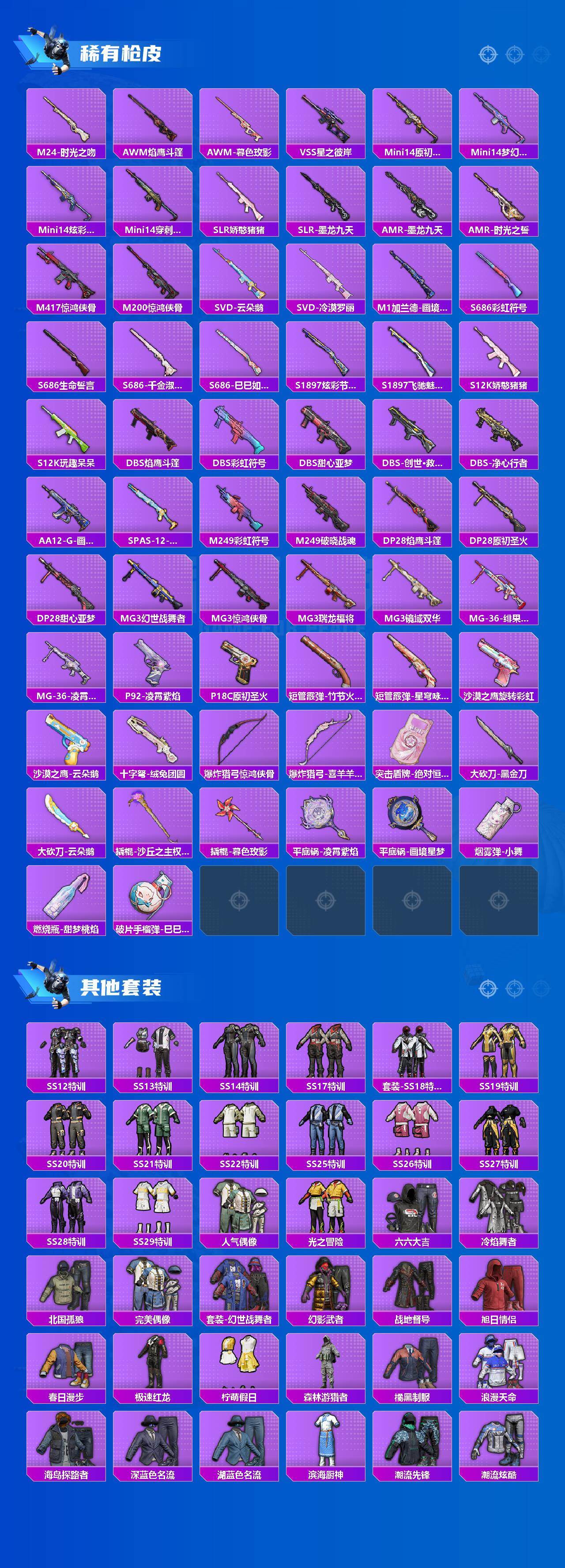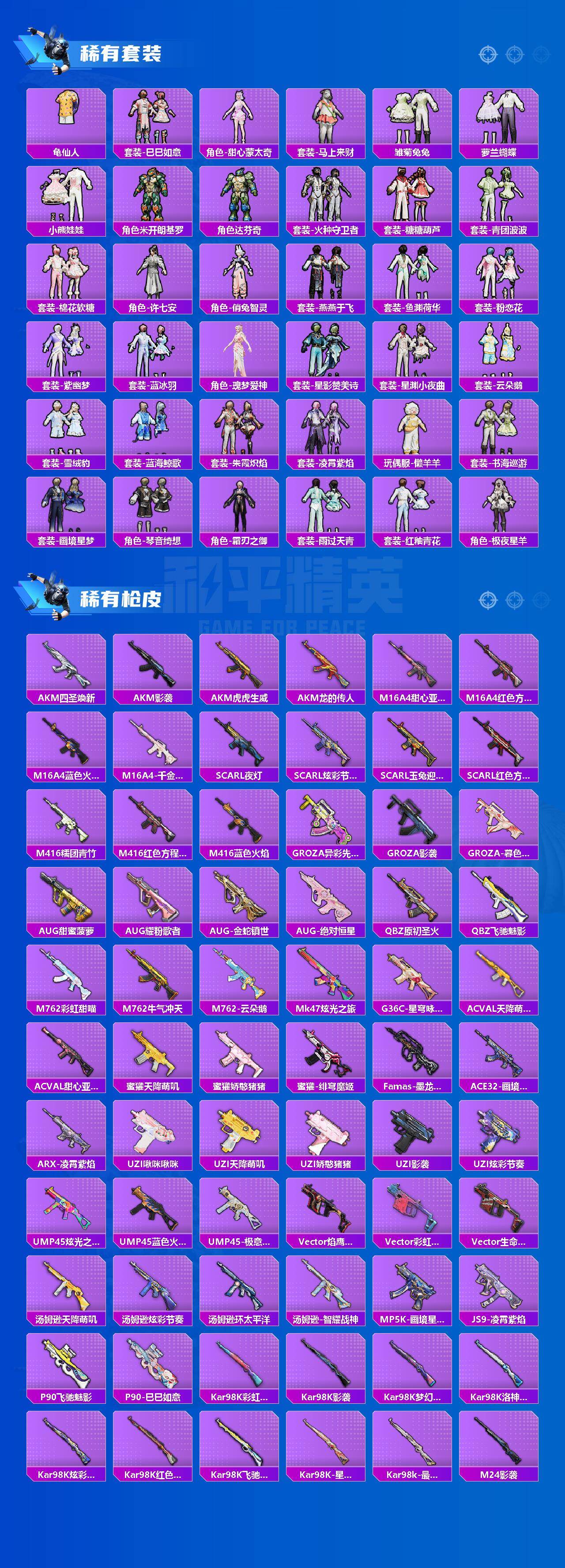 【粉色枪皮】:AKM-幽焰骑士,AKM-暮色玫影,SCAR-L-金蛇镇世,M416-灵猫魔法师,GROZA-镜光银凌,AUG-暖羊咩咩,UMP45-萌骑冒险,AKS-74U-森灵之息,Kar98K-巳巳如意,Mk14-甜梦熊击,Mk14-福马献瑞,DP-28-豹影疾电,破片手榴弹-瓶中星球