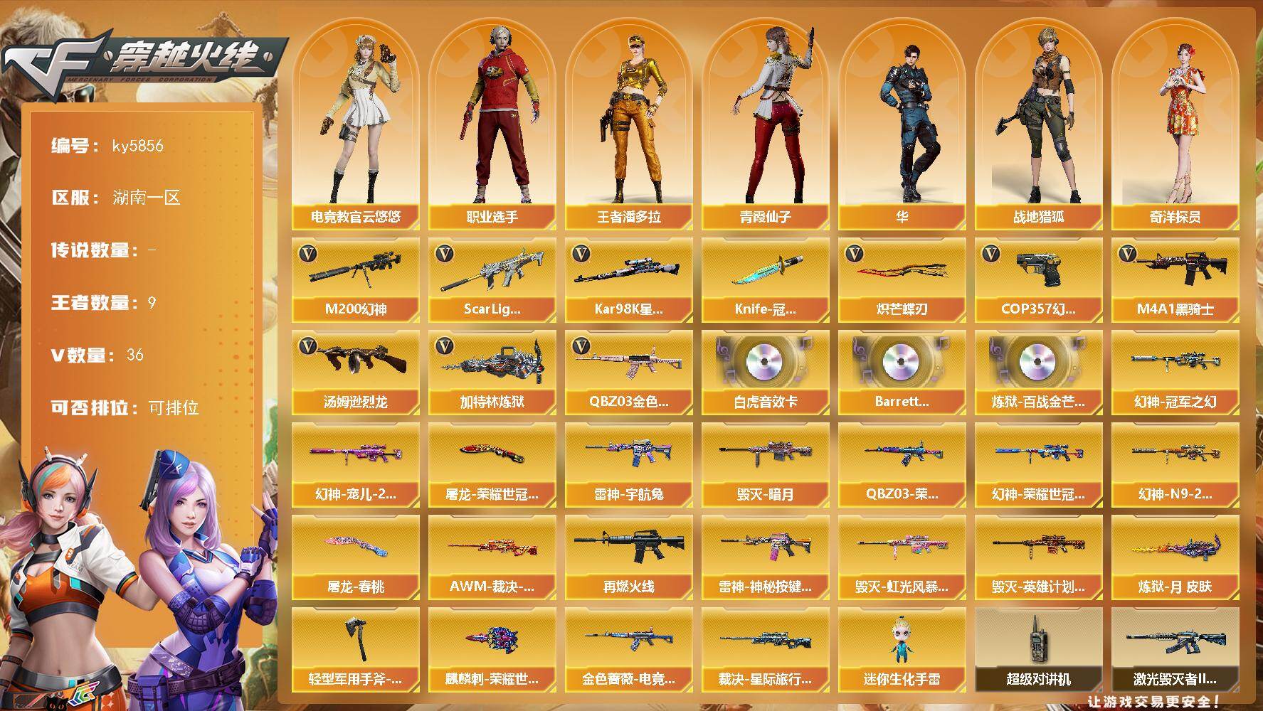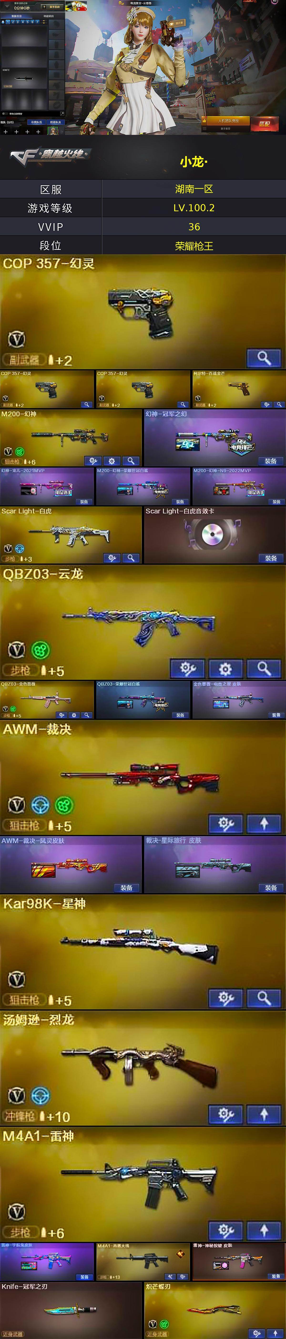 [17017918]湖南一区-44V-9王者武器数-0炫金武器数 【热门武器】:QBZ03-金色蔷薇,Scar Light-白虎,M200-幻神,Kar98K-星神,M4A1-黑骑士,汤姆逊-烈龙,加特林-炼狱,COP 357-幻灵*3,Knife-冠军之刃,炽芒蝶刃 【音效卡】:Scar Light-白虎音效卡,Barrett-碧霄极光音效卡,炼狱-百战金芒-庆典舞曲音效卡 【皮肤】:幻神-冠军之幻,幻神-宠儿-2021MVP,M200-幻神-荣耀世冠白鲨,M200-幻神-N9-2022MVP,QBZ03-荣耀世冠白鲨,金色蔷薇-电竞之星 皮肤,AWM-裁决-凤灵皮肤,裁决-星际旅行 皮肤,雷神-宇航兔皮肤,M4A1-再燃火线,雷神-神秘按键 皮肤,毁灭-暗月,毁灭-虹光风暴 皮肤,毁灭-英雄计划 皮肤,炼狱-月 皮肤,屠龙-荣耀世冠AG,屠龙-春桃 皮肤,轻型军用手斧-再燃火线,麒麟刺-荣耀世冠白鲨 【角色】:电竞教官-云悠悠,华,战地猎狐,王者潘多拉,奇洋探员,暗夜-X,电竞少女,飞虎队-X,风暴女,虎妞,嘉年华灵狐,0号玩家,灵狐者-X,灵狐者-黄金海岸,潘多拉-X,潜龙队-X,青霞仙子,斯沃特-X,新娜塔莎,影武者-X,游珑儿,职业选手 【人偶武器】:迷你生化手雷 【暴走生化】:超级对讲机 【挑战大师】:激光毁灭者III-白马银枪 【英雄级武器】:AK47-火麒麟,M4A1-雷神,M4A1-黑骑士,AK12-天启,Scar Light-白虎,QBZ03-天罚,QBZ03-云龙,QBZ03-金色蔷薇,Barrett-毁灭,AWM-裁决,M200-幻神,Kar98K-星神,加特林-炼狱,炼狱-百战金芒,汤姆逊-烈龙,COP 357-幻灵*3,柯尔特-百战金芒,屠龙,龙啸,麒麟刺,炽芒蝶刃,麒麟刺-百战金芒,闪光弹-雷霆王者-觉醒版*3,烟雾弹-雷霆王者-觉醒版*3,M4A1-苍鸣雷神,Barrett-碧霄极光 【道具】:泡泡象背包,女皇终结者-背包,百战金芒炫彩背包,超级背包,绿色巨人,灵魂忍者*2,妖姬,迷雾幽灵*3,生化弹匣,夺命之镰,防化服*2,流光-鎏金之域,语音特效-盛典烟火,萌萌小葵表情,防弹头盔,防弹衣,C4工具钳,手雷包 【特殊枪械】:1白虎,1黑骑士,1烈龙,1炼狱
