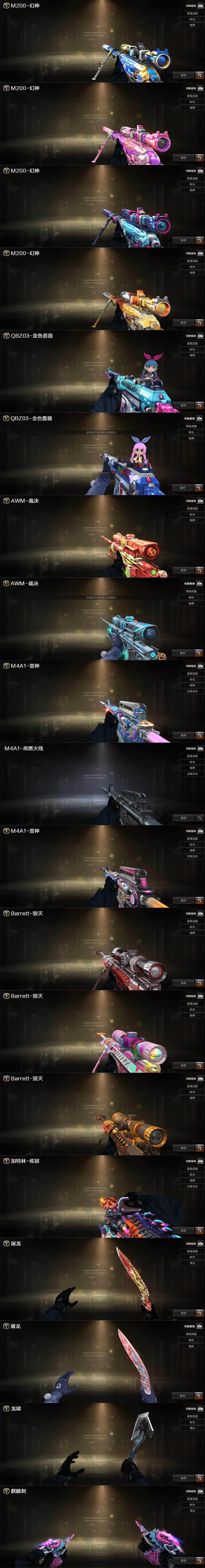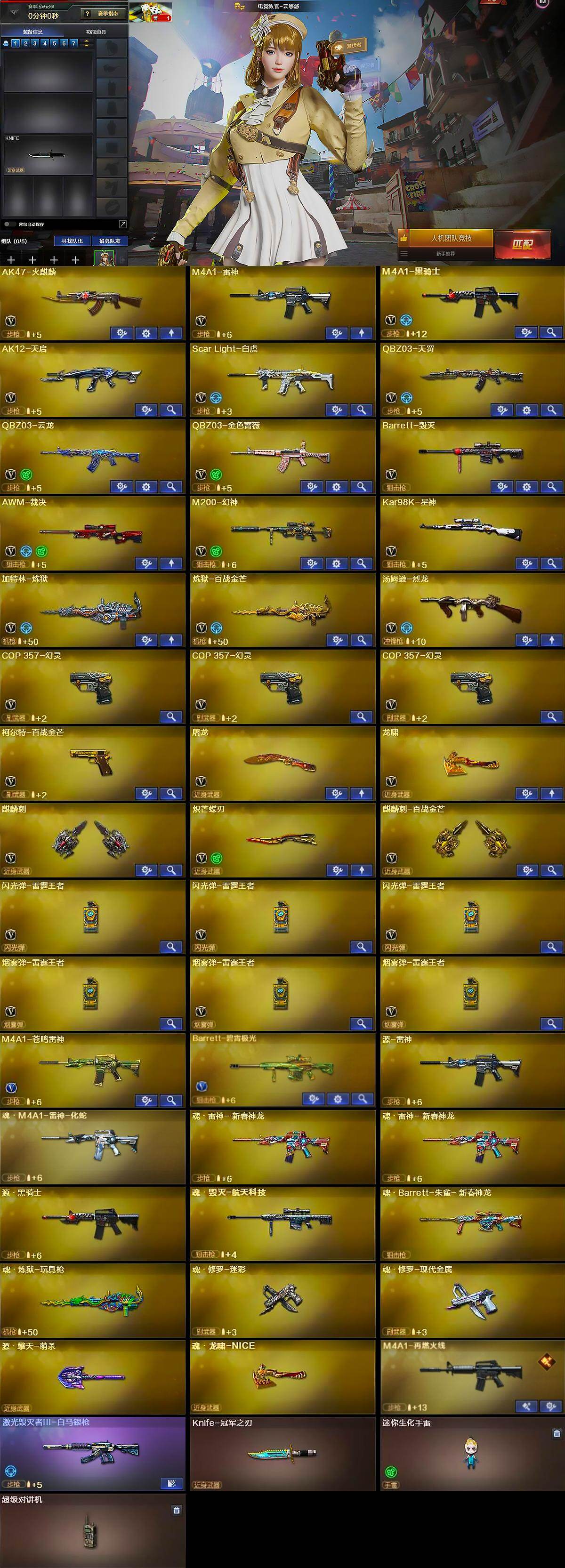 【英雄级武器】:AK47-火麒麟,M4A1-雷神,M4A1-黑骑士,AK12-天启,Scar Light-白虎,QBZ03-天罚,QBZ03-云龙,QBZ03-金色蔷薇,Barrett-毁灭,AWM-裁决,M200-幻神,Kar98K-星神,加特林-炼狱,炼狱-百战金芒,汤姆逊-烈龙,COP 357-幻灵*3,柯尔特-百战金芒,屠龙,龙啸,麒麟刺,炽芒蝶刃,麒麟刺-百战金芒,闪光弹-雷霆王者-觉醒版*3,烟雾弹-雷霆王者-觉醒版*3,M4A1-苍鸣雷神,Barrett-碧霄极光