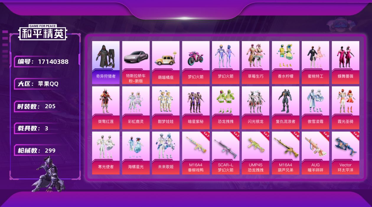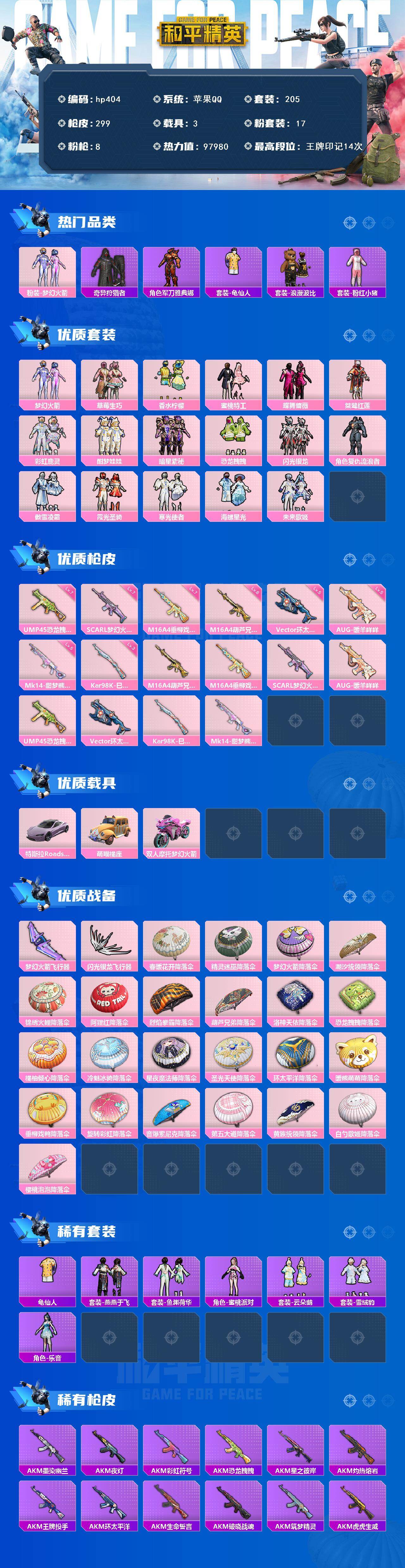 [17140388]苹果 手Q-17粉装-8特效枪-3载具-2粉色飞行器-97980热力值-14王牌印记-205套装-299枪皮 【热门品类】:粉装-梦幻火箭,套装-奇异狩猎者,角色-军刀雅典娜,套装-龟仙人,套装-浪漫波比,套装-粉红小猪 【粉色套装】:粉装-梦幻火箭,粉装-草莓生巧,粉装-香水柠檬,粉装-蜜桃特工,粉装-蝶舞蔷薇,粉装-桀骜红莲,粉装-彩虹鹿灵,粉装-酣梦娃娃,粉装-暗星紫秘,粉装-恐龙拽拽,粉装-闪光银龙,角色-复仇流浪者,粉装-傲雪凌霜,粉装-霞光圣骑,粉装-寒光使者,粉装-海螺星光,粉装-未来歌姬 【粉色枪皮等级】:M16A4-葫芦兄弟(六级),M16A4-垂柳戏鸭(七级),SCAR-L-梦幻火箭(七级),AUG-暖羊咩咩(五级),UMP45-恐龙拽拽(七级),Vector-环太平洋(五级),Kar98K-巳巳如意(三级),Mk14-甜梦熊击(五级) 【粉色载具】:特斯拉Roadster(沁心粉),萌喵橘座,双人摩托-梦幻火箭 【粉色枪皮】:M16A4-葫芦兄弟,M16A4-垂柳戏鸭,SCAR-L-梦幻火箭,AUG-暖羊咩咩,UMP45-恐龙拽拽,Vector-环太平洋,Kar98K-巳巳如意,Mk14-甜梦熊击 【粉色飞行器】:梦幻火箭飞行器,闪光银龙飞行器 【粉色降落伞】:春暖花开降落伞,精灵迷巫降落伞,梦幻火箭降落伞,潮汐统领降落伞,锦绣火鲤降落伞,阿狸红降落伞,烈焰拳霸降落伞,葫芦兄弟降落伞,洛神天依降落伞,恐龙拽拽降落伞,橘柚倾心降落伞,冷魅冰骑降落伞,星夜魔法师降落伞,圣光天使降落伞,环太平洋降落伞,暖熊萌萌降落伞,垂柳戏鸭降落伞,旋转彩虹降落伞,音爆索尼克降落伞,第五大道降落伞,黄族统领降落伞,白勺歌姬降落伞,樱桃泡泡降落伞 【稀有套装】:套装-龟仙人,套装-燕燕于飞,套装-鱼渊荷华,角色-蜜桃派对,套装-云朵鹅,套装-雪绒豹,角色-乐音 【稀有枪皮】:AKM-墨染幽兰,AKM-夜灯,AKM-彩虹符号,AKM-恐龙拽拽,AKM-星之彼岸,AKM-灼热熔岩,AKM-王牌投手,AKM-环太平洋,AKM-生命誓言,AKM-破晓战魂,AKM-筑梦精灵,AKM-虎虎生威,AKM-霓虹街区,AKM-龙的传人,M16A4-幻世战舞者,M16A4-甜心亚梦,M16A4-红色方程式,M16A4-蓝色火焰,SCAR-L-暗夜玫瑰,SCAR-L-炫彩节奏,SCAR-