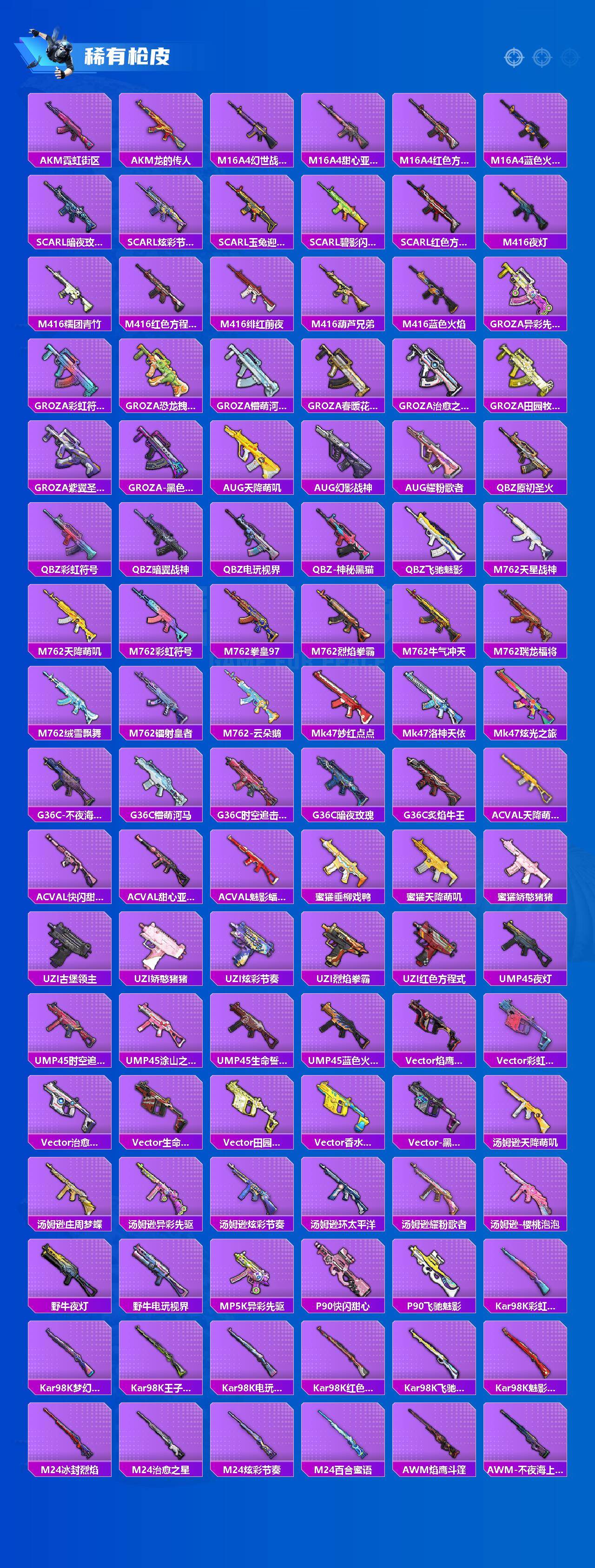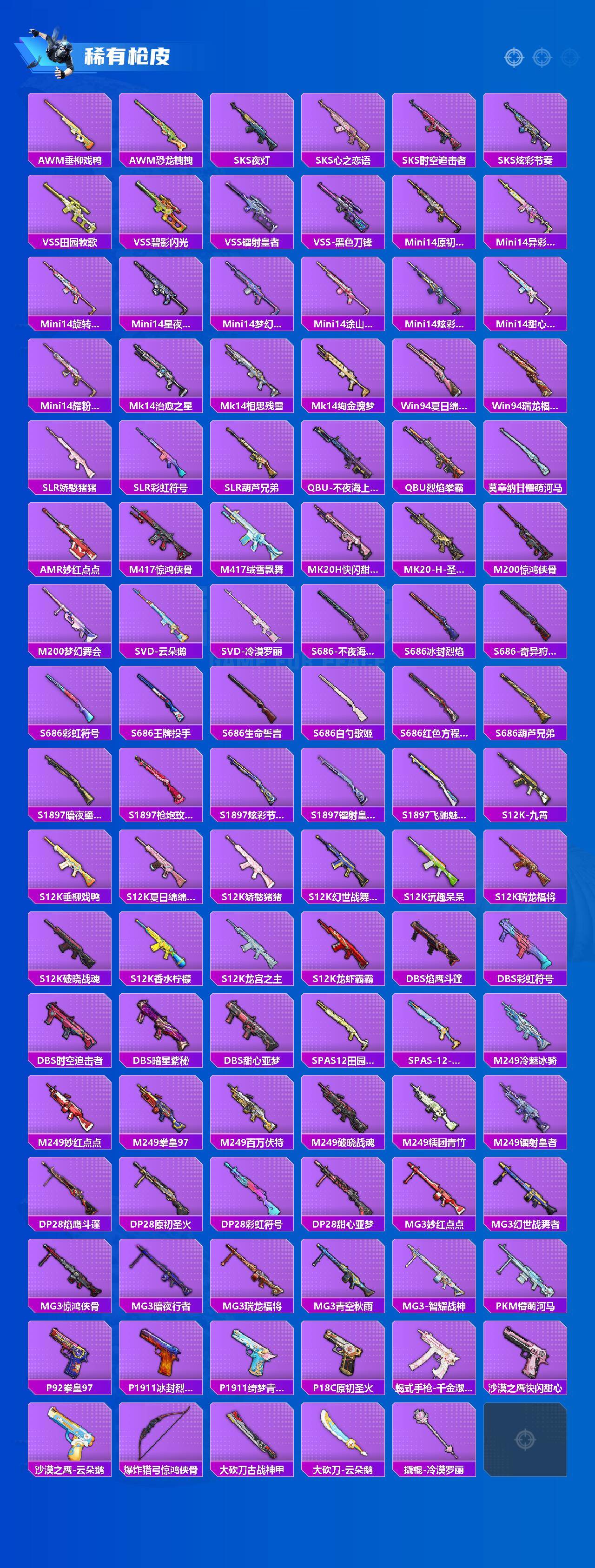 【稀有枪皮】:AKM-墨染幽兰,AKM-夜灯,AKM-彩虹符号,AKM-恐龙拽拽,AKM-星之彼岸,AKM-灼热熔岩,AKM-王牌投手,AKM-环太平洋,AKM-生命誓言,AKM-破晓战魂,AKM-筑梦精灵,AKM-虎虎生威,AKM-霓虹街区,AKM-龙的传人,M16A4-幻世战舞者,M16A4-甜心亚梦,M16A4-红色方程式,M16A4-蓝色火焰,SCAR-L-暗夜玫瑰,SCAR-L-炫彩节奏,SCAR-
