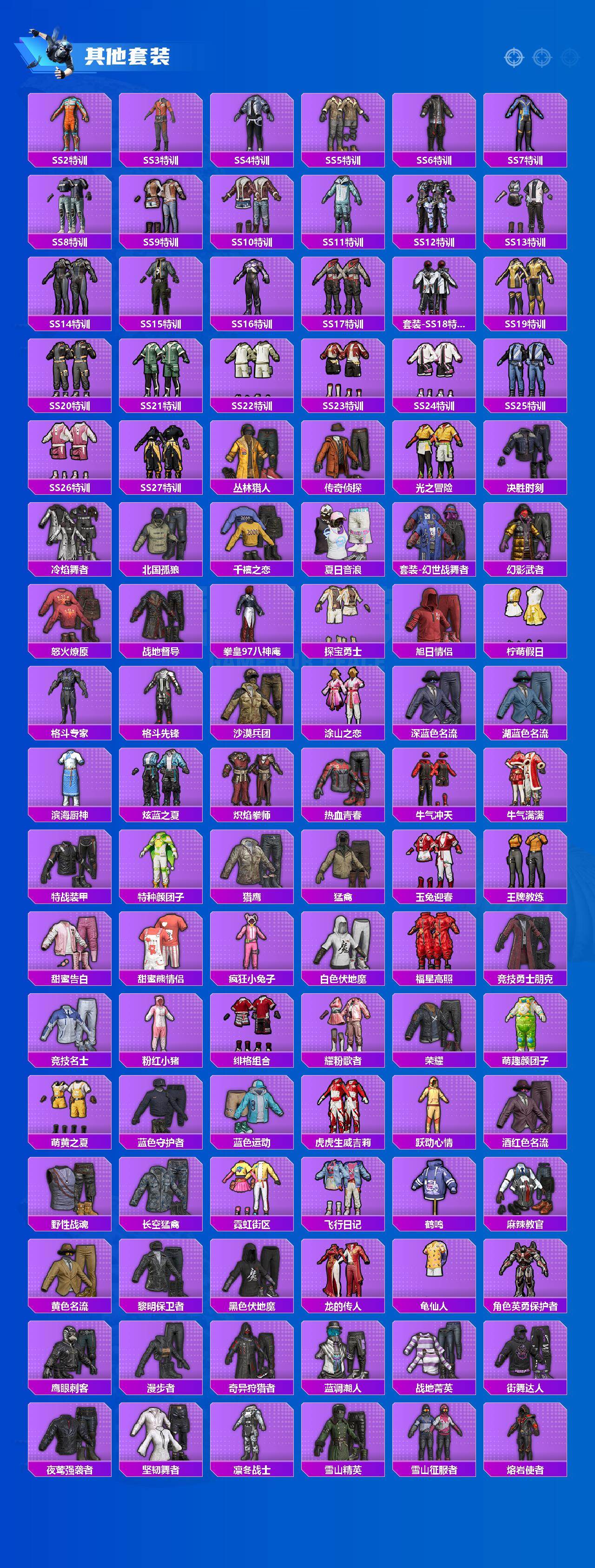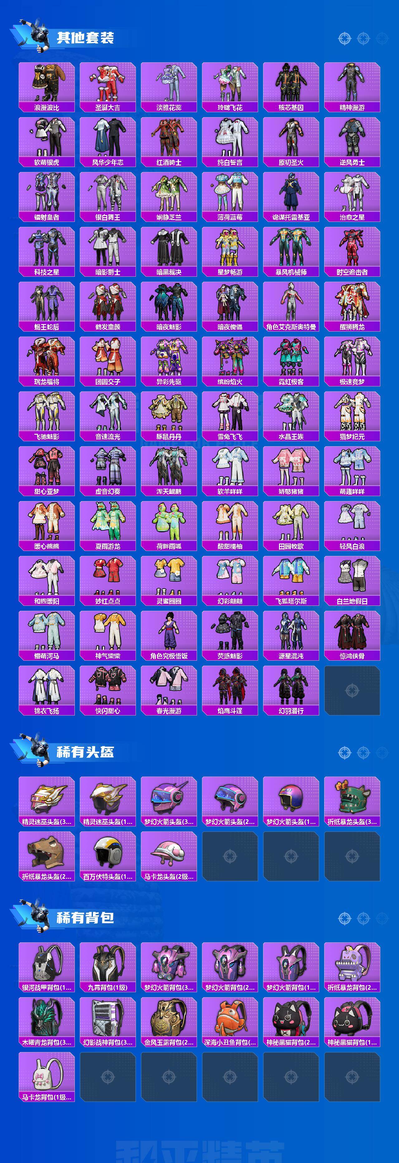 套装-梦幻火箭,套装-奇异狩猎者,套装-浪漫波比,套装-草莓生巧,套装-香水柠檬,套装-蜜桃特工,套装-蝶舞蔷薇,套装-桀骜红莲,套装-彩虹鹿灵,套装-酣梦娃娃,套装-暗星紫秘,恐龙拽拽套装,套装-闪光银龙,角色-复仇流浪者,套装-傲雪凌霜,套装-霞光圣骑,套装-寒光使者,套装-海螺星光,套装-未来歌姬,套装-鹰眼刺客,套装-软萌银虎