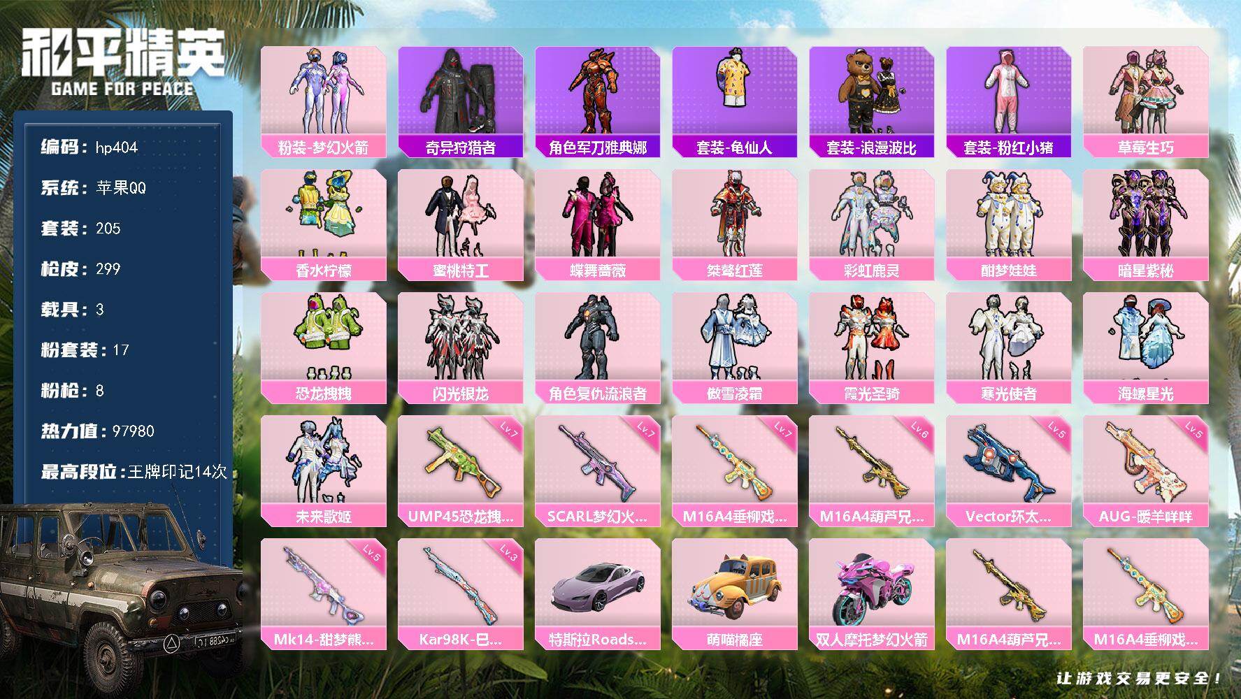[17140388]苹果 手Q-17粉装-8特效枪-3载具-2粉色飞行器-97980热力值-14王牌印记-205套装-299枪皮