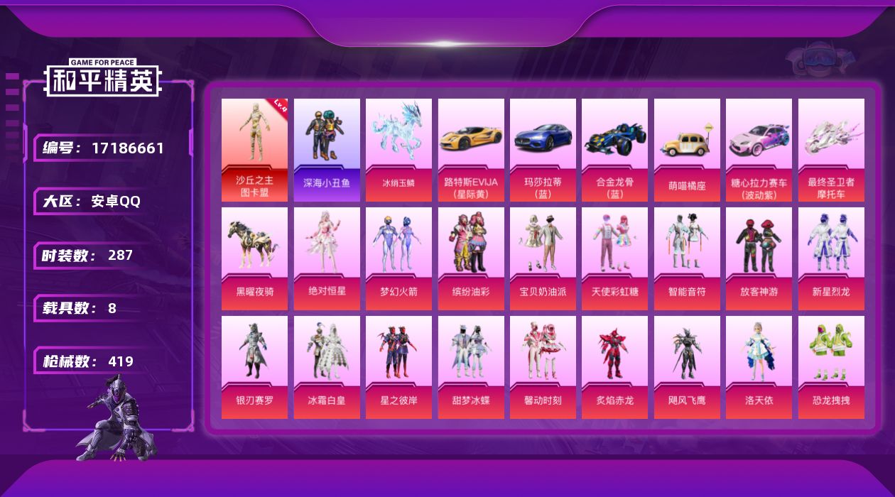 [17186661]安卓 手Q-2神装-34粉装-21特效枪-8载具-19粉色飞行器-160423热力值-21王牌印记-287套装-419枪皮