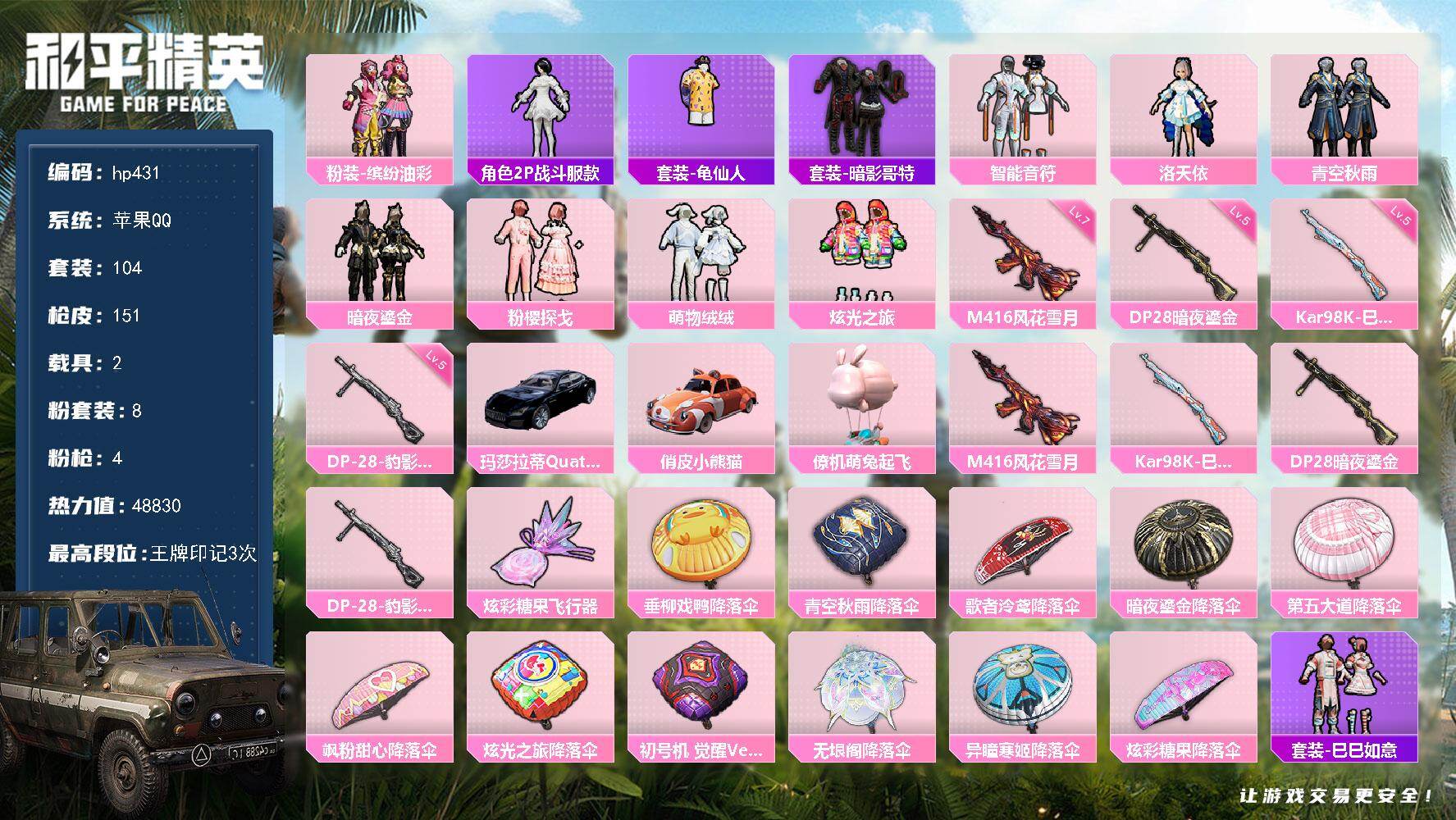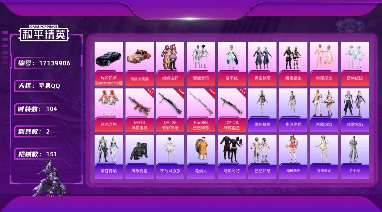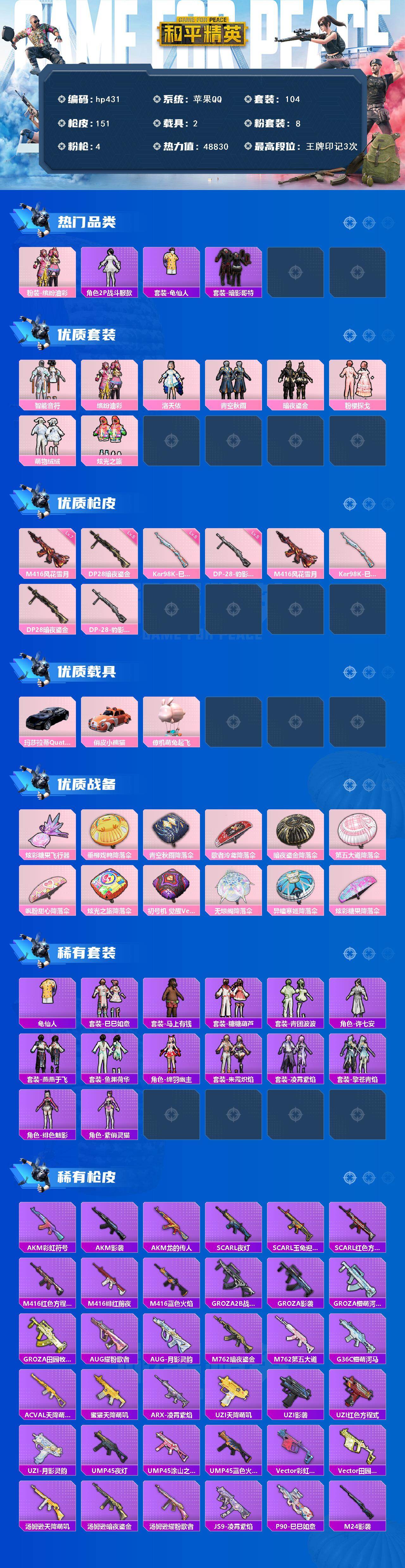 [17139906]苹果 手Q-8粉装-4特效枪-2载具-1粉色飞行器-48830热力值-3王牌印记-104套装-151枪皮 【热门品类】:粉装-缤纷油彩,角色-2P战斗服款,套装-龟仙人,套装-暗影哥特 【粉色套装】:粉装-智能音符,粉装-缤纷油彩,角色-洛天依,粉装-青空秋雨,粉装-暗夜鎏金,粉装-粉樱探戈,粉装-萌物绒绒,粉装-炫光之旅 【粉色枪皮等级】:M416-风花雪月(七级),Kar98K-巳巳如意(五级),DP-28-暗夜鎏金(五级),DP-28-豹影疾电(五级) 【粉色载具】:玛莎拉蒂Quattroporte(夜幕蓝),俏皮小熊猫,僚机-萌兔起飞 【粉色枪皮】:M416-风花雪月,Kar98K-巳巳如意,DP-28-暗夜鎏金,DP-28-豹影疾电 【粉色飞行器】:炫彩糖果飞行器 【粉色降落伞】:垂柳戏鸭降落伞,青空秋雨降落伞,歌者泠鸢降落伞,暗夜鎏金降落伞,第五大道降落伞,飒粉甜心降落伞,炫光之旅降落伞,初号机 觉醒Ver.降落伞,无垠阁降落伞,异瞳寒姬降落伞,炫彩糖果降落伞 【稀有套装】:套装-龟仙人,套装-巳巳如意,套装-炫彩糖果,套装-马上有钱,套装-糖糖葫芦,套装-青团波波,角色-许七安,套装-燕燕于飞,套装-鱼渊荷华,角色-绛羽幽主,套装-朱霞炽焰,套装-凌霄紫焰,套装-擎苍青焰,角色-绯色魅影,角色-紫俏灵猫 【稀有枪皮】:AUG-冰晶雪宝,AKM-彩虹符号,AKM-影袭,AKM-龙的传人,SCAR-L-夜灯,SCAR-L-玉兔迎春,SCAR-L-红色方程式,M416-红色方程式,M416-绯红前夜,M416-蓝色火焰,GROZA-2B战斗服款,GROZA-影袭,GROZA-懵萌河马,GROZA-田园牧歌,AUG-耀粉歌者,AUG-月影灵韵,M762-暗夜鎏金,M762-第五大道,G36C-懵萌河马,AC-VAL-天降萌叽,蜜獾-天降萌叽,ARX-凌霄紫焰,UZI-天降萌叽,UZI-影袭,UZI-红色方程式,UZI-月影灵韵,UMP45-夜灯,UMP45-涂山之恋,UMP45-蓝色火焰,Vector-彩虹符号,Vector-田园牧歌,汤姆逊-天降萌叽,汤姆逊-暗夜鎏金,汤姆逊-耀粉歌者,JS9-凌霄紫焰,P90-巳巳如意,M24-影袭,SKS-未来歌姬,VSS-田园牧歌,Mini14-涂山之恋,Mini14-耀粉歌者,莫辛纳甘-懵萌河马,M417-惊鸿侠骨