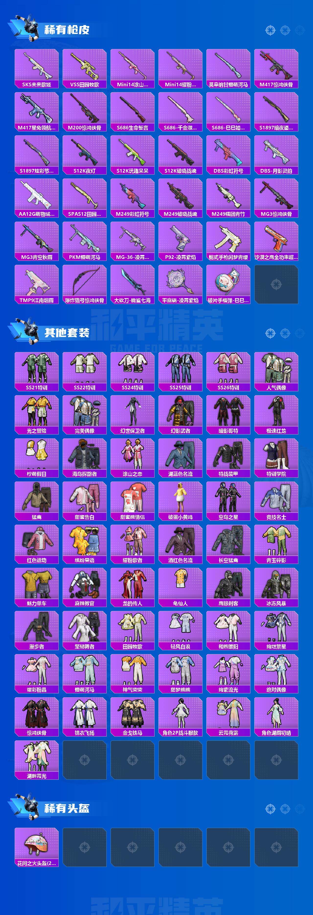 【稀有枪皮】:AUG-冰晶雪宝,AKM-彩虹符号,AKM-影袭,AKM-龙的传人,SCAR-L-夜灯,SCAR-L-玉兔迎春,SCAR-L-红色方程式,M416-红色方程式,M416-绯红前夜,M416-蓝色火焰,GROZA-2B战斗服款,GROZA-影袭,GROZA-懵萌河马,GROZA-田园牧歌,AUG-耀粉歌者,AUG-月影灵韵,M762-暗夜鎏金,M762-第五大道,G36C-懵萌河马,AC-VAL-天降萌叽,蜜獾-天降萌叽,ARX-凌霄紫焰,UZI-天降萌叽,UZI-影袭,UZI-红色方程式,UZI-月影灵韵,UMP45-夜灯,UMP45-涂山之恋,UMP45-蓝色火焰,Vector-彩虹符号,Vector-田园牧歌,汤姆逊-天降萌叽,汤姆逊-暗夜鎏金,汤姆逊-耀粉歌者,JS9-凌霄紫焰,P90-巳巳如意,M24-影袭,SKS-未来歌姬,VSS-田园牧歌,Mini14-涂山之恋,Mini14-耀粉歌者,莫辛纳甘-懵萌河马,M417-惊鸿侠骨