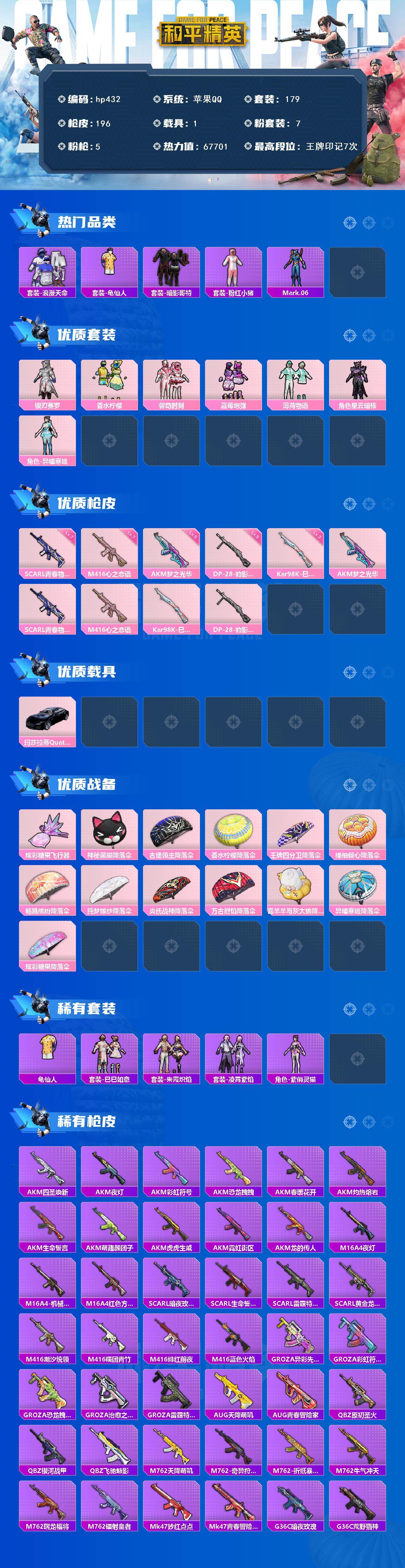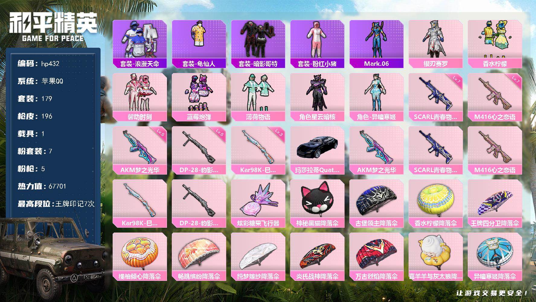[17139676]苹果 手Q-7粉装-5特效枪-1载具-1粉色飞行器-67701热力值-7王牌印记-179套装-196枪皮 【热门品类】:套装-浪漫天命,套装-龟仙人,套装-暗影哥特,套装-粉红小猪,角色-Mark.06 【粉色套装】:粉装-银刃赛罗,粉装-香水柠檬,粉装-馨动时刻,粉装-蓝莓炮弹,粉装-薄荷物语,角色-星云暗核,角色-异瞳寒姬 【粉色枪皮等级】:AKM-梦之光华(五级),SCAR-L-青春物语(七级),M416-心之恋语(七级),Kar98K-巳巳如意(三级),DP-28-豹影疾电(五级) 【粉色载具】:玛莎拉蒂Quattroporte(夜幕蓝) 【粉色枪皮】:AKM-梦之光华,SCAR-L-青春物语,M416-心之恋语,Kar98K-巳巳如意,DP-28-豹影疾电 【粉色飞行器】:炫彩糖果飞行器 【粉色降落伞】:神秘黑猫降落伞,古堡领主降落伞,香水柠檬降落伞,王牌四分卫降落伞,橘柚倾心降落伞,畅跳缤纷降落伞,纯梦嫁纱降落伞,炎氏战神降落伞,万古烈焰降落伞,喜羊羊与灰太狼降落伞,异瞳寒姬降落伞,炫彩糖果降落伞 【稀有套装】:套装-龟仙人,套装-巳巳如意,套装-炫彩糖果,套装-朱霞炽焰,套装-凌霄紫焰,角色-紫俏灵猫 【稀有枪皮】:AKM-四圣焕新,AKM-夜灯,AKM-彩虹符号,AKM-恐龙拽拽,AKM-春暖花开,AKM-灼热熔岩,AKM-生命誓言,AKM-萌趣颜团子,AKM-虎虎生威,AKM-霓虹街区,AKM-龙的传人,M16A4-夜灯,M16A4-机械英豪,M16A4-红色方程式,SCAR-L-暗夜玫瑰,SCAR-L-生命誓言,SCAR-L-雷霆特警,SCAR-L-黄金龙骨,M416-潮汐统领,M416-糯团青竹,M416-绯红前夜,M416-蓝色火焰,GROZA-异彩先驱,GROZA-彩虹符号,GROZA-恐龙拽拽,GROZA-治愈之星,GROZA-雷霆特警,AUG-天降萌叽,AUG-青春冒险家,QBZ-原初圣火,QBZ-银河战甲,QBZ-飞驰魅影,M762-天降萌叽,M762-奇异狩猎者,M762-折纸暴龙,M762-牛气冲天,M762-瑞龙福将,M762-镭射皇者,Mk47-妙红点点,Mk47-青春冒险家,G36C-暗夜玫瑰,G36C-荒野猎神,AC-VAL-天降萌叽,AC-VAL-快闪甜心,AC-VAL-闲梦青缨,蜜獾-天降萌叽,ARX-凌霄紫焰,UZ