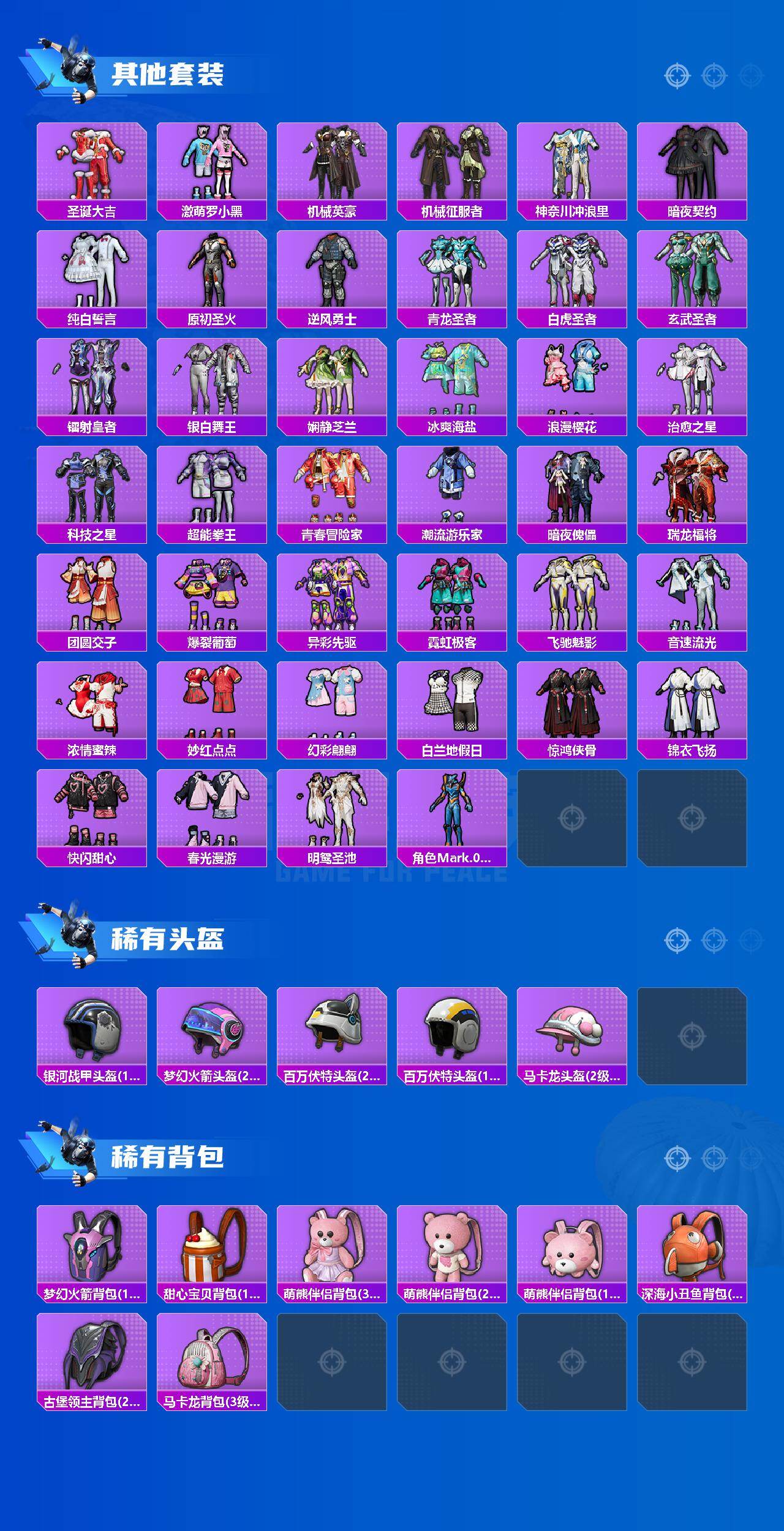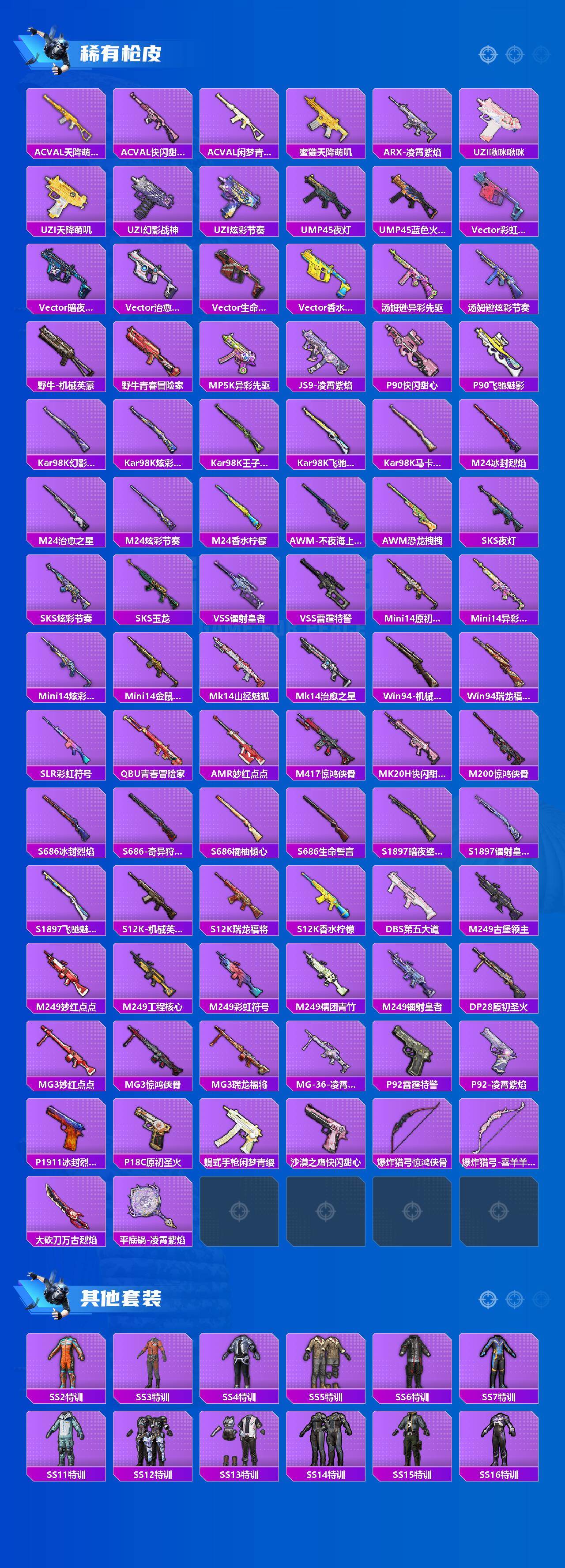 【稀有枪皮】:AKM-四圣焕新,AKM-夜灯,AKM-彩虹符号,AKM-恐龙拽拽,AKM-春暖花开,AKM-灼热熔岩,AKM-生命誓言,AKM-萌趣颜团子,AKM-虎虎生威,AKM-霓虹街区,AKM-龙的传人,M16A4-夜灯,M16A4-机械英豪,M16A4-红色方程式,SCAR-L-暗夜玫瑰,SCAR-L-生命誓言,SCAR-L-雷霆特警,SCAR-L-黄金龙骨,M416-潮汐统领,M416-糯团青竹,M416-绯红前夜,M416-蓝色火焰,GROZA-异彩先驱,GROZA-彩虹符号,GROZA-恐龙拽拽,GROZA-治愈之星,GROZA-雷霆特警,AUG-天降萌叽,AUG-青春冒险家,QBZ-原初圣火,QBZ-银河战甲,QBZ-飞驰魅影,M762-天降萌叽,M762-奇异狩猎者,M762-折纸暴龙,M762-牛气冲天,M762-瑞龙福将,M762-镭射皇者,Mk47-妙红点点,Mk47-青春冒险家,G36C-暗夜玫瑰,G36C-荒野猎神,AC-VAL-天降萌叽,AC-VAL-快闪甜心,AC-VAL-闲梦青缨,蜜獾-天降萌叽,ARX-凌霄紫焰,UZ