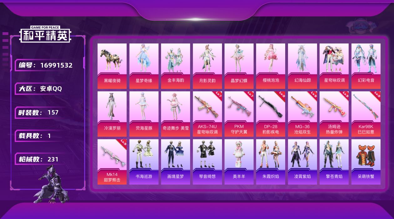 [16991532]安卓 手Q-12粉装-8特效枪-1载具-4粉色飞行器-73549热力值-12王牌印记-157套装-231枪皮