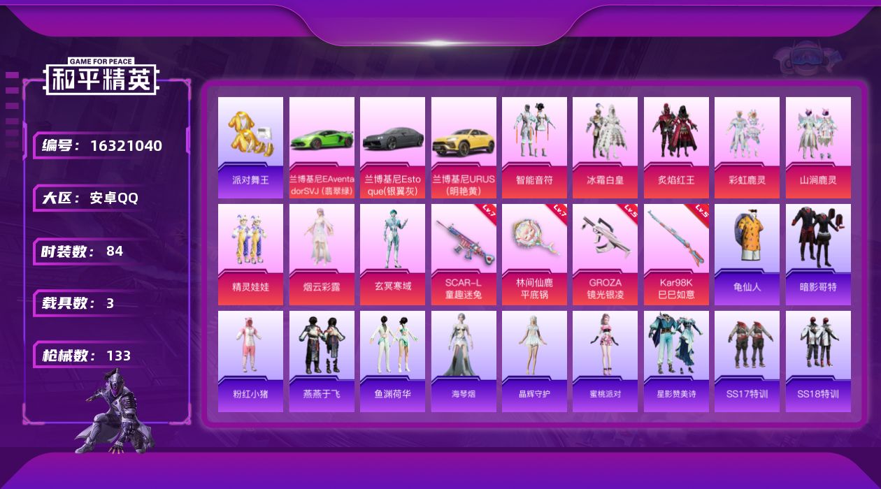 [16321040]安卓 手Q-8粉装-4特效枪-3载具-2粉色飞行器-45996热力值-7王牌印记-84套装-133枪皮 【热门品类】:套装-派对舞王,套装-龟仙人,套装-暗影哥特,套装-粉红小猪 【粉色载具】:兰博基尼Aventador SVJ(翡翠绿),兰博基尼Estoque(银翼灰),兰博基尼URUS(明艳黄) 【粉色套装】:粉装-智能音符,粉装-冰霜白皇,粉装-炙焰红王,粉装-彩虹鹿灵,粉装-山涧鹿灵,粉装-精灵娃娃,角色-烟云彩露,角色-玄冥寒域 【粉色枪皮等级】:SCAR-L-童趣迷兔(七级),GROZA-镜光银凌(五级),Kar98K-巳巳如意(五级),平底锅-林间仙鹿(七级) 【粉色枪皮】:SCAR-L-童趣迷兔,GROZA-镜光银凌,Kar98K-巳巳如意,平底锅-林间仙鹿 【粉色飞行器】:林间仙鹿飞行器,动力核心飞行器 【粉色降落伞】:童趣迷兔降落伞,林间仙鹿降落伞,流星咚咚降落伞,甜心娃娃降落伞,天之羽翼降落伞,恐龙拽拽降落伞,庄周梦蝶降落伞,妙趣可丽降落伞,旋转彩虹降落伞,暗夜鎏金降落伞,飒粉甜心降落伞,未来歌姬降落伞,炫光之旅降落伞,鬼刀降落伞,樱桃泡泡降落伞,幻彩电音降落伞,冷漠罗丽降落伞 【稀有套装】:套装-龟仙人,套装-燕燕于飞,套装-鱼渊荷华,角色-海琴烟,套装-晶辉守护,角色-蜜桃派对,套装-星影赞美诗 【稀有枪皮】:AKM-彩虹符号,AKM-灼热熔岩,AKM-王牌投手,AKM-萝萝小趴兔,AKM-虎虎生威,AKM-龙的传人,M16A4-幻世战舞者,M16A4-甜心亚梦,SCAR-L-玉兔迎春,SCAR-L-甜蜜旋律,M416-暗星紫秘,GROZA-异彩先驱,GROZA-恐龙拽拽,GROZA-懵萌河马,GROZA-林间仙鹿,GROZA-田园牧歌,AUG-天降萌叽,AUG-流星咚咚,AUG-甜蜜菠萝,QBZ-彩虹符号,QBZ-飞驰魅影,M762-天星战神,M762-瑞龙福将,Mk47-林间仙鹿,Mk47-炫光之旅,G36C-懵萌河马,AC-VAL-甜心亚梦,蜜獾-垂柳戏鸭,蜜獾-天降萌叽,蜜獾-娇憨猪猪,UZI-啾咪啾咪,UZI-娇憨猪猪,UMP45-生命誓言,Vector-生命誓言,Vector-田园牧歌,Vector-百合蜜语,Vector-魅影蝠王,汤姆逊-天降萌叽,汤姆逊-异彩先驱,汤姆逊-林间仙鹿,汤姆逊-樱桃泡泡,MP5K-异彩先驱,A