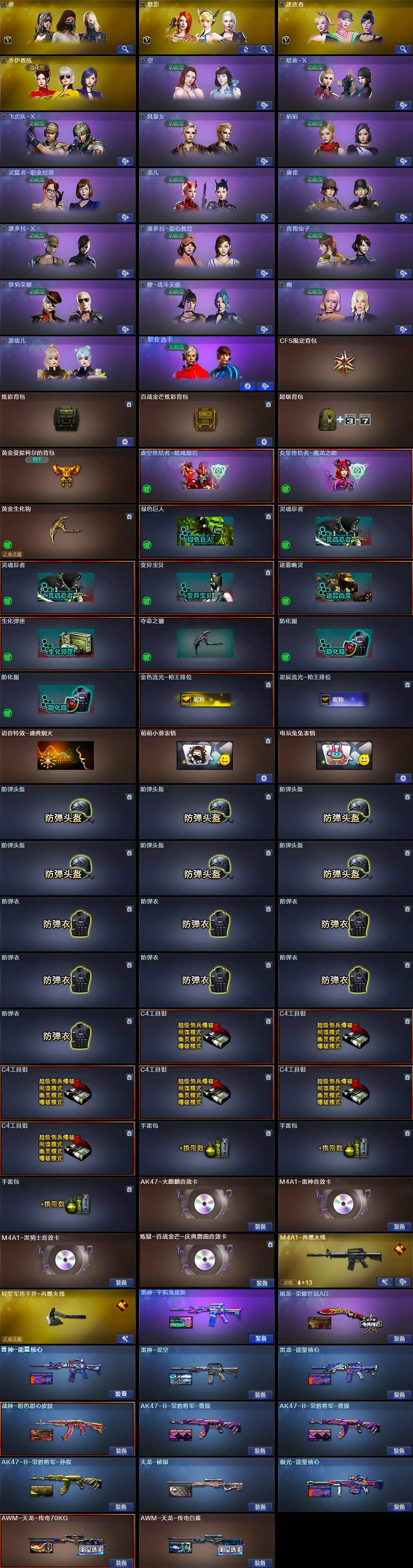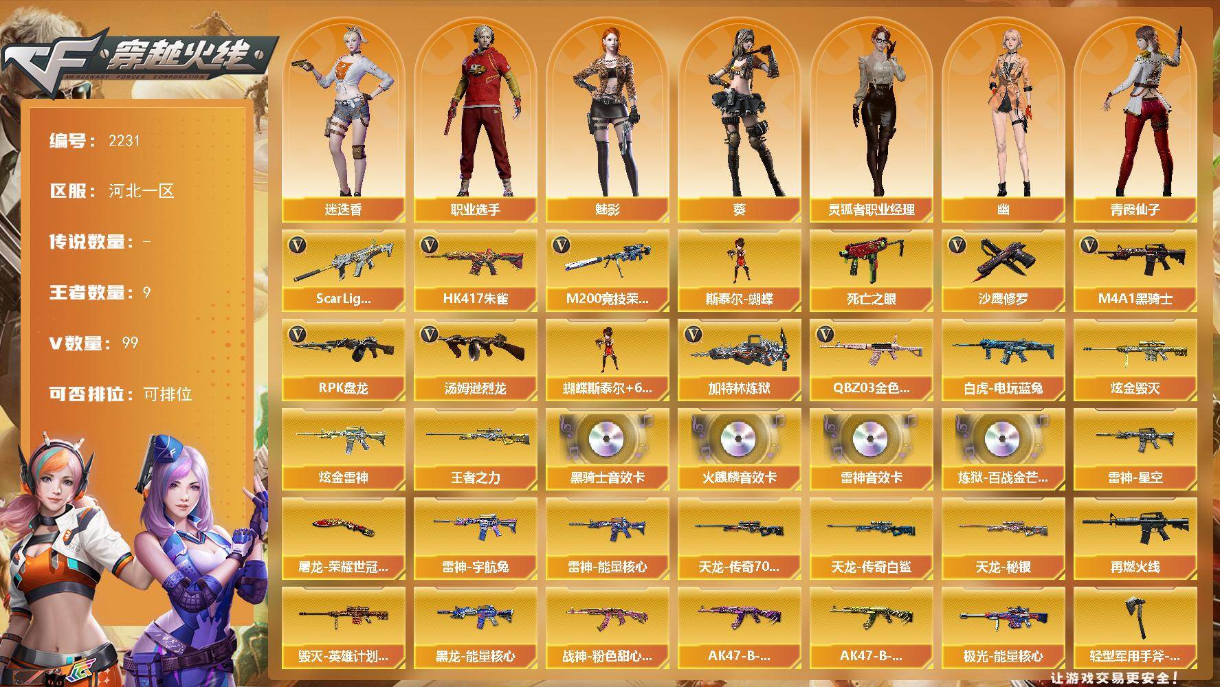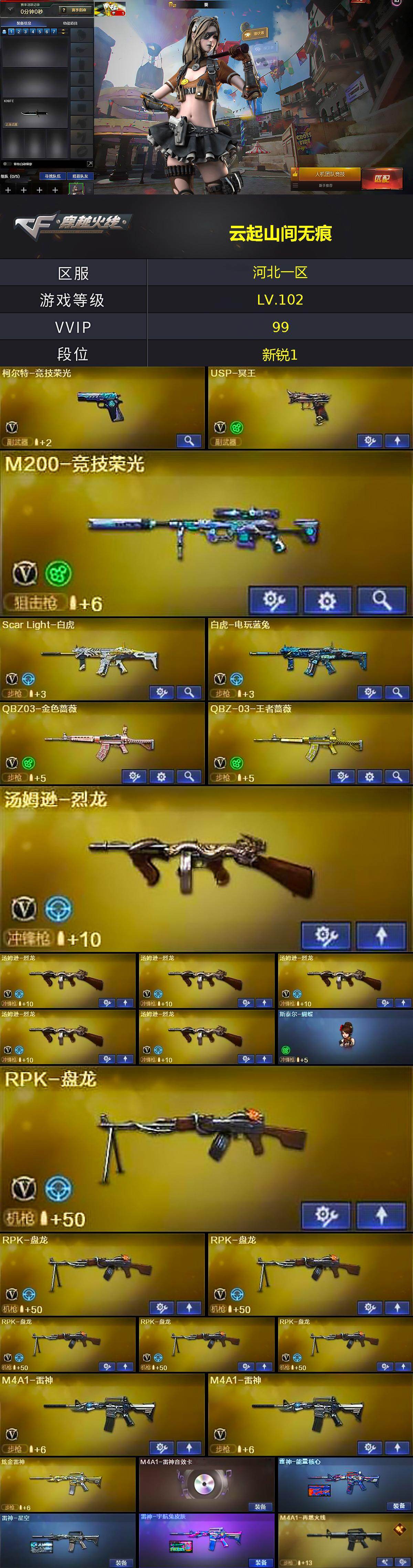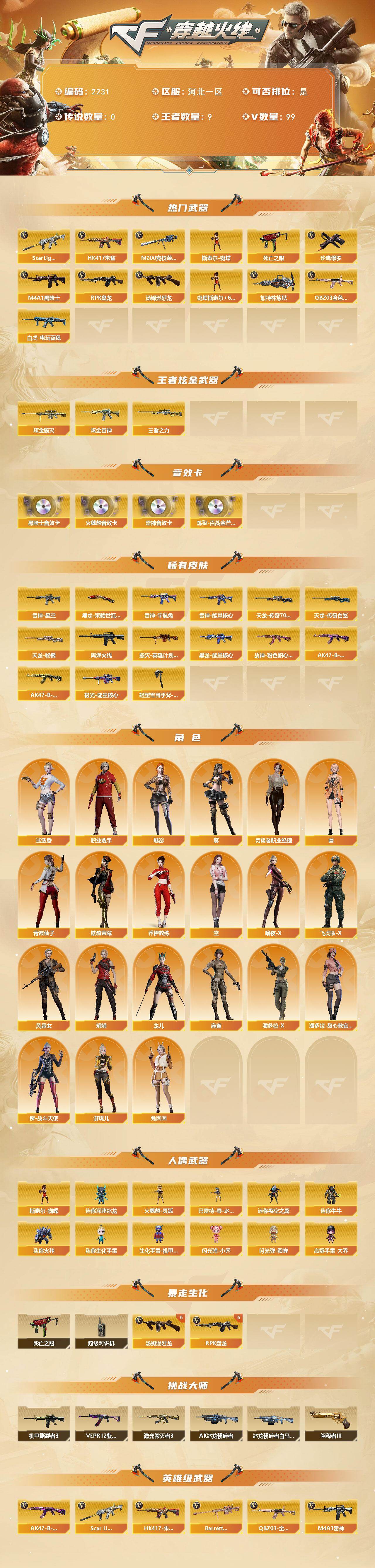 [17036336]河北一区-107V-9王者武器数-2炫金武器数 【热门武器】:QBZ03-金色蔷薇,Scar Light-白虎,HK417-朱雀,M200-竞技荣光,死亡之眼,白虎-电玩蓝兔,M4A1-黑骑士,汤姆逊-烈龙*6,RPK-盘龙*6,加特林-炼狱*3,斯泰尔-蝴蝶,沙鹰-修罗*5 【王者炫金武器】:王者之力,炫金雷神,炫金毁灭 【音效卡】:AK47-火麒麟音效卡,M4A1-雷神音效卡,M4A1-黑骑士音效卡,炼狱-百战金芒-庆典舞曲音效卡 【皮肤】:雷神-能量核心,雷神-星空,雷神-宇航兔皮肤,M4A1-再燃火线,毁灭-英雄计划 皮肤,黑龙-能量核心,战神-粉色甜心皮肤,AK47-B-常胜将军-曹操*2,AK47-B-常胜将军-孙权,天龙-秘银,AWM-天龙-传奇70KG,AWM-天龙-传奇白鲨,极光-能量核心,屠龙-荣耀世冠AG,轻型军用手斧-再燃火线 【角色】:葵,魅影,迷迭香,乔伊教练,空,暗夜-X,飞虎队-X,风暴女,娟娟,灵狐者-职业经理,龙儿,麻雀,潘多拉-X,潘多拉-甜心教官,青霞仙子,铁骑荣耀,兔囡囡,樱-战斗天使,幽,游珑儿,职业选手 【人偶武器】:火麒麟-灵狐,斯泰尔-蝴蝶,巴雷特-零-水下丽影,迷你深渊冰龙*2,迷你裂空之翼*2,迷你牛牛,迷你火种,迷你生化手雷,生化手雷-机甲核心*2,闪光弹-小乔,闪光弹-貂蝉,高爆手雷-大乔 【暴走生化】:死亡之眼,超级对讲机 【挑战大师】:AK47-冰龙粉碎者,冰龙粉碎者-白马银枪,激光毁灭者III,机甲撕裂者III,阐释者III,VEPR-12-紫魔 【英雄级武器】:AK47-火麒麟,M4A1-黑龙*2,M4A1-雷神*2,M4A1-黑骑士,AK47-无影,AK47-黑武士*5,AK47-黑鲨,M4A1-龙血,HK417-朱雀,Scar Light-白虎,无影-神兵利器,黑武士-锦绣游龙,M4A1-玫瑰精灵,QBZ03-金色蔷薇,王者之翼-觉醒版,王者之戮-觉醒版,AK-47-猩红传说,AK47-B-战神,AK47-B-常胜将军,QBZ-03-王者蔷薇-觉醒版,白虎-电玩蓝兔,AWM-天龙,Barrett-毁灭,Barrett-极光,Barrett-朱雀,M200-竞技荣光,Barrett-金色蔷薇,王者之光-觉醒版*2,王者之力-觉醒版,RPK-盘龙*6,加特林-炼狱*3,炼狱-百战金芒,汤姆逊-烈龙*