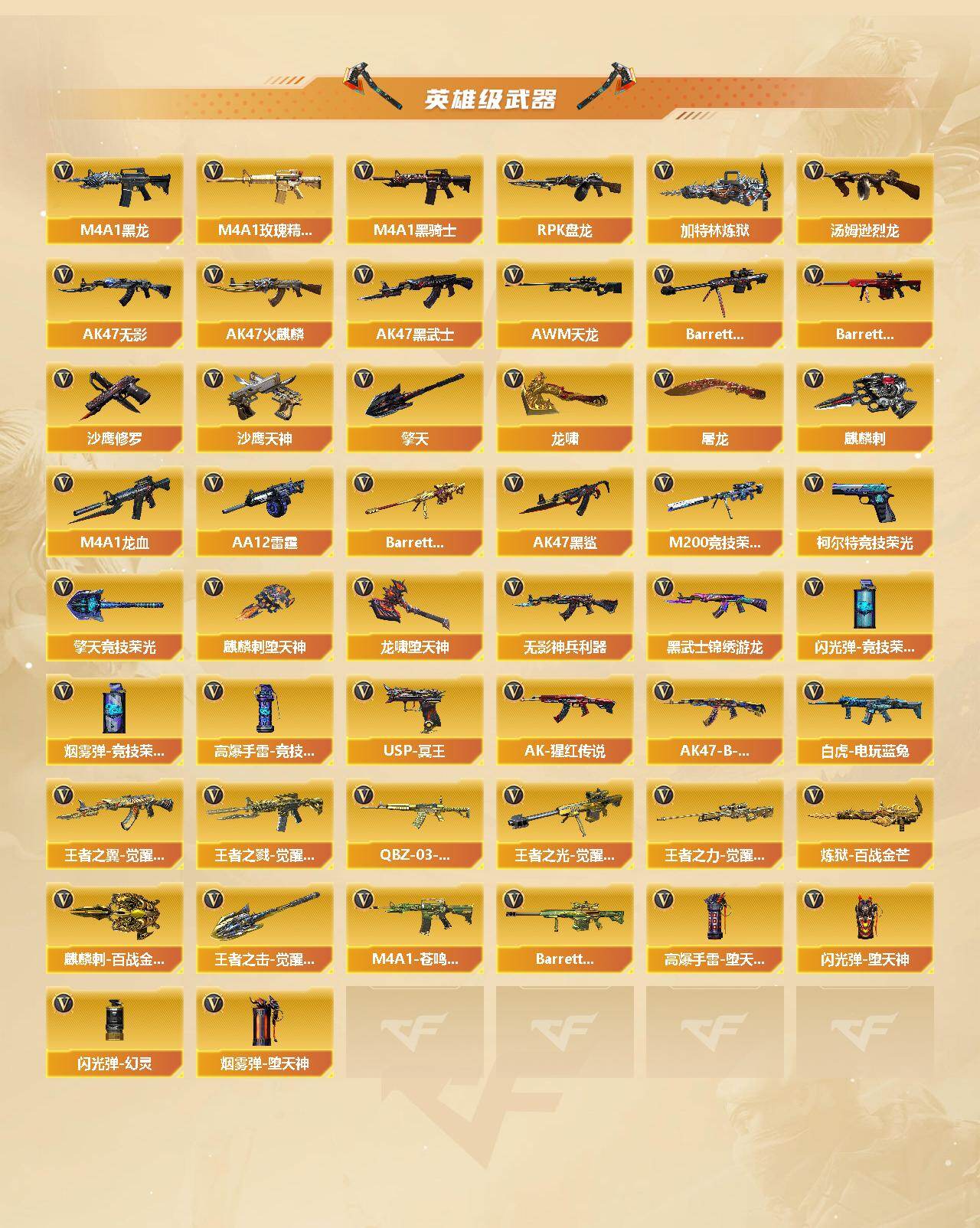 【英雄级武器】:AK47-火麒麟,M4A1-黑龙*2,M4A1-雷神*2,M4A1-黑骑士,AK47-无影,AK47-黑武士*5,AK47-黑鲨,M4A1-龙血,HK417-朱雀,Scar Light-白虎,无影-神兵利器,黑武士-锦绣游龙,M4A1-玫瑰精灵,QBZ03-金色蔷薇,王者之翼-觉醒版,王者之戮-觉醒版,AK-47-猩红传说,AK47-B-战神,AK47-B-常胜将军,QBZ-03-王者蔷薇-觉醒版,白虎-电玩蓝兔,AWM-天龙,Barrett-毁灭,Barrett-极光,Barrett-朱雀,M200-竞技荣光,Barrett-金色蔷薇,王者之光-觉醒版*2,王者之力-觉醒版,RPK-盘龙*6,加特林-炼狱*3,炼狱-百战金芒,汤姆逊-烈龙*