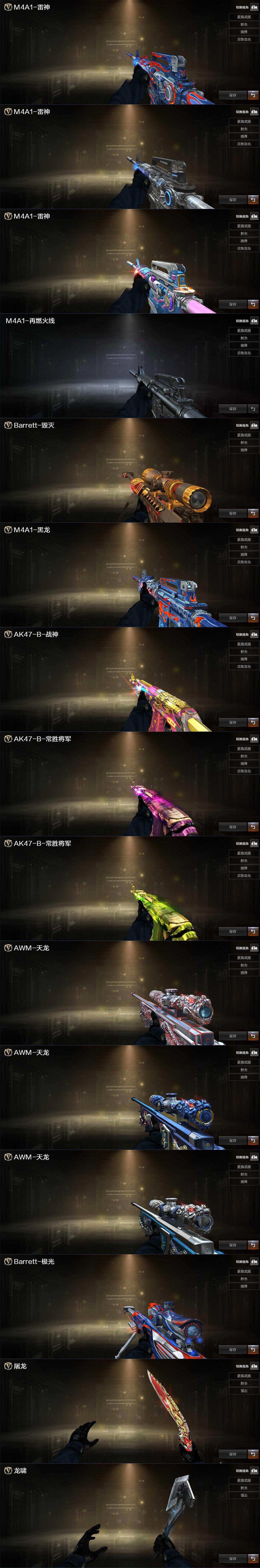 【热门武器】:QBZ03-金色蔷薇,Scar Light-白虎,HK417-朱雀,M200-竞技荣光,死亡之眼,白虎-电玩蓝兔,M4A1-黑骑士,汤姆逊-烈龙*6,RPK-盘龙*6,加特林-炼狱*3,斯泰尔-蝴蝶,沙鹰-修罗*5