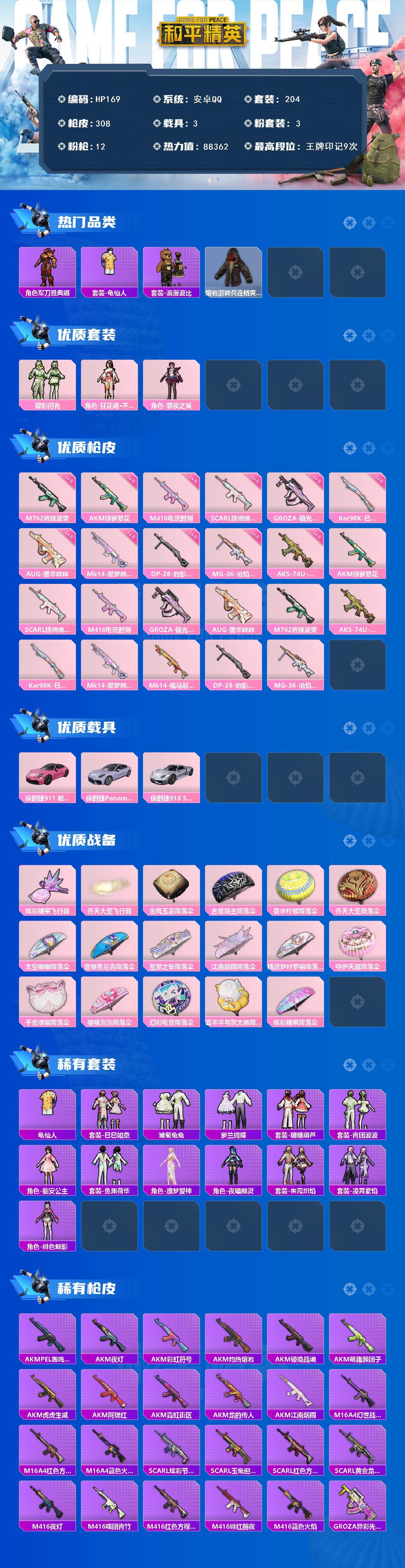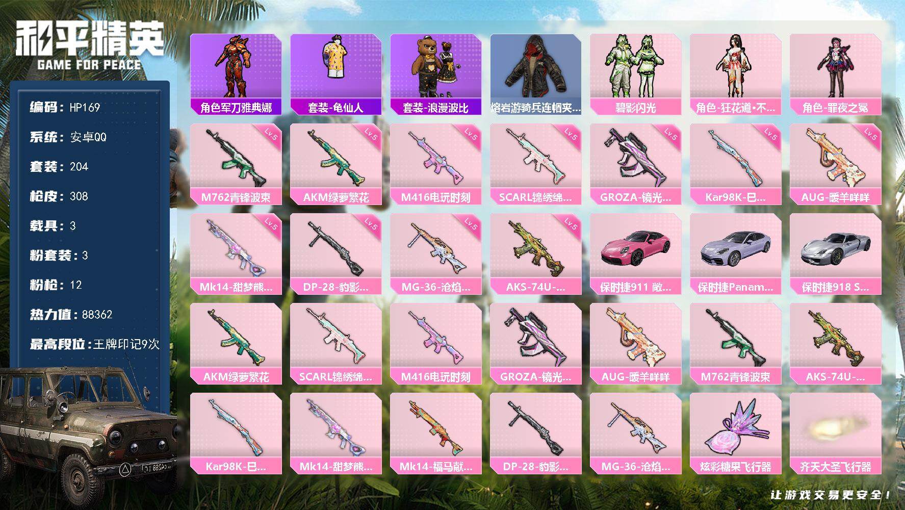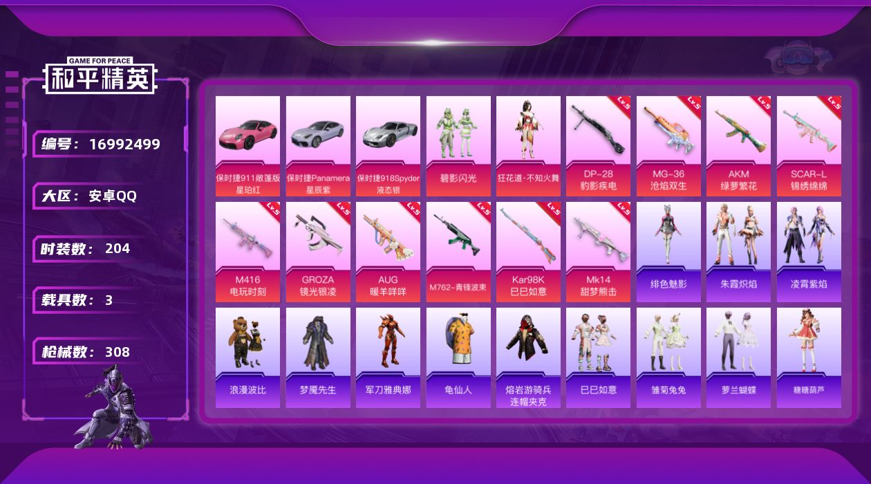 [16992499]安卓 手Q-3粉装-12特效枪-3载具-2粉色飞行器-88362热力值-9王牌印记-204套装-308枪皮 【热门品类】:角色-军刀雅典娜,套装-龟仙人,套装-浪漫波比,熔岩游骑兵连帽夹克 【粉色套装】:粉装-碧影闪光,角色-狂花道·不知火舞,角色-罪夜之冕 【粉色枪皮等级】:AKM-绿萝繁花(五级),SCAR-L-锦绣绵绵(五级),M416-电玩时刻(五级),GROZA-镜光银凌(五级),AUG-暖羊咩咩(五级),M762-青锋波束(五级),AKS-74U-森灵之息(五级),Kar98K-巳巳如意(五级),Mk14-甜梦熊击(五级),DP-28-豹影疾电(五级),MG-36-沧焰双生(五级) 【粉色载具】:保时捷911 敞篷版(星珀红),保时捷Panamera(星辰紫),保时捷918 Spyder(液态银) 【粉色枪皮】:AKM-绿萝繁花,SCAR-L-锦绣绵绵,M416-电玩时刻,GROZA-镜光银凌,AUG-暖羊咩咩,M762-青锋波束,AKS-74U-森灵之息,Kar98K-巳巳如意,Mk14-甜梦熊击,Mk14-福马献瑞,DP-28-豹影疾电,MG-36-沧焰双生 【粉色飞行器】:炫彩糖果飞行器,齐天大圣飞行器 【粉色降落伞】:金风玉露降落伞,古堡领主降落伞,香水柠檬降落伞,齐天大圣降落伞,太空嘟嘟降落伞,音爆索尼克降落伞,圣堂之誓降落伞,江南烟雨降落伞,精灵梦叶罗丽降落伞,守护天翼降落伞,千金淑猫降落伞,樱桃泡泡降落伞,幻彩电音降落伞,喜羊羊与灰太狼降落伞,炫彩糖果降落伞 【稀有套装】:套装-龟仙人,套装-巳巳如意,套装-雪国风尚,套装-炫彩糖果,套装-雏菊兔兔,套装-萝兰蝴蝶,套装-糖糖葫芦,套装-青团波波,角色-临安公主,套装-鱼渊荷华,角色-瑰梦爱神,角色-夜瞳黯灵,套装-朱霞炽焰,套装-凌霄紫焰,角色-绯色魅影 【稀有枪皮】:AUG-冰晶雪宝,AKM-PEL轰鸣竞梦者,AKM-夜灯,AKM-彩虹符号,AKM-江南烟雨,AKM-灼热熔岩,AKM-破晓战魂,AKM-萌趣颜团子,AKM-虎虎生威,AKM-阿狸红,AKM-霓虹街区,AKM-龙的传人,M16A4-幻世战舞者,M16A4-红色方程式,M16A4-蓝色火焰,SCAR-L-炫彩节奏,SCAR-L-玉兔迎春,SCAR-L-红色方程式,SCAR-L-黄金龙骨,M416-夜灯,M416-糯团青竹,M