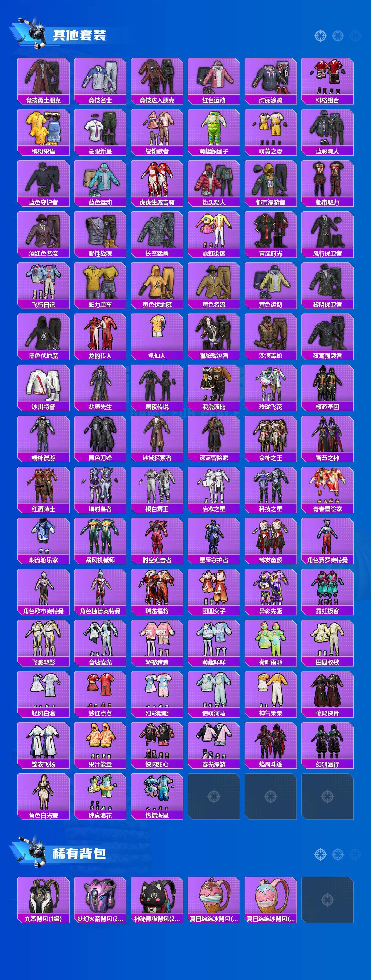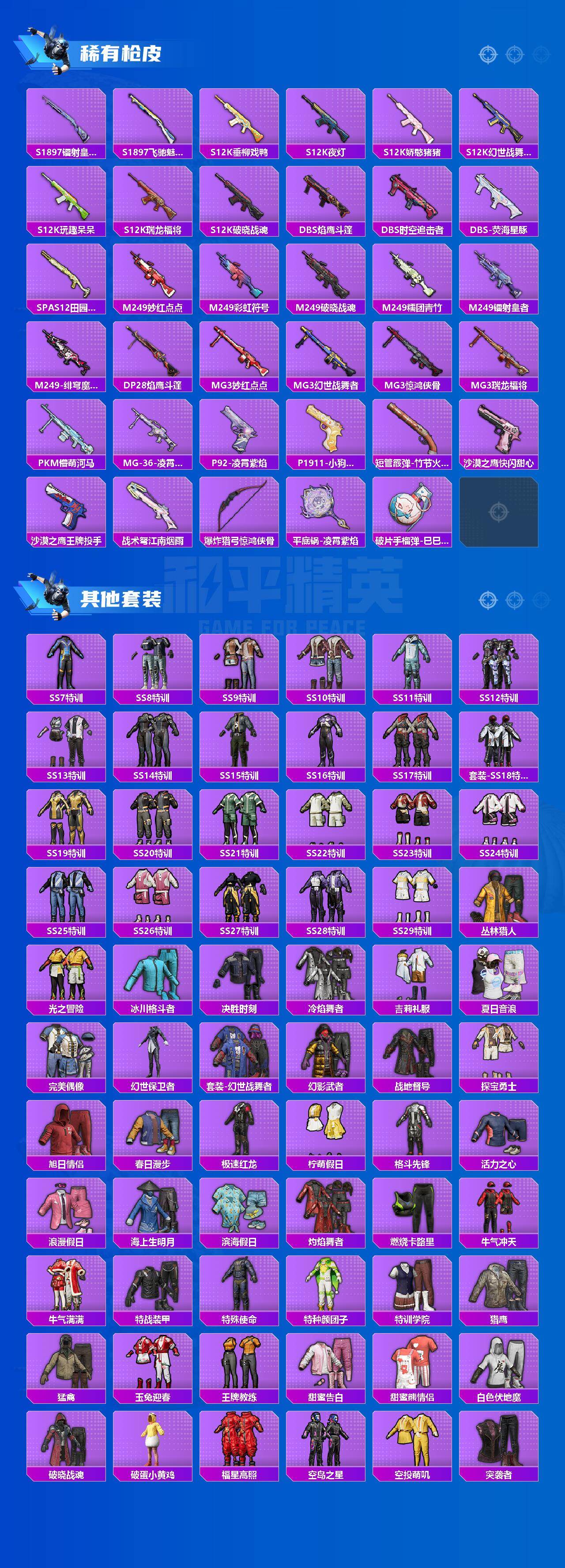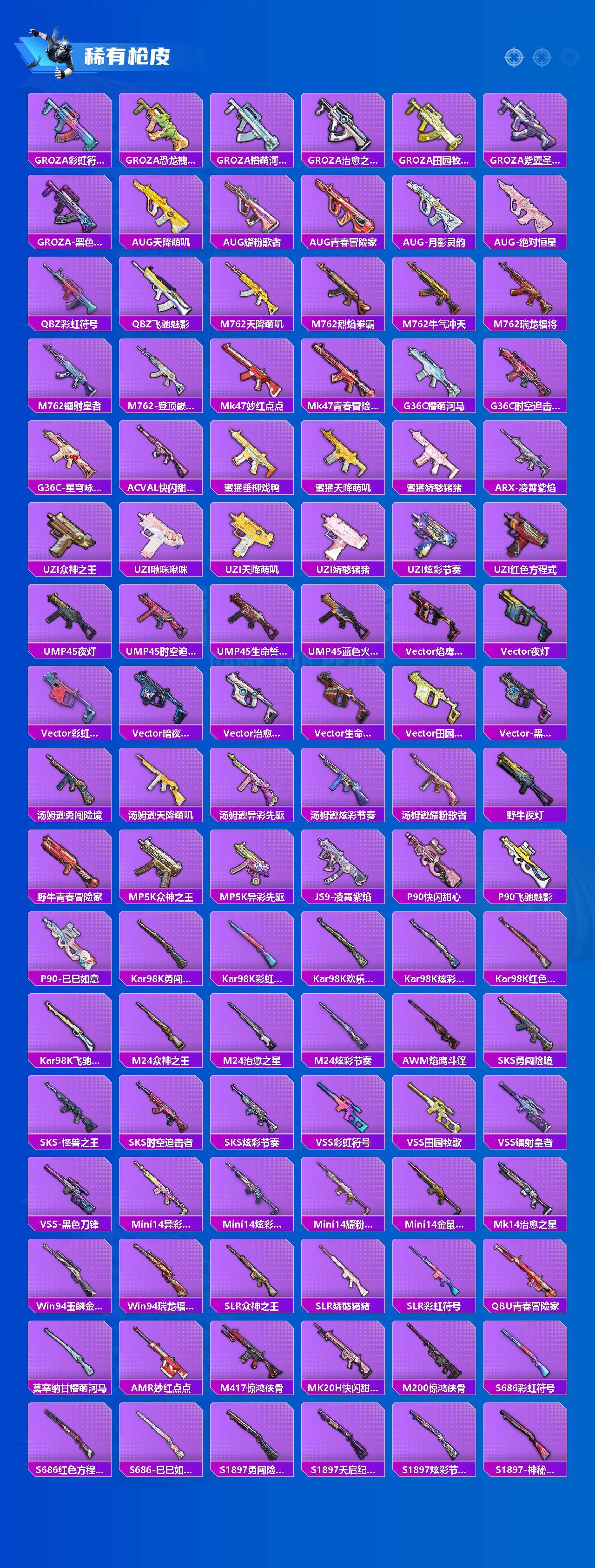 【稀有枪皮】:AUG-冰晶雪宝,AKM-PEL轰鸣竞梦者,AKM-夜灯,AKM-彩虹符号,AKM-江南烟雨,AKM-灼热熔岩,AKM-破晓战魂,AKM-萌趣颜团子,AKM-虎虎生威,AKM-阿狸红,AKM-霓虹街区,AKM-龙的传人,M16A4-幻世战舞者,M16A4-红色方程式,M16A4-蓝色火焰,SCAR-L-炫彩节奏,SCAR-L-玉兔迎春,SCAR-L-红色方程式,SCAR-L-黄金龙骨,M416-夜灯,M416-糯团青竹,M