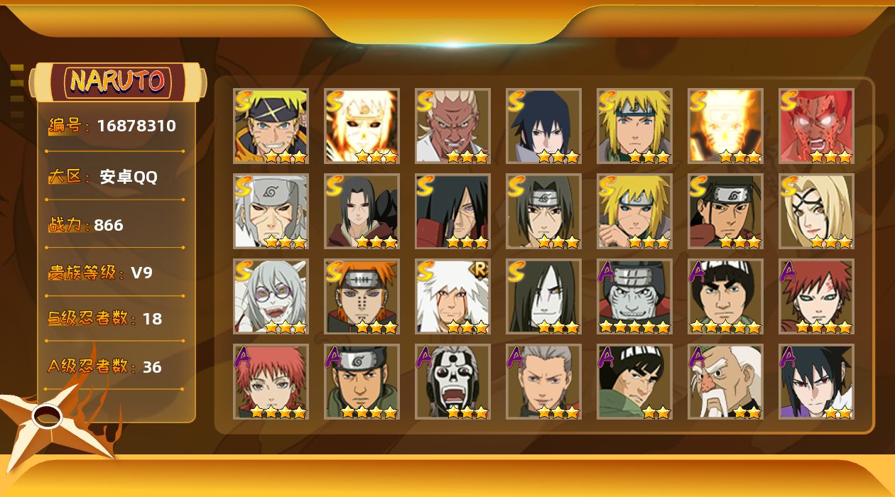 【S级忍者】:波风水门「秽土转生」(3星),千手扉间「秽土转生」(3星),宇智波鼬「秽土转生」(3星),宇智波斑「秽土转生」(3星),艾「忍界大战」(3星),宇智波鼬「须佐能乎」(3星),自来也「舞之豪杰」(3星),大蛇丸(3星),纲手「百豪」(3星),千手柱间(3星),波风水门(3星),药师兜「仙人模式」(3星),漩涡鸣人「九喇嘛连结」(3星),迈特凯「死门」(3星),佩恩「天道」(3星),宇智波佐助「永恒万花筒」(3星),波风水门「九喇嘛连结」(3星),漩涡鸣人·宇智波佐助(3星)