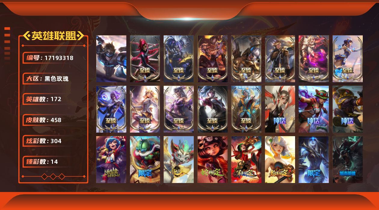 [17193318]黄金段位-172英雄-458皮肤-304炫彩-1终极-17神话-57限定-46传说-102史诗
