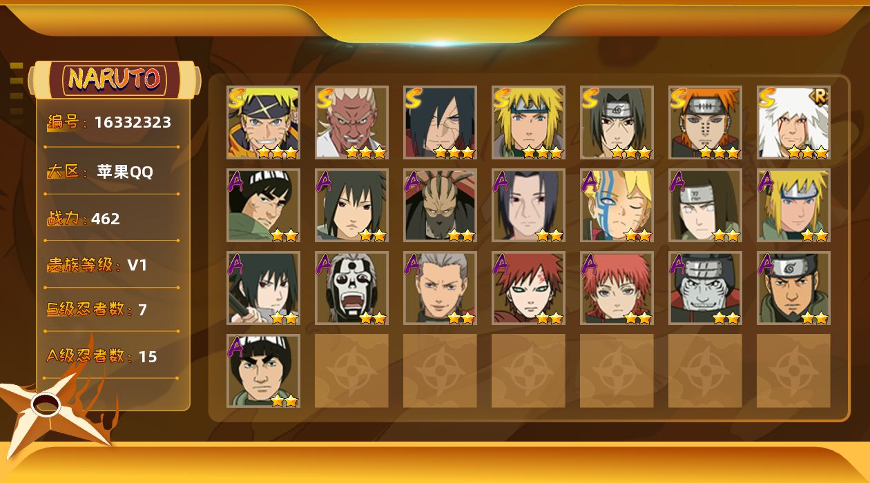 【S级忍者】:宇智波斑「秽土转生·解」(3星),艾「忍界大战」(3星),宇智波鼬「须佐能乎」(3星),自来也「舞之豪杰」(3星),波风水门(3星),佩恩「天道」(3星),漩涡鸣人·宇智波佐助(3星)