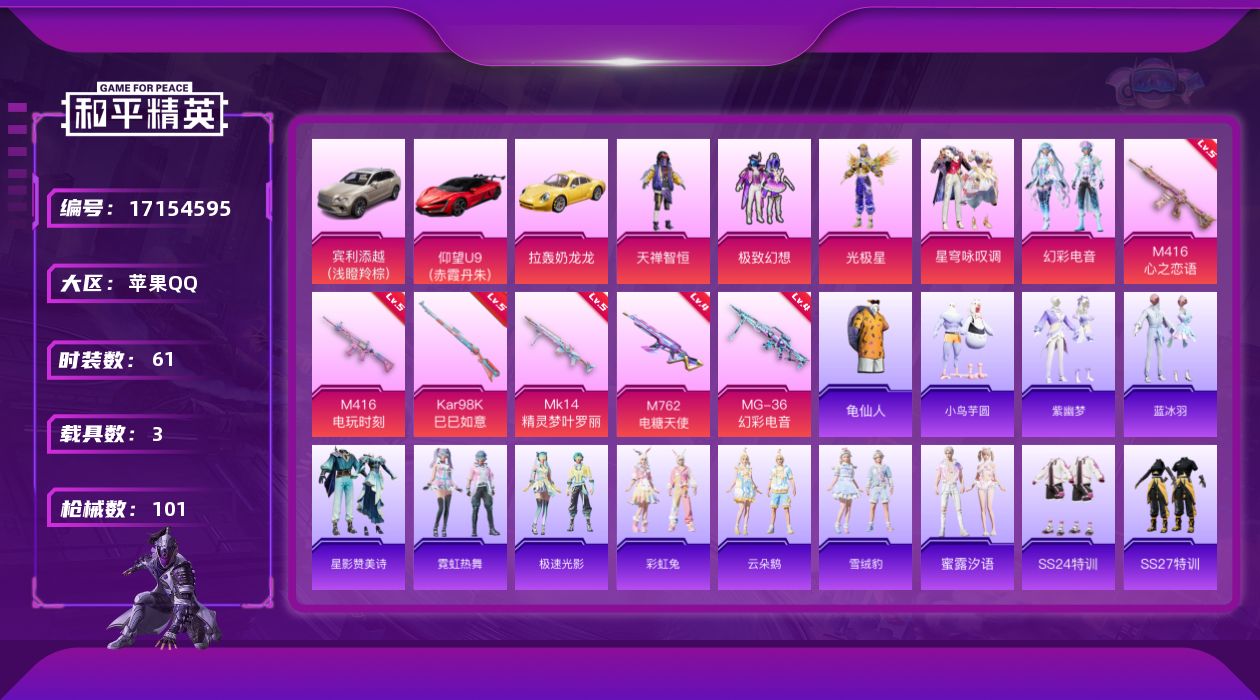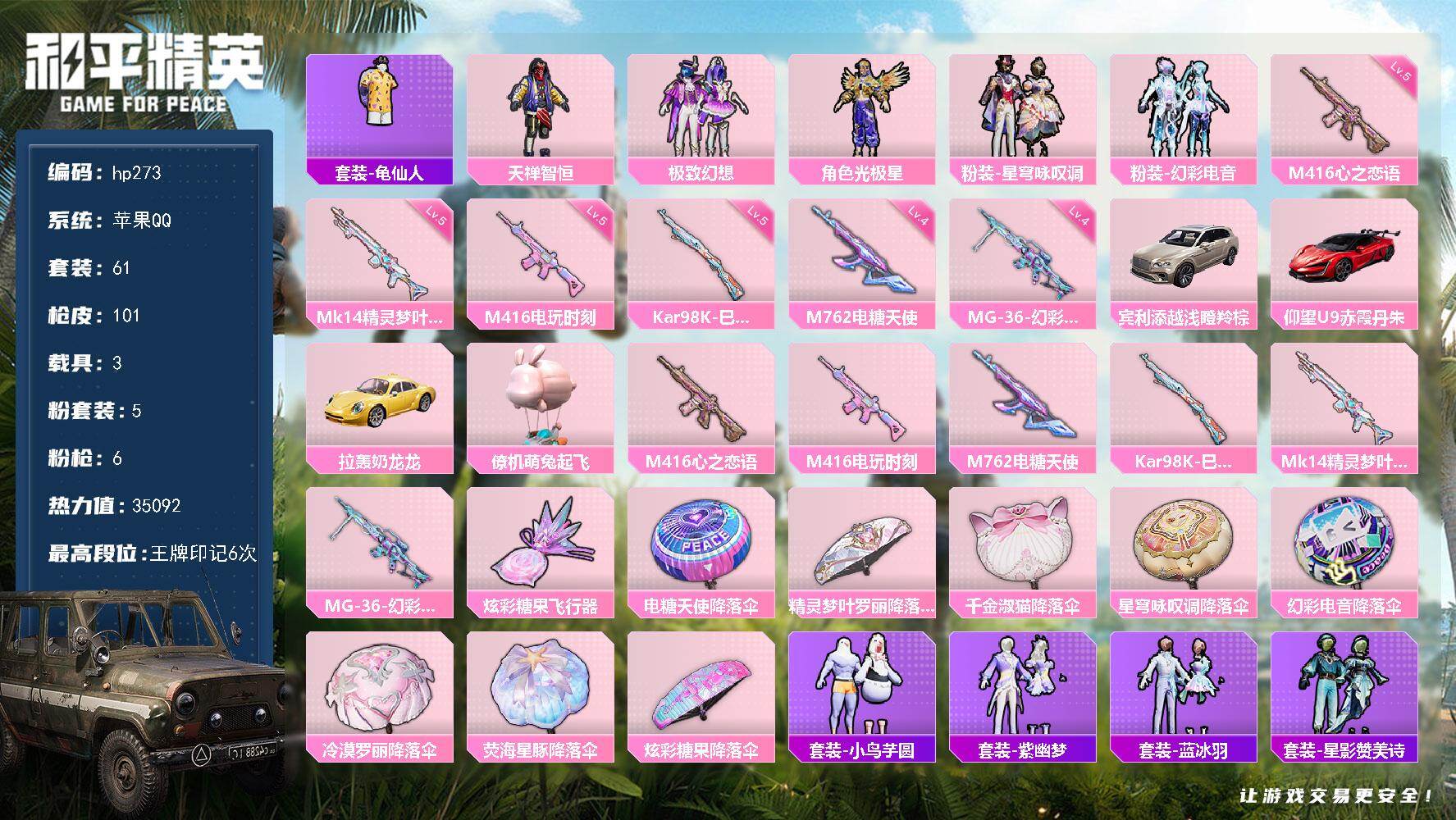 [17154595]苹果 手Q-5粉装-6特效枪-3载具-2粉色飞行器-35092热力值-6王牌印记-61套装-101枪皮
