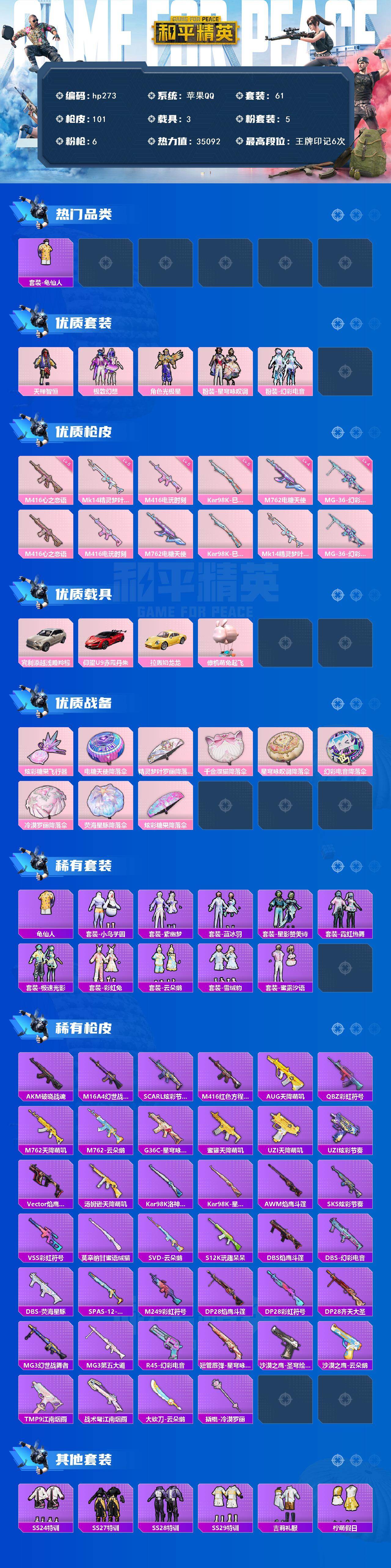[17154595]苹果 手Q-5粉装-6特效枪-3载具-2粉色飞行器-35092热力值-6王牌印记-61套装-101枪皮 【热门品类】:套装-龟仙人 【粉色套装】:粉装-天禅智恒,粉装-极致幻想,角色-光极星,粉装-星穹咏叹调,粉装-幻彩电音 【粉色枪皮等级】:M416-心之恋语(五级),M416-电玩时刻(五级),M762-电糖天使(四级),Kar98K-巳巳如意(五级),Mk14-精灵梦叶罗丽(五级),MG-36-幻彩电音(四级) 【粉色载具】:宾利添越(浅瞪羚棕),仰望U9(赤霞丹朱),拉轰奶龙龙,僚机-萌兔起飞 【粉色枪皮】:M416-心之恋语,M416-电玩时刻,M762-电糖天使,Kar98K-巳巳如意,Mk14-精灵梦叶罗丽,MG-36-幻彩电音 【粉色飞行器】:炫彩糖果飞行器 【粉色降落伞】:电糖天使降落伞,精灵梦叶罗丽降落伞,千金淑猫降落伞,星穹咏叹调降落伞,幻彩电音降落伞,冷漠罗丽降落伞,荧海星豚降落伞,炫彩糖果降落伞 【稀有套装】:套装-龟仙人,套装-小鸟芋圆,套装-炫彩糖果,套装-紫幽梦,套装-蓝冰羽,套装-星影赞美诗,套装-霓虹热舞,套装-极速光影,套装-彩虹兔,套装-云朵鹅,套装-雪绒豹,套装-蜜露汐语 【稀有枪皮】:AUG-冰晶雪宝,AKM-破晓战魂,M16A4-幻世战舞者,SCAR-L-炫彩节奏,M416-红色方程式,AUG-天降萌叽,QBZ-彩虹符号,M762-天降萌叽,M762-云朵鹅,G36C-星穹咏叹调,蜜獾-天降萌叽,UZI-天降萌叽,UZI-炫彩节奏,Vector-焰鹰斗篷,汤姆逊-天降萌叽,Kar98K-洛神天依,Kar98K-星穹咏叹调,AWM-焰鹰斗篷,SKS-炫彩节奏,VSS-彩虹符号,莫辛纳甘-蜜语绒猫,SVD-云朵鹅,S12K-玩趣呆呆,DBS-焰鹰斗篷,DBS-荧海星豚,DBS-幻彩电音,SPAS-12-云朵鹅,M249-彩虹符号,DP-28-焰鹰斗篷,DP-28-彩虹符号,DP-28-齐天大圣,MG3-幻世战舞者,MG3-第五大道,R45-幻彩电音,短管霰弹-星穹咏叹调,沙漠之鹰-云朵鹅,沙漠之鹰-圣穹绘梦,TMP-9-江南烟雨,战术弩-江南烟雨,大砍刀-云朵鹅,撬棍-冷漠罗丽 【其他套装】:套装-SS24特训,套装-SS27特训,套装-SS28特训,套装-SS29特训,套装-吉莉礼服,套装-柠萌假日,套装-玉兔迎春,套装