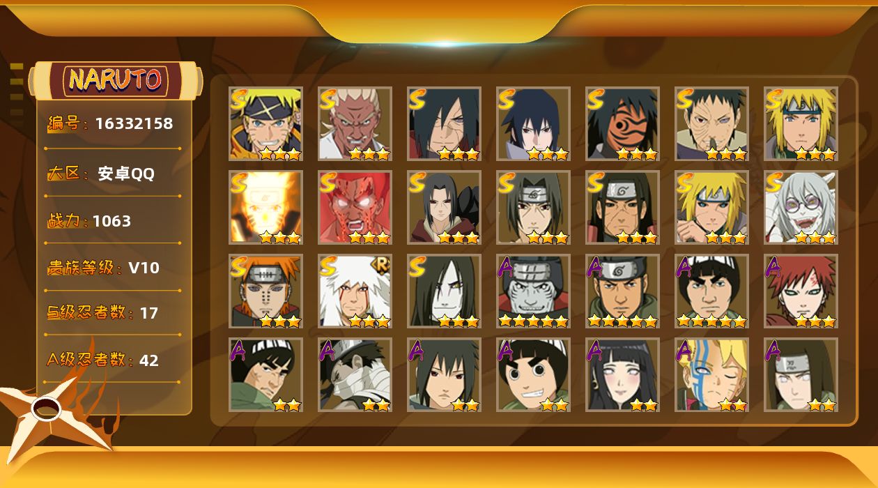 【S级忍者】:波风水门「秽土转生」(3星),千手柱间「秽土转生」(3星),宇智波鼬「秽土转生」(3星),宇智波斑「秽土转生·解」(3星),宇智波带土「忍界大战」(3星),艾「忍界大战」(3星),宇智波鼬「须佐能乎」(3星),自来也「舞之豪杰」(3星),大蛇丸(3星),波风水门(3星),药师兜「仙人模式」(3星),神秘面具男「红夜之刃」(3星),漩涡鸣人「九喇嘛连结」(3星),迈特凯「死门」(3星),佩恩「天道」(3星),宇智波佐助「永恒万花筒」(3星),漩涡鸣人·宇智波佐助(3星)