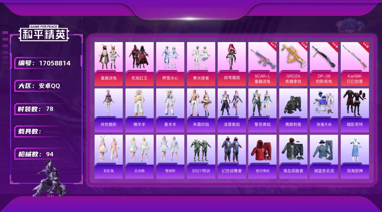 [17058814]安卓 手Q-5粉装-5特效枪-0载具-2粉色飞行器-28922热力值-6王牌印记-78套装-94枪皮 【热门品类】:粉装-童趣迷兔,套装-浪漫天命,套装-暗影哥特 【粉色套装】:粉装-童趣迷兔,粉装-炙焰红王,粉装-霁雪冰心,粉装-寒光使者,角色-绯穹魔姬 【粉色枪皮等级】:SCAR-L-童趣迷兔(七级),GROZA-焦糖拿铁(六级),Kar98K-巳巳如意(五级),DP-28-豹影疾电(五级) 【粉色枪皮】:SCAR-L-童趣迷兔,GROZA-焦糖拿铁,Kar98K-巳巳如意,Mk14-福马献瑞,DP-28-豹影疾电 【粉色飞行器】:炫彩糖果飞行器,童趣迷兔飞行器 【粉色降落伞】:绒雪飘舞降落伞,垂柳戏鸭降落伞,幻彩电音降落伞,荧海星豚降落伞,炫彩糖果降落伞 【稀有套装】:套装-雪国风尚,套装-炫彩糖果,套装-彩虹兔,套装-云朵鹅,套装-雪绒豹,套装-朱霞炽焰,套装-凌霄紫焰,套装-擎苍青焰,玩偶服-懒羊羊,玩偶服-喜羊羊,角色-绯色魅影,角色-云韶流音 【稀有枪皮】:AUG-冰晶雪宝,AKM-破晓战魂,SCAR-L-夜灯,SCAR-L-玉兔迎春,M416-糯团青竹,GROZA-黑色刀锋,AUG-耀粉歌者,QBZ-相思残雪,M762-绒雪飘舞,M762-云朵鹅,Mk47-洛神天依,AC-VAL-天降萌叽,AC-VAL-彩虹甜喵,蜜獾-娇憨猪猪,ARX-凌霄紫焰,UZI-天降萌叽,UZI-娇憨猪猪,UZI-影袭,UMP45-夜灯,汤姆逊-天降萌叽,MP5K-甜蜜誓约,JS9-凌霄紫焰,P90-飞驰魅影,Kar98K-影袭,Kar98K-王子的夏天,AWM-奇迹舞步,Mk14-童趣迷兔,SLR-娇憨猪猪,M417-绒雪飘舞,SVD-云朵鹅,S1897-炫彩节奏,S1897-荧海星豚,S12K-童趣迷兔,S12K-夜灯,S12K-娇憨猪猪,S12K-幻世战舞者,DBS-彩虹甜喵,SPAS-12-云朵鹅,M249-彩虹符号,DP-28-彩虹符号,MG3-幻世战舞者,MG-36-凌霄紫焰,P92-凌霄紫焰,沙漠之鹰-云朵鹅,大砍刀-云朵鹅,平底锅-凌霄紫焰 【其他套装】:套装-SS21特训,套装-幻世战舞者,套装-旭日情侣,套装-暗影哥特,套装-浪漫天命,套装-海岛探路者,套装-湖蓝色名流,套装-滨海厨神,套装-牛气冲天,套装-特训学院,套装-猎鹰,套装-猛禽,套装-玉兔