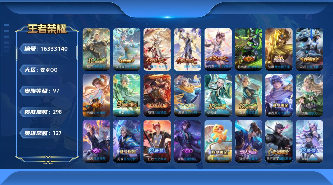 [16333140]夺宝快出、11按键-安卓Q-V7-127英雄-298皮肤-10传说-76史诗 【英雄全皮】:达摩全皮,孙权全皮,空空儿全皮,影全皮 【传说皮肤】:后羿神树通天,公孙离云诺千山,司空震愿照山河定,澜愿照九州拓,云缨幻光神枪,桑启鸣野蒿,孙尚香乘龙问璇玑,马超无双飞将,达摩黄金狮子座,孙尚香末日机甲 【限定皮肤】:蒙犽顽岩魄,大乔绒语心约,虞姬夏日便利店,姜子牙天穹之誓,杨戬破阵退雄兵,狄仁杰阴阳师,赵云皇家上将,庄周高山流水,高渐离玩趣恶龙,钟无艳超时空战士,扁鹊奇幻香踪,元歌云间偶戏,元歌无心,甄姬落雪兰心,马可波罗暗影游猎,马可波罗山海玄木吟,狄仁杰魔术师,狄仁杰万华元夜,达摩星际陆战队,达摩沙漠行僧,项羽海滩派对,老夫子醍醐杖,程咬金演武夺筹,韩信飞衡,兰陵王金庭之子,孙悟空至尊宝,李元芳云中旅人,钟馗驱傩正仪,杨戬潮玩骑兵,干将莫邪胡桃夹子,鬼谷子原初探秘者,鬼谷子五谷丰年,苏烈千军破阵,百里玄策原初追逐者,弈星混沌棋,沈梦溪大漠名商,明世隐疑决卦,裴擒虎李小龙,裴擒虎擒涛扼浪,云中君纤云弄巧,上官婉儿梁祝,嫦娥暖冬兔眠,蒙犽狂想玩偶喵,鲁班大师探海日志,桑启海盐诗旅,暃星界游侠,艾琳流音漫舞,阿古朵江河有灵,张良古海寻踪,蒙犽百解令,高渐离燃音魔法,妲己灵卜魔法,鬼谷子天穹祈灯,伽罗琥珀纪元,孙尚香乘龙问璇玑,百里玄策超元猎域,沈梦溪龙舞盛年,鲁班七号蔬乡物语,李元芳蔬乡物语,刘邦剑破天穹,程咬金群星魔术团,镜青焰无极,周瑜熔金海岸 【年限皮肤】:韩信飞衡,马可波罗山海玄木吟,孙尚香乘龙问璇玑,司空震愿照山河定,澜愿照九州拓 【赛季限定】:弈星混沌棋,明世隐疑决卦,老夫子醍醐杖,鬼谷子原初探秘者,狄仁杰万华元夜,程咬金演武夺筹,钟馗驱傩正仪,苏烈千军破阵,达摩沙漠行僧,兰陵王金庭之子,沈梦溪大漠名商,李元芳云中旅人,桑启海盐诗旅,裴擒虎擒涛扼浪,鲁班大师探海日志,张良古海寻踪,鬼谷子天穹祈灯,刘邦剑破天穹,姜子牙天穹之誓,东皇太一噬灭天穹,太乙真人谧流熔炉,钟馗虚灵犬护,甄姬逆浪荇歌,亚瑟荣光之誓,百里玄策原初追逐者,牛魔星界战将,项羽九幽镇关 【战令限定】:马可波罗暗影游猎,蒙犽狂想玩偶喵,元歌云间偶戏,达摩星际陆战队,钟无艳超时空战士,甄姬落雪兰心,暃星界游侠,嫦娥暖冬兔眠,扁鹊奇幻香踪,杨戬潮玩骑兵,艾琳流音漫舞,高渐离燃音魔法,妲己灵卜魔法,鲁班七