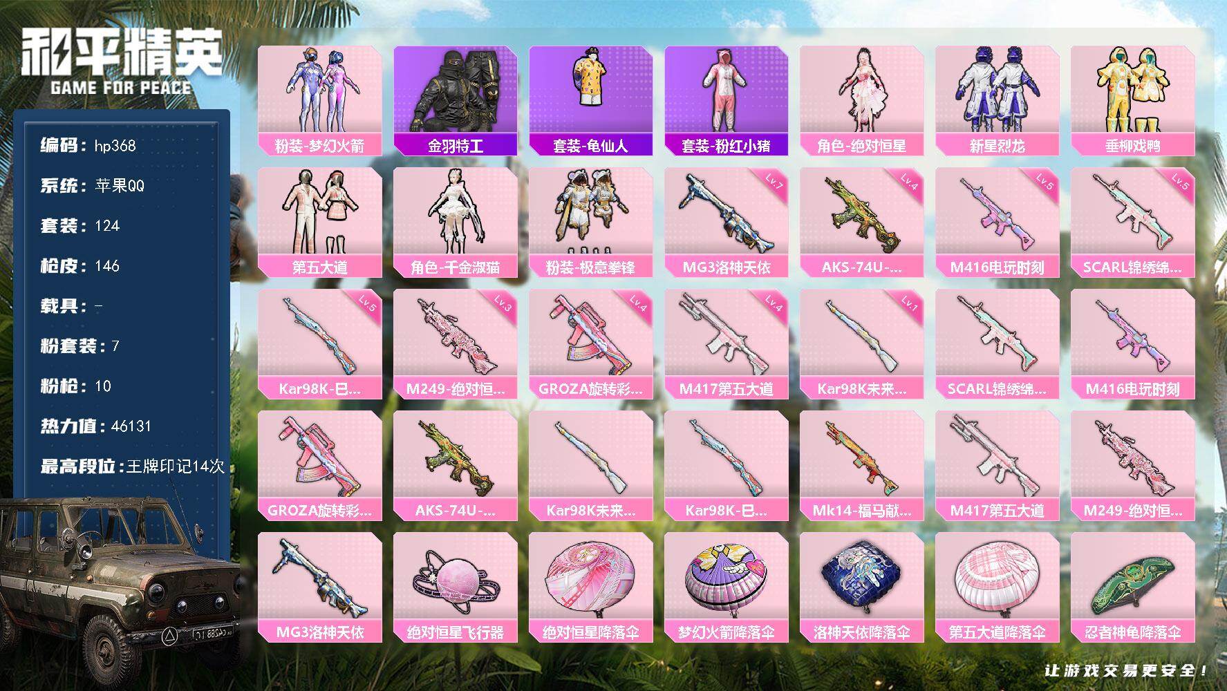 [17058555]苹果 手Q-7粉装-10特效枪-0载具-1粉色飞行器-46131热力值-14王牌印记-124套装-146枪皮