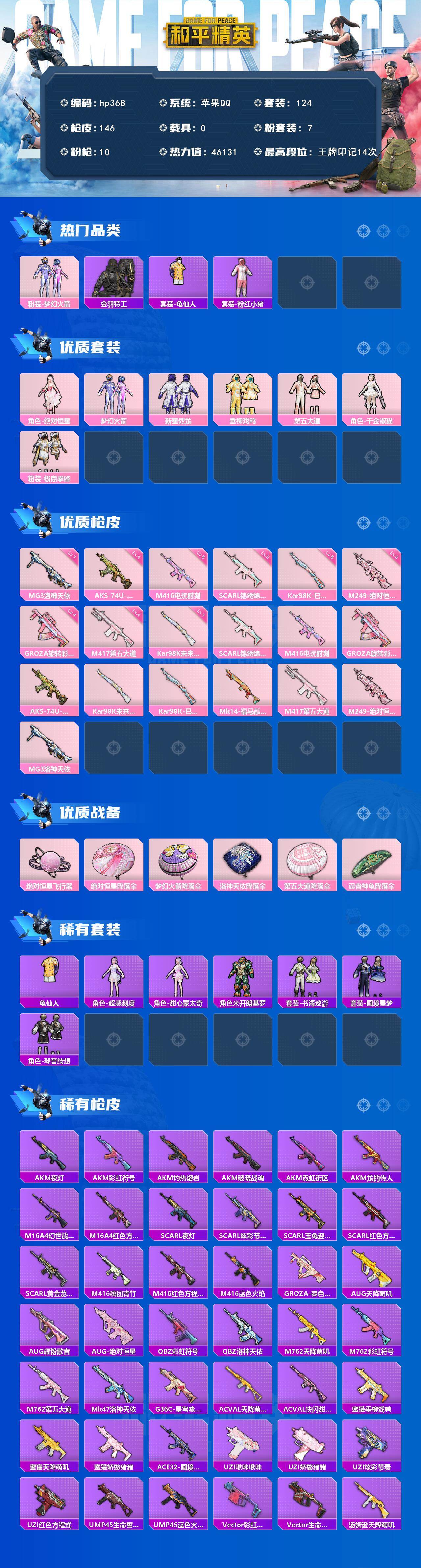 [17058555]苹果 手Q-7粉装-10特效枪-0载具-1粉色飞行器-46131热力值-14王牌印记-124套装-146枪皮 【热门品类】:粉装-梦幻火箭,套装-金羽特工,套装-龟仙人,套装-粉红小猪 【粉色套装】:角色-绝对恒星,粉装-梦幻火箭,粉装-新星烈龙,粉装-垂柳戏鸭,粉装-第五大道,角色-千金淑猫,粉装-极意拳锋 【粉色枪皮等级】:SCAR-L-锦绣绵绵(五级),M416-电玩时刻(五级),GROZA-旋转彩虹(四级),AKS-74U-森灵之息(四级),Kar98K-未来歌姬(一级),Kar98K-巳巳如意(五级),M417-第五大道(四级),M249-绝对恒星(三级),MG3-洛神天依(七级) 【粉色枪皮】:SCAR-L-锦绣绵绵,M416-电玩时刻,GROZA-旋转彩虹,AKS-74U-森灵之息,Kar98K-未来歌姬,Kar98K-巳巳如意,Mk14-福马献瑞,M417-第五大道,M249-绝对恒星,MG3-洛神天依 【粉色飞行器】:绝对恒星飞行器 【粉色降落伞】:绝对恒星降落伞,梦幻火箭降落伞,洛神天依降落伞,第五大道降落伞,忍者神龟降落伞 【稀有套装】:套装-龟仙人,角色-超感刻度,角色-甜心蒙太奇,套装-雪国风尚,角色-米开朗基罗,套装-书海巡游,套装-画境星梦,套装-琴音绮想 【稀有枪皮】:AKM-夜灯,AKM-彩虹符号,AKM-灼热熔岩,AKM-破晓战魂,AKM-霓虹街区,AKM-龙的传人,M16A4-幻世战舞者,M16A4-红色方程式,SCAR-L-夜灯,SCAR-L-炫彩节奏,SCAR-L-玉兔迎春,SCAR-L-红色方程式,SCAR-L-黄金龙骨,M416-糯团青竹,M416-红色方程式,M416-蓝色火焰,GROZA-暮色玫影,AUG-天降萌叽,AUG-耀粉歌者,AUG-绝对恒星,QBZ-彩虹符号,QBZ-洛神天依,M762-天降萌叽,M762-彩虹符号,M762-第五大道,Mk47-洛神天依,G36C-星穹咏叹调,AC-VAL-天降萌叽,AC-VAL-快闪甜心,蜜獾-垂柳戏鸭,蜜獾-天降萌叽,蜜獾-娇憨猪猪,ACE32-画境星梦,UZI-啾咪啾咪,UZI-娇憨猪猪,UZI-炫彩节奏,UZI-红色方程式,UMP45-生命誓言,UMP45-蓝色火焰,Vector-彩虹符号,Vector-生命誓言,汤姆逊-天降萌叽,汤姆逊-炫彩节奏,汤姆逊-环太平