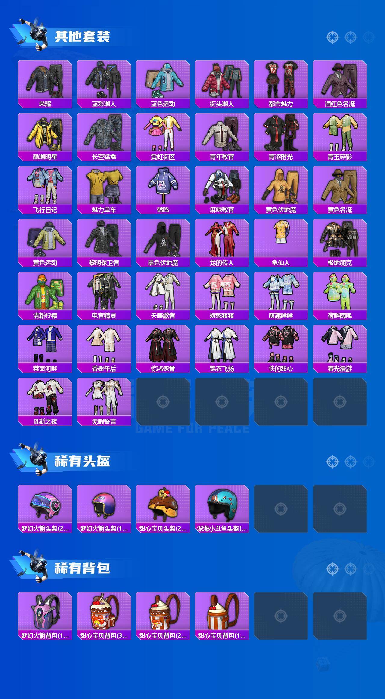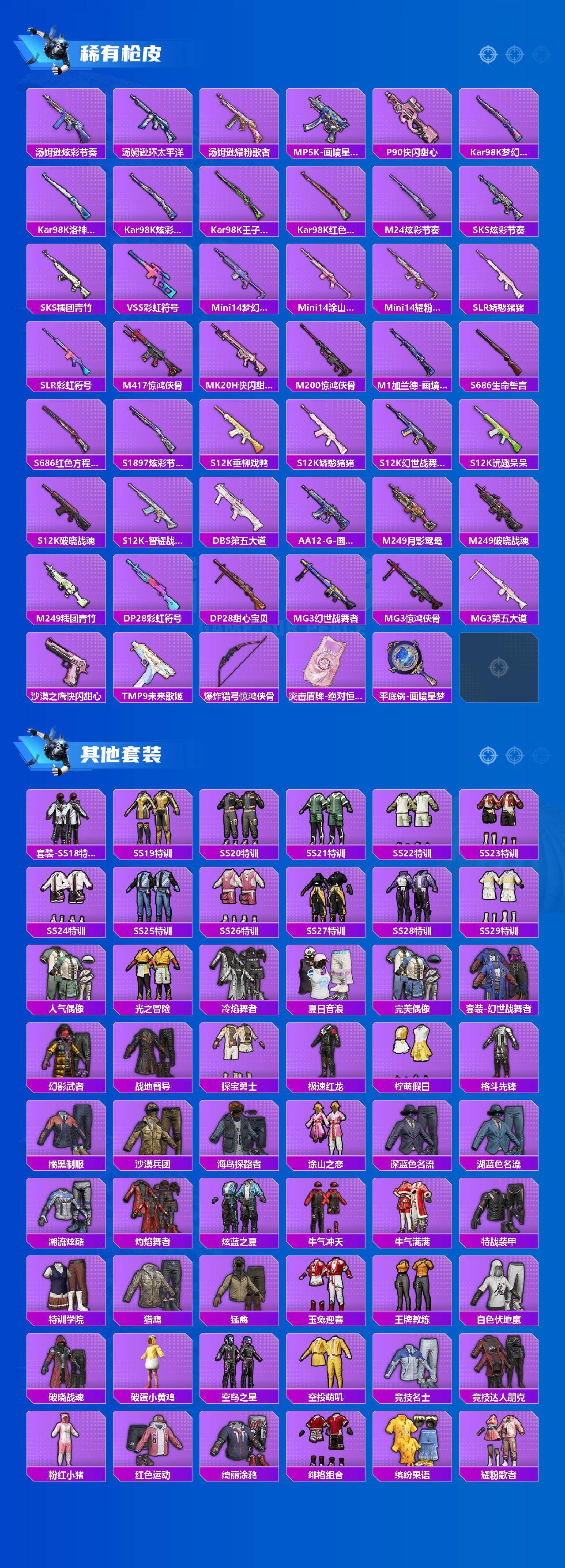 【稀有枪皮】:AKM-夜灯,AKM-彩虹符号,AKM-灼热熔岩,AKM-破晓战魂,AKM-霓虹街区,AKM-龙的传人,M16A4-幻世战舞者,M16A4-红色方程式,SCAR-L-夜灯,SCAR-L-炫彩节奏,SCAR-L-玉兔迎春,SCAR-L-红色方程式,SCAR-L-黄金龙骨,M416-糯团青竹,M416-红色方程式,M416-蓝色火焰,GROZA-暮色玫影,AUG-天降萌叽,AUG-耀粉歌者,AUG-绝对恒星,QBZ-彩虹符号,QBZ-洛神天依,M762-天降萌叽,M762-彩虹符号,M762-第五大道,Mk47-洛神天依,G36C-星穹咏叹调,AC-VAL-天降萌叽,AC-VAL-快闪甜心,蜜獾-垂柳戏鸭,蜜獾-天降萌叽,蜜獾-娇憨猪猪,ACE32-画境星梦,UZI-啾咪啾咪,UZI-娇憨猪猪,UZI-炫彩节奏,UZI-红色方程式,UMP45-生命誓言,UMP45-蓝色火焰,Vector-彩虹符号,Vector-生命誓言,汤姆逊-天降萌叽,汤姆逊-炫彩节奏,汤姆逊-环太平