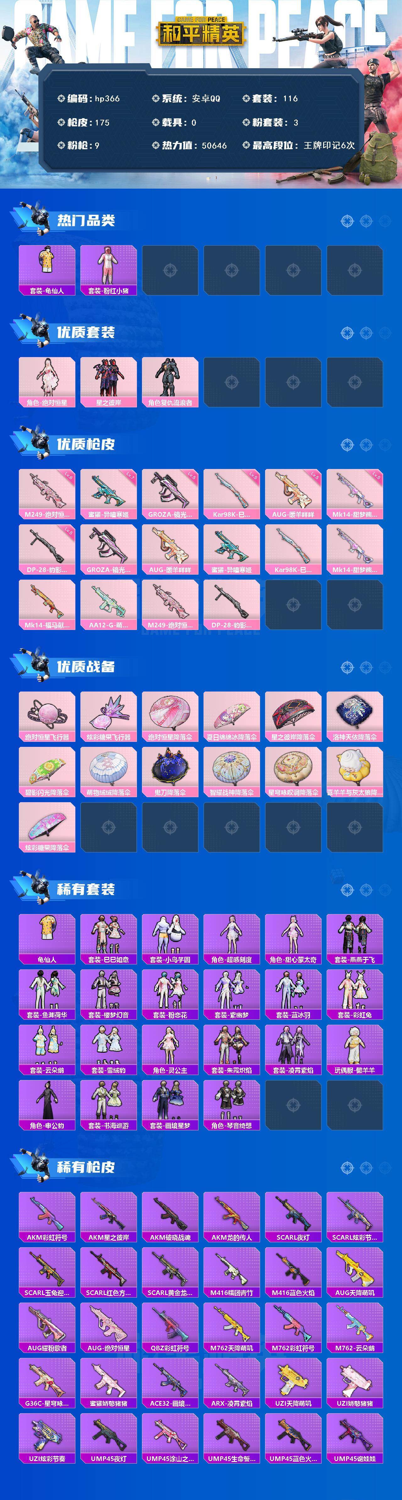 [17058485]安卓 手Q-3粉装-9特效枪-0载具-2粉色飞行器-50646热力值-6王牌印记-116套装-175枪皮 【热门品类】:套装-龟仙人,套装-粉红小猪 【粉色套装】:角色-绝对恒星,粉装-星之彼岸,角色-复仇流浪者 【粉色枪皮等级】:GROZA-镜光银凌(五级),AUG-暖羊咩咩(五级),蜜獾-异瞳寒姬(七级),Kar98K-巳巳如意(五级),Mk14-甜梦熊击(五级),M249-绝对恒星(六级),DP-28-豹影疾电(五级) 【粉色枪皮】:GROZA-镜光银凌,AUG-暖羊咩咩,蜜獾-异瞳寒姬,Kar98K-巳巳如意,Mk14-甜梦熊击,Mk14-福马献瑞,AA12-G-萌骑幻想,M249-绝对恒星,DP-28-豹影疾电 【粉色飞行器】:绝对恒星飞行器,炫彩糖果飞行器 【粉色降落伞】:绝对恒星降落伞,夏日绵绵冰降落伞,星之彼岸降落伞,洛神天依降落伞,碧影闪光降落伞,萌物绒绒降落伞,鬼刀降落伞,智耀战神降落伞,星穹咏叹调降落伞,喜羊羊与灰太狼降落伞,炫彩糖果降落伞 【稀有套装】:套装-龟仙人,套装-巳巳如意,套装-小鸟芋圆,角色-超感刻度,角色-甜心蒙太奇,套装-雪国风尚,套装-炫彩糖果,套装-燕燕于飞,套装-鱼渊荷华,套装-樱梦幻音,套装-粉恋花,套装-紫幽梦,套装-蓝冰羽,套装-彩虹兔,套装-云朵鹅,套装-雪绒豹,角色-灵公主,套装-朱霞炽焰,套装-凌霄紫焰,玩偶服-懒羊羊,角色-申公豹,套装-书海巡游,套装-画境星梦,套装-琴音绮想 【稀有枪皮】:AUG-冰晶雪宝,AKM-彩虹符号,AKM-星之彼岸,AKM-破晓战魂,AKM-龙的传人,SCAR-L-夜灯,SCAR-L-炫彩节奏,SCAR-L-玉兔迎春,SCAR-L-红色方程式,SCAR-L-黄金龙骨,M416-糯团青竹,M416-蓝色火焰,AUG-天降萌叽,AUG-耀粉歌者,AUG-绝对恒星,QBZ-彩虹符号,M762-天降萌叽,M762-彩虹符号,M762-云朵鹅,G36C-星穹咏叹调,蜜獾-娇憨猪猪,ACE32-画境星梦,ARX-凌霄紫焰,UZI-天降萌叽,UZI-娇憨猪猪,UZI-炫彩节奏,UMP45-夜灯,UMP45-涂山之恋,UMP45-生命誓言,UMP45-蓝色火焰,UMP45-诡娃娃,Vector-彩虹符号,Vector-生命誓言,汤姆逊-炫彩节奏,MP5K-画境星梦,AKS-74U-鬼刀,JS