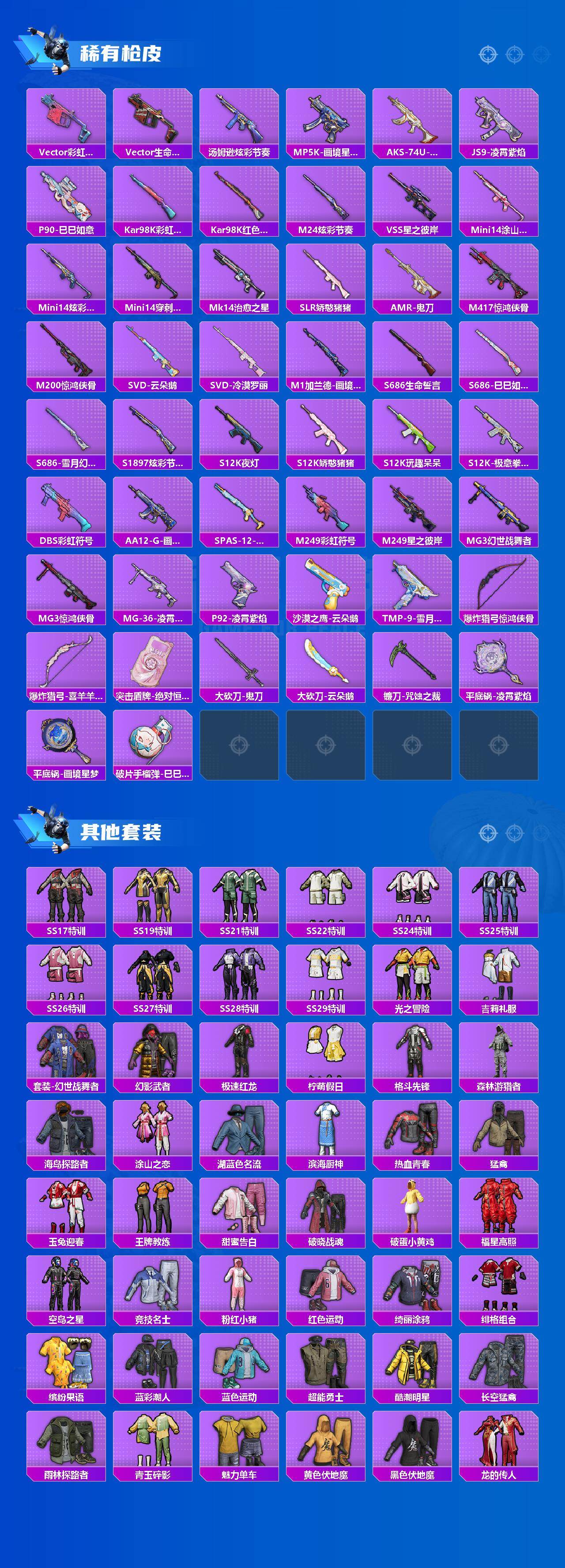 【稀有枪皮】:AUG-冰晶雪宝,AKM-彩虹符号,AKM-星之彼岸,AKM-破晓战魂,AKM-龙的传人,SCAR-L-夜灯,SCAR-L-炫彩节奏,SCAR-L-玉兔迎春,SCAR-L-红色方程式,SCAR-L-黄金龙骨,M416-糯团青竹,M416-蓝色火焰,AUG-天降萌叽,AUG-耀粉歌者,AUG-绝对恒星,QBZ-彩虹符号,M762-天降萌叽,M762-彩虹符号,M762-云朵鹅,G36C-星穹咏叹调,蜜獾-娇憨猪猪,ACE32-画境星梦,ARX-凌霄紫焰,UZI-天降萌叽,UZI-娇憨猪猪,UZI-炫彩节奏,UMP45-夜灯,UMP45-涂山之恋,UMP45-生命誓言,UMP45-蓝色火焰,UMP45-诡娃娃,Vector-彩虹符号,Vector-生命誓言,汤姆逊-炫彩节奏,MP5K-画境星梦,AKS-74U-鬼刀,JS