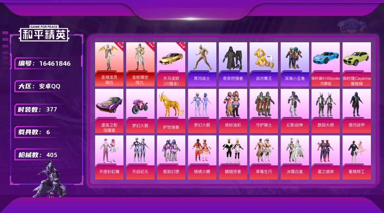 [16461846]安卓 手Q-2神装-37粉装-14特效枪-6载具-7粉色飞行器-166133热力值-5王牌印记-377套装-405枪皮 【红色载具】:天马凌跃(闪耀金)(三级) 【红色神装等级】:圣域龙灵-瑞拉(二级),金蛇镇世-烛九(一级) 【红色角色神装】:圣域龙灵-瑞拉,金蛇镇世-烛九 【热门品类】:粉装-梦幻火箭,粉装-缤纷油彩,套装-冥河战士,套装-派对舞王,套装-深海小丑鱼,套装-小丑鱼,套装-奇异狩猎者,角色-军刀雅典娜,套装-金羽特工,套装-忍者信条,套装-星河浪客,套装-暗夜行者,套装-龟仙人,套装-暗影哥特,套装-浪漫波比,套装-粉红小猪,角色-六号稻草人,M416-星际漫游 【粉色套装】:粉装-守护骑士,粉装-幻影战神,粉装-数码大师,粉装-银河战甲,粉装-天使彩虹糖,粉装-梦幻火箭,粉装-天启纪元,粉装-缤纷油彩,粉装-极致幻想,粉装-锦绣火鲤,粉装-鳞翅贤者,粉装-草莓生巧,粉装-冰霜白皇,粉装-星之彼岸,粉装-蜜桃特工,角色-洛天依,粉装-蓝莓炮弹,粉装-甜梦小狐,粉装-炙焰牛王,粉装-星夜魔法师,角色-复仇流浪者,粉装-傲雪凌霜,粉装-霁雪冰心,粉装-灵感创作师,粉装-太空嘟嘟,蜀山剑侠-李逍遥,粉装-千面幻镜,粉装-旋转彩虹,粉装-盖世英雄,粉装-霞光圣骑,粉装-寒光使者,粉装-莲影清波,角色-圣堂之誓,角色-千金淑猫,角色-月影灵韵,角色-狂魅哈莉,角色-狂魇小丑 【粉色枪皮等级】:AKM-炫紫旋律(七级),SCAR-L-青春物语(一级),SCAR-L-金蛇镇世(三级),M416-五爪金龙(七级),GROZA-香水柠檬(七级),ACE32-绿头鱼(五级),Vector-环太平洋(四级),Kar98K-巳巳如意(五级),SLR-暗夜玫瑰(三级),DP-28-豹影疾电(五级),MG3-洛神天依(七级),烟雾弹-甜梦果泡(四级),燃烧瓶-薄荷可可(六级),破片手榴弹-瓶中星球(六级) 【粉色载具】:天马凌跃(闪耀金),保时捷918 Spyder(沉静蓝),保时捷Cayenne(橄榄绿),虚妄之影(炫耀紫),双人摩托-梦幻火箭,护世瑞兽 【粉色枪皮】:AKM-炫紫旋律,SCAR-L-青春物语,SCAR-L-金蛇镇世,M416-五爪金龙,GROZA-香水柠檬,ACE32-绿头鱼,Vector-环太平洋,Kar98K-巳巳如意,SLR-暗夜玫瑰,DP-28-