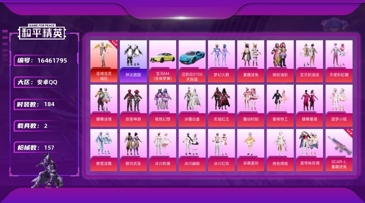 [16461795]安卓 手Q-1神装-22粉装-3特效枪-2载具-4粉色飞行器-62077热力值-5王牌印记-184套装-157枪皮 【红色神装等级】:圣域龙灵-瑞拉(二级) 【红色角色神装】:圣域龙灵-瑞拉 【热门品类】:粉装-梦幻火箭,粉装-童趣迷兔,粉装-缤纷油彩,套装-浪漫天命,套装-胖达圆圆,套装-龟仙人,套装-潮萌小黄鸭 【粉色套装】:粉装-宝贝奶油派,粉装-天使彩虹糖,粉装-蝶舞迷情,粉装-梦幻火箭,粉装-缤纷油彩,粉装-放客神游,粉装-极致幻想,粉装-冰霜白皇,粉装-童趣迷兔,粉装-炙焰红王,粉装-馨动时刻,粉装-蜜桃特工,粉装-蝶舞蔷薇,粉装-甜梦小狐,粉装-傲雪凌霜,粉装-朗月武圣,粉装-冰川粉黛,粉装-冰川幽秘,粉装-冰川红玫,角色-呆萌星弥,角色-绝色倾城,粉装-星穹咏叹调 【粉色枪皮等级】:SCAR-L-童趣迷兔(五级),Kar98K-圣域龙灵(二级),AWM-橘柚倾心(三级) 【粉色载具】:宝马M4(圣保罗黄),迈凯伦570S(天际蓝) 【粉色枪皮】:SCAR-L-童趣迷兔,Kar98K-圣域龙灵,AWM-橘柚倾心 【粉色飞行器】:心之恋语飞行翼,冰川粉黛飞行器,绝色倾城飞行器,圣域金龙飞行器 【粉色降落伞】:甜心宝贝降落伞,春暖花开降落伞,梦幻火箭降落伞,炫紫旋律降落伞,PEL轰鸣竞梦者降落伞,童趣迷兔降落伞,暗夜玫瑰降落伞,橘柚倾心降落伞,甜梦小狐降落伞,暖熊萌萌降落伞,绒雪飘舞降落伞,千面幻镜降落伞,冰川粉黛降落伞,镜光幻境降落伞,圣堂之誓降落伞,猪猪侠降落伞,绝色倾城降落伞,圣域龙灵降落伞,绯果甜心降落伞,异瞳寒姬降落伞 【稀有套装】:套装-龟仙人,套装-雪国风尚,套装-粉恋花,套装-紫幽梦,套装-蓝冰羽,角色-鲛海歌灵,套装-星影赞美诗,套装-霓虹热舞 【稀有枪皮】:AKM-夜灯,AKM-龙的传人,M16A4-甜心亚梦,M16A4-红色方程式,SCAR-L-夜灯,SCAR-L-玉兔迎春,SCAR-L-甜蜜誓约,SCAR-L-生命誓言,M416-夜灯,M416-蓝色火焰,GROZA-懵萌河马,GROZA-春暖花开,GROZA-治愈之星,AUG-冰川粉黛,M762-彩虹甜喵,M762-橘柚倾心,M762-甜心宝贝,M762-第五大道,M762-绒雪飘舞,G36C-懵萌河马,G36C-暗夜玫瑰,AC-VAL-彩虹甜喵,AC-VAL-快闪甜心,AC-V
