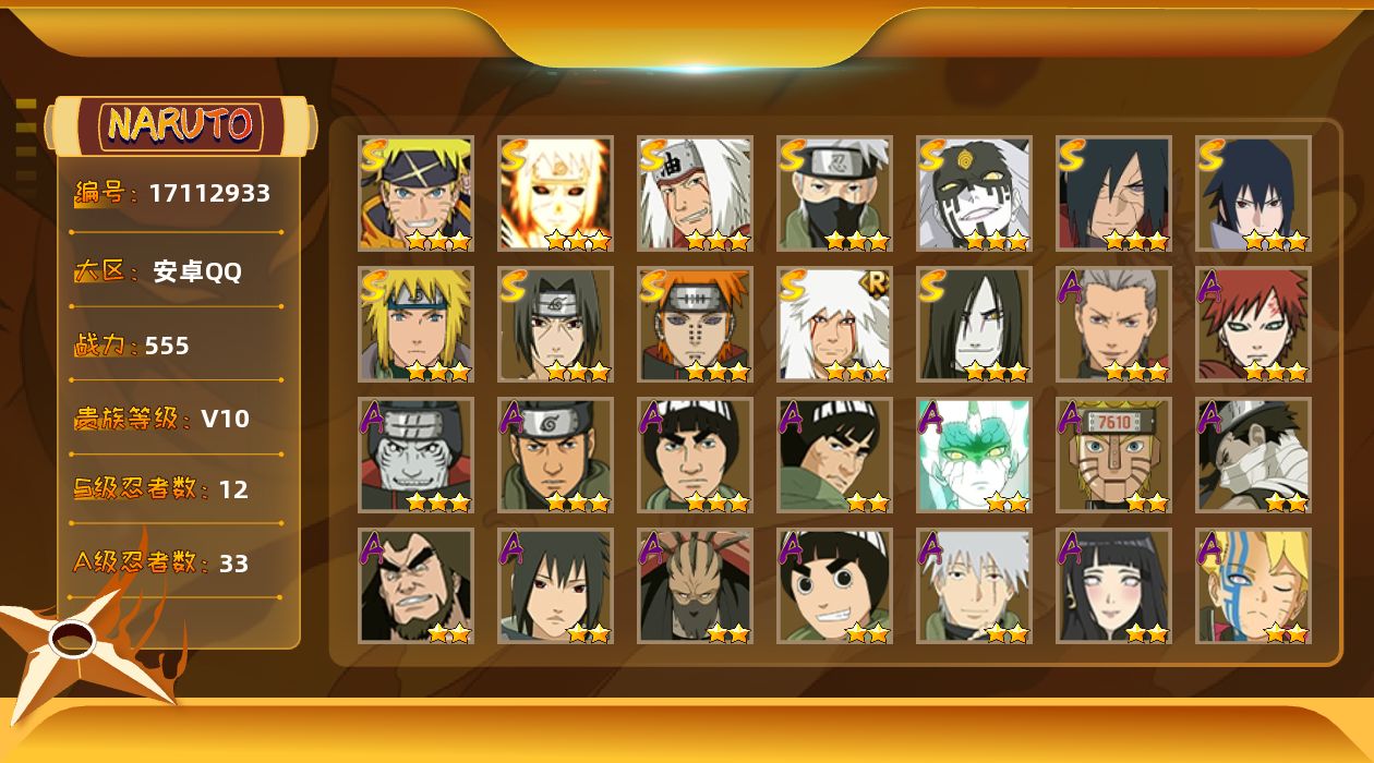 [17112933]12S级忍者数-33A级忍者数 【S级忍者】:宇智波斑「秽土转生·解」(3星),宇智波鼬「须佐能乎」(3星),旗木卡卡西「须佐能乎」(3星),自来也「舞之豪杰」(3星),大蛇丸(3星),自来也「传说中的三忍」(3星),波风水门(3星),佩恩「天道」(3星),宇智波佐助「永恒万花筒」(3星),大筒木桃式(3星),波风水门「九喇嘛连结」(3星),漩涡鸣人·宇智波佐助(3星) 【A级忍者】:艾「青年」(2星),波风水门「青年」(2星),达鲁伊「博人传」(2星),迪达拉「秽土转生」(2星),奇拉比(2星),飞段(3星),飞段「死司凭血」(2星),干柿鬼鲛(3星),漩涡博人「桃式显现」(2星),机械鸣人「初始形态」(2星),迈特凯(3星),旗木卡卡西「幻之真容」(2星),桃地再不斩「秽土转生」(2星),我爱罗「疾风传」(3星),蝎(2星),蝎「绯流琥」(2星),小南「漂泊浪客」(2星),猿飞阿斯玛(3星),宇智波佐助「须佐能乎」(2星),药师兜「半蛇斗篷」(2星),照美冥「夏日泳装」(2星),日向宁次「忍界大战」(2星),日向雏田「最终章」(2星),宇智波带土「暴怒」(2星),神秘面具男「忍者之路」(2星),李洛克「忍界大战」(2星),猿飞木叶丸「博人传」(2星),秋道丁次「忍界大战」(2星),千代「近松十人卫」(2星),神农「羁绊」(2星),宇智波泉奈(2星),巳月「仙人模式」(2星),迈特凯「青春爆炸」(2星)