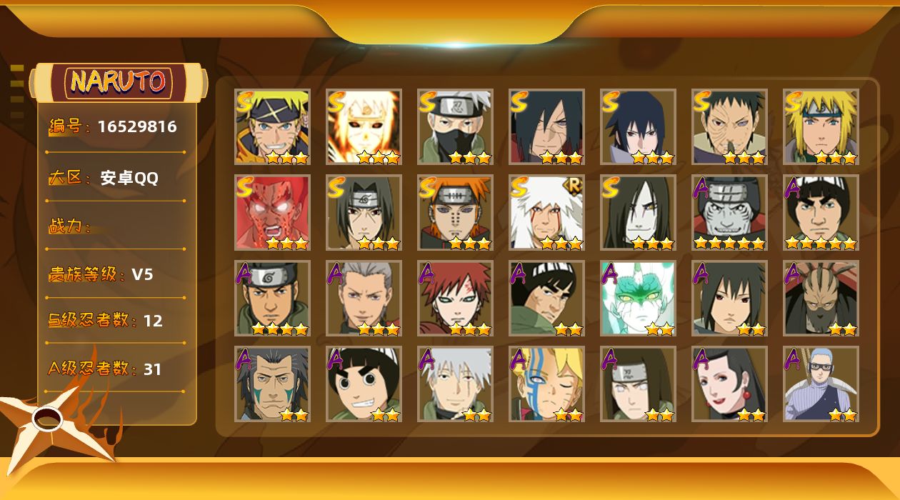 [16529816]12S级忍者数-31A级忍者数 【S级忍者】:宇智波斑「秽土转生·解」(3星),宇智波带土「忍界大战」(3星),宇智波鼬「须佐能乎」(3星),旗木卡卡西「须佐能乎」(3星),自来也「舞之豪杰」(3星),大蛇丸(3星),波风水门(3星),迈特凯「死门」(3星),佩恩「天道」(3星),宇智波佐助「永恒万花筒」(3星),波风水门「九喇嘛连结」(3星),漩涡鸣人·宇智波佐助(3星) 【A级忍者】:艾「青年」(2星),长门「青年」(2星),波风水门「青年」(2星),达鲁伊「博人传」(2星),奇拉比(2星),奇拉比「忍界大战」(2星),飞段(3星),飞段「死司凭血」(2星),干柿鬼鲛(5星),漩涡博人「桃式显现」(2星),迈特凯(5星),旗木卡卡西「幻之真容」(2星),我爱罗「疾风传」(3星),蝎(2星),蝎「绯流琥」(2星),猿飞阿斯玛(4星),宇智波鼬(2星),宇智波佐助「须佐能乎」(2星),日向宁次「忍界大战」(2星),宇智波带土「暴怒」(2星),长十郎「六代目水影」(2星),李洛克「忍界大战」(2星),黑土「博人传」(2星),秋道丁次「忍界大战」(2星),千代「近松十人卫」(2星),不缘(2星),不风(2星),宇智波泉奈(2星),不动(2星),巳月「仙人模式」(2星),迈特凯「青春爆炸」(2星)