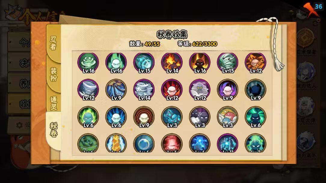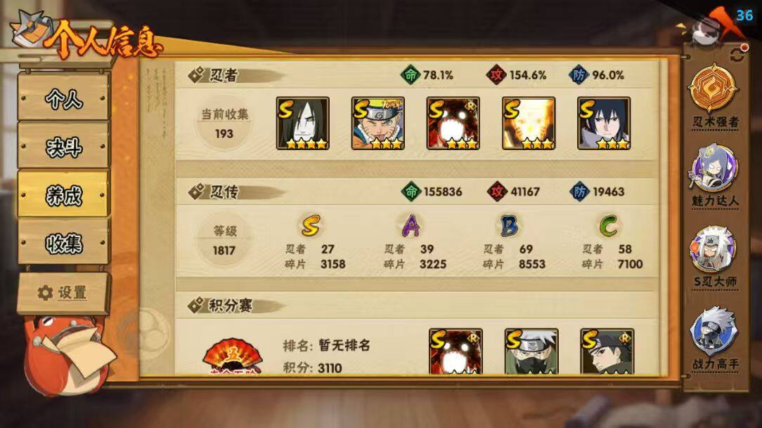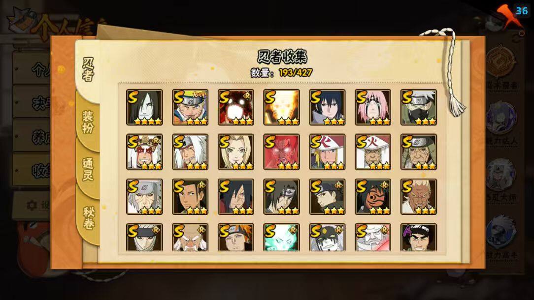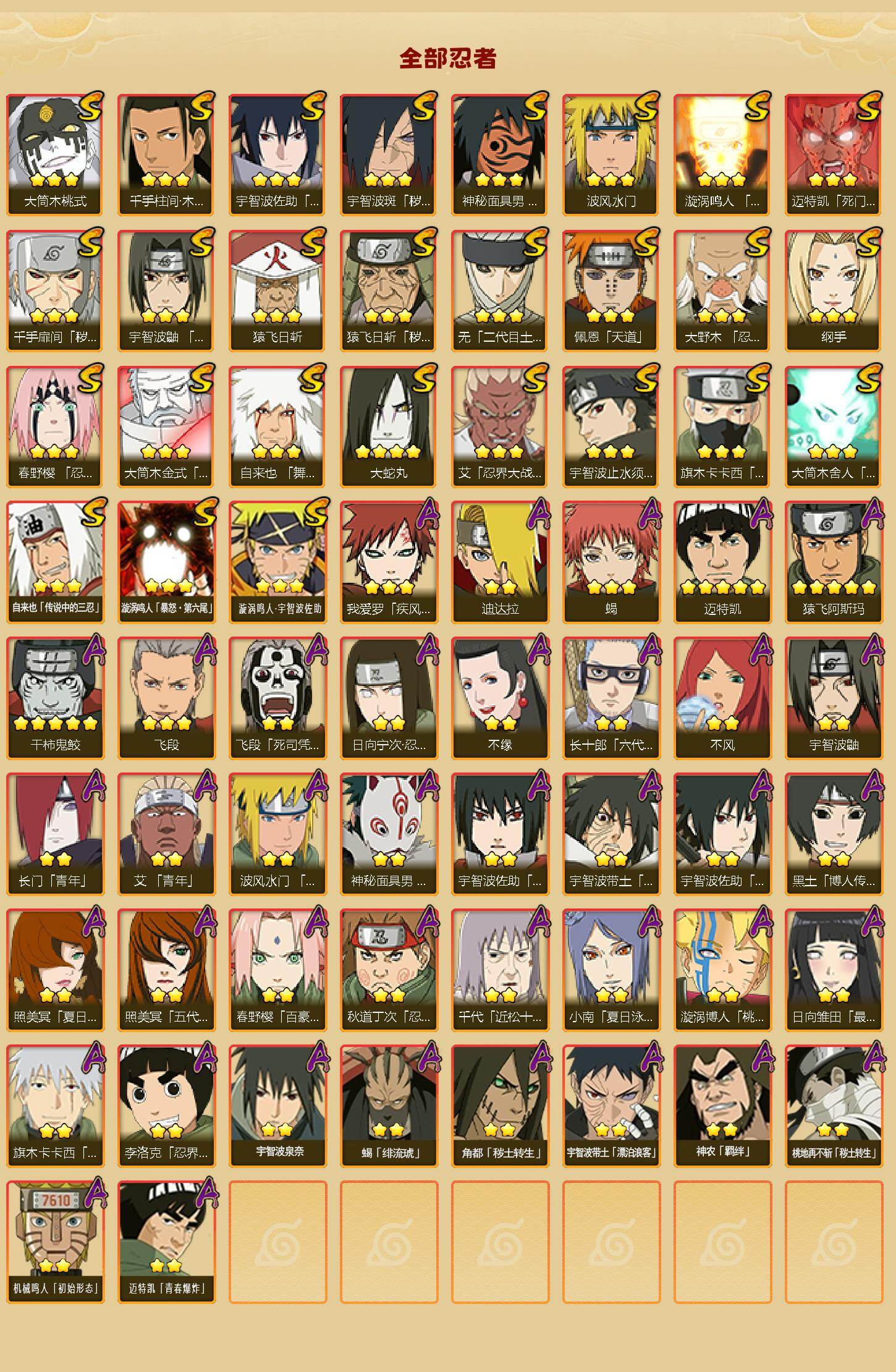 【S级忍者】:猿飞日斩「秽土转生」(3星),千手扉间「秽土转生」(3星),宇智波斑「秽土转生·解」(3星),大野木「忍界大战」(3星),春野樱「忍界大战」(3星),艾「忍界大战」(3星),宇智波鼬「须佐能乎」(3星),宇智波止水「须佐能乎」(3星),旗木卡卡西「须佐能乎」(3星),千手柱间「木叶创立」(3星),无「二代目土影」(3星),自来也「舞之豪杰」(3星),大蛇丸(4星),自来也「传说中的三忍」(3星),纲手(3星),猿飞日斩(3星),波风水门(3星),神秘面具男「红夜之刃」(3星),漩涡鸣人「九喇嘛连结」(3星),迈特凯「死门」(3星),佩恩「天道」(3星),宇智波佐助「永恒万花筒」(3星),大筒木金式(3星),大筒木桃式(3星),大筒木舍人「最终章」(3星),漩涡鸣人「暴怒·第六尾」(3星),漩涡鸣人·宇智波佐助(3星)
