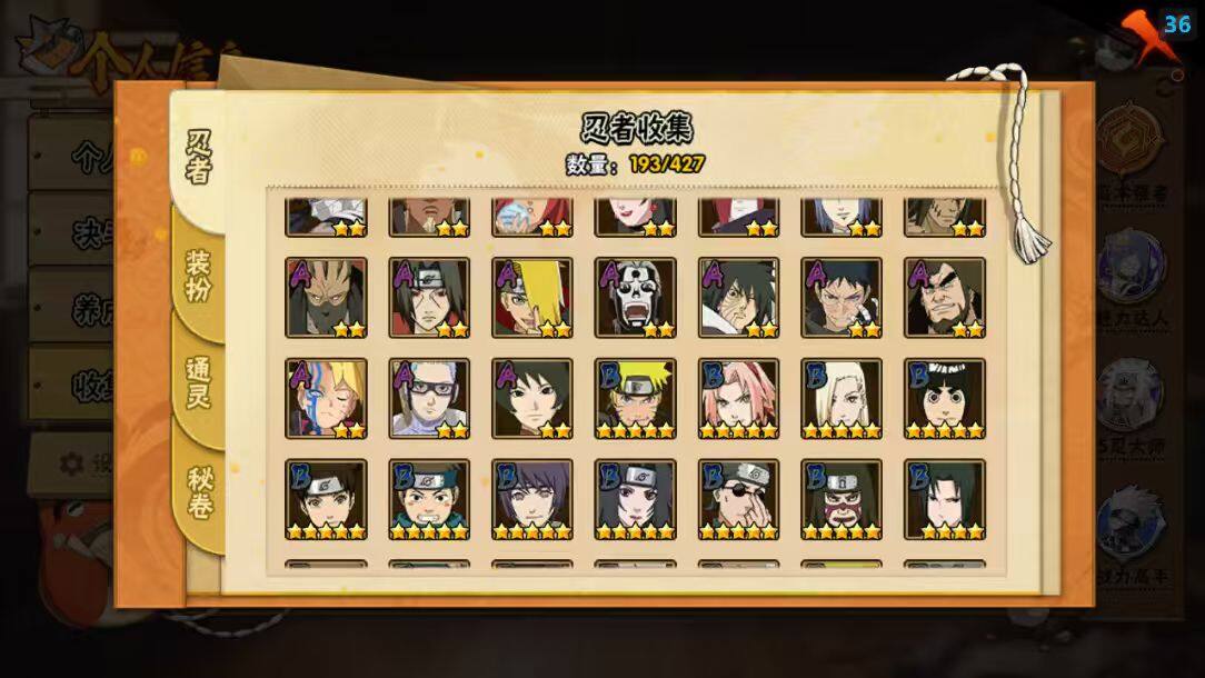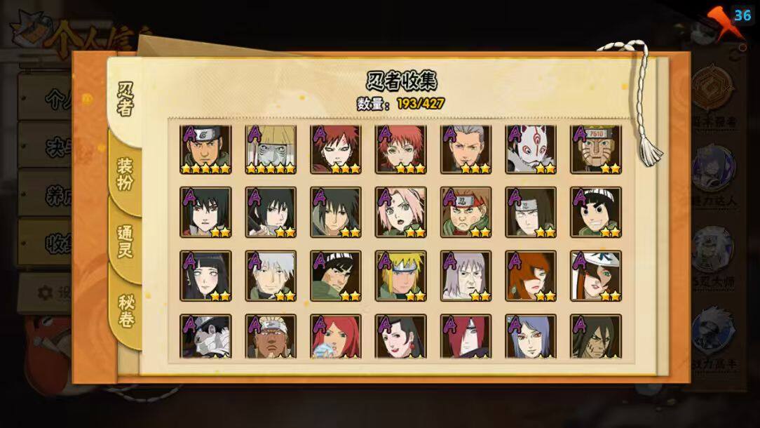【A级忍者】:艾「青年」(2星),长门「青年」(2星),波风水门「青年」(2星),迪达拉(2星),飞段(3星),飞段「死司凭血」(2星),干柿鬼鲛(5星),漩涡博人「桃式显现」(2星),机械鸣人「初始形态」(2星),迈特凯(5星),旗木卡卡西「幻之真容」(2星),桃地再不斩「秽土转生」(2星),我爱罗「疾风传」(3星),蝎(3星),蝎「绯流琥」(2星),小南「夏日泳装」(2星),角都「秽土转生」(2星),猿飞阿斯玛(5星),宇智波鼬(2星),宇智波佐助「须佐能乎」(2星),宇智波佐助「万花筒写轮眼」(2星),照美冥「夏日泳装」(2星),照美冥「五代目水影」(2星),日向宁次「忍界大战」(2星),日向雏田「最终章」(2星),宇智波带土「暴怒」(2星),宇智波带土「漂泊浪客」(2星),长十郎「六代目水影」(2星),神秘面具男「忍者之路」(2星),李洛克「忍界大战」(2星),黑土「博人传」(2星),春野樱「百豪」(2星),秋道丁次「忍界大战」(2星),千代「近松十人卫」(2星),神农「羁绊」(2星),不缘(2星),不风(2星),宇智波泉奈(2星),迈特凯「青春爆炸」(2星)