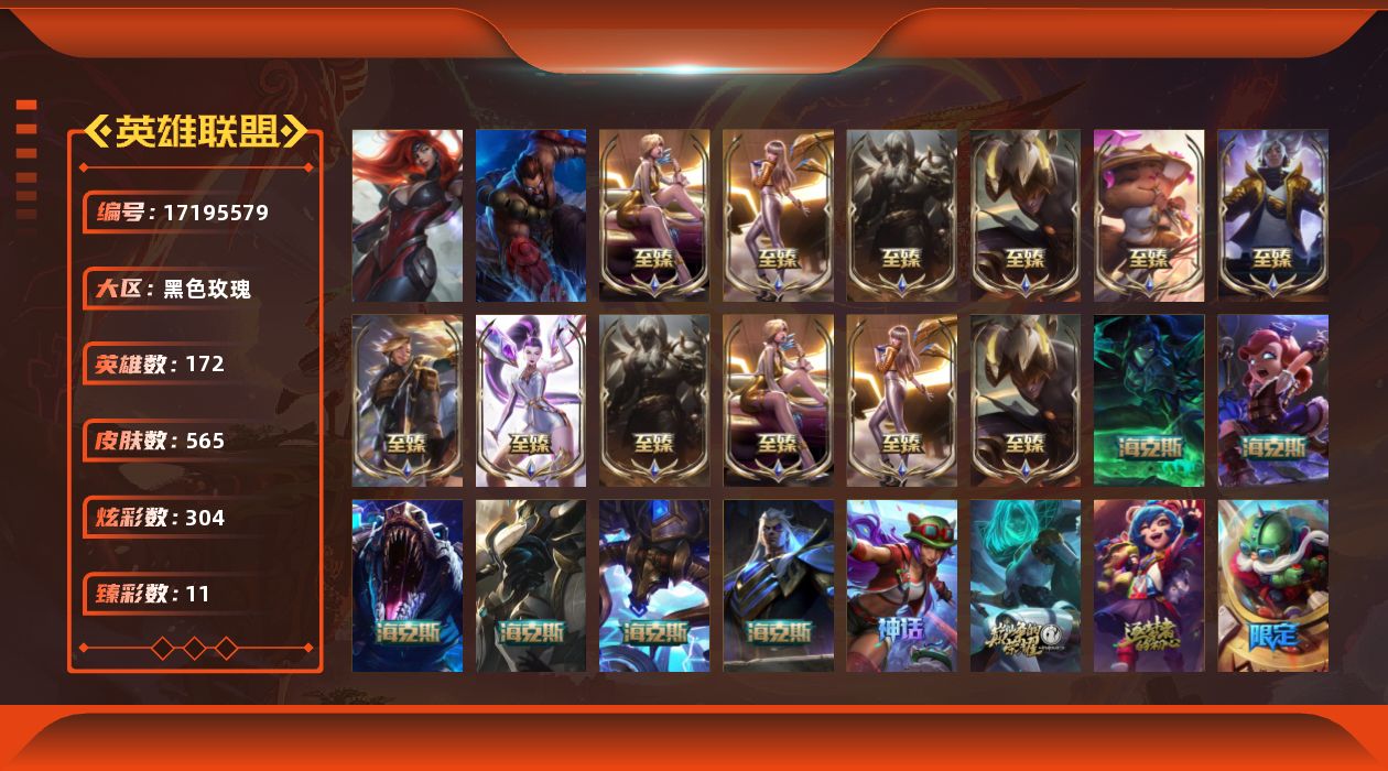 未定级段位-172英雄-565皮肤-304炫彩-2终极-22神话-80限定-56传说-137史诗