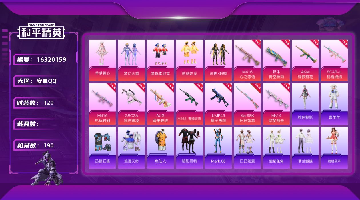 [16320159]安卓 手Q-5粉装-11特效枪-0载具-0粉色飞行器-57288热力值-7王牌印记-120套装-190枪皮