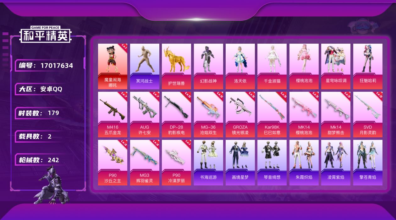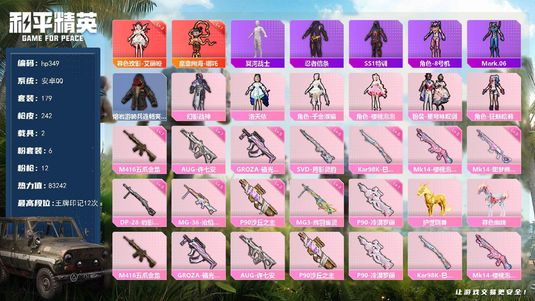 [17017634]安卓 手Q-2神装-6粉装-12特效枪-2载具-8粉色飞行器-83242热力值-12王牌印记-179套装-242枪皮