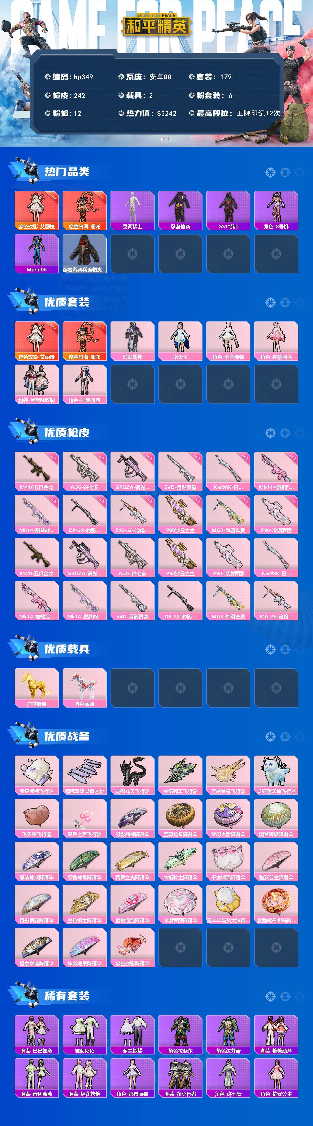 [17017634]安卓 手Q-2神装-6粉装-12特效枪-2载具-8粉色飞行器-83242热力值-12王牌印记-179套装-242枪皮 【红色神装等级】:暮色玫影-艾丽娅(三级),魔童闹海-哪吒(一级) 【红色角色神装】:暮色玫影-艾丽娅,魔童闹海-哪吒 【热门品类】:套装-冥河战士,套装-忍者信条,套装-SS1特训,角色-8号机,角色-Mark.06,熔岩游骑兵连帽夹克 【粉色套装】:粉装-幻影战神,角色-洛天依,角色-千金淑猫,角色-樱桃泡泡,粉装-星穹咏叹调,角色-狂魅哈莉 【粉色枪皮等级】:M416-五爪金龙(七级),GROZA-镜光银凌(五级),AUG-许七安(七级),P90-沙丘之主(三级),P90-冷漠罗丽(一级),Kar98K-巳巳如意(五级),Mk14-樱桃泡泡(五级),Mk14-甜梦熊击(五级),SVD-月影灵韵(五级),DP-28-豹影疾电(五级),MG3-辉羽雀灵(三级),MG-36-沧焰双生(五级) 【粉色载具】:护世瑞兽,暮色幽蹄 【粉色枪皮】:M416-五爪金龙,GROZA-镜光银凌,AUG-许七安,P90-沙丘之主,P90-冷漠罗丽,Kar98K-巳巳如意,Mk14-樱桃泡泡,Mk14-甜梦熊击,SVD-月影灵韵,DP-28-豹影疾电,MG3-辉羽雀灵,MG-36-沧焰双生 【粉色飞行器】:酣梦熊熊飞行器,镜域双华-灵镜之阶,龙翔九天飞行器,幽焰列车飞行器,万象金身飞行器,灵猫魔法师飞行器,飞天猪飞行器,暮色之舞飞行器 【粉色降落伞】:幻影战神降落伞,至尊龙雀降落伞,梦幻火箭降落伞,闲梦青缨降落伞,魔法神域降落伞,忍者神龟降落伞,精灵之光降落伞,幽焰骑士降落伞,千金淑猫降落伞,临安公主降落伞,月影灵韵降落伞,金蛇镇世降落伞,樱桃泡泡降落伞,冷漠罗丽降落伞,喜羊羊与灰太狼降落伞,魔童闹海 哪吒降落伞,极意拳锋降落伞,炫彩糖果降落伞,暮色玫影降落伞 【稀有套装】:套装-巳巳如意,套装-雪国风尚,套装-雏菊兔兔,套装-萝兰蝴蝶,角色-拉斐尔,角色-达芬奇,套装-糖糖葫芦,套装-青团波波,套装-棉花软糖,角色-都市丽猫,套装-净心行者,角色-许七安,角色-临安公主,角色-怀庆长公主,角色-俏兔智灵,角色-光矢逐梦,套装-燕燕于飞,套装-鱼渊荷华,角色-糖霜甜心,角色-蜜桃派对,套装-粉恋花,套装-紫幽梦,套装-蓝冰羽,角色-幽澜祭司,套装-星影赞美诗,套装-