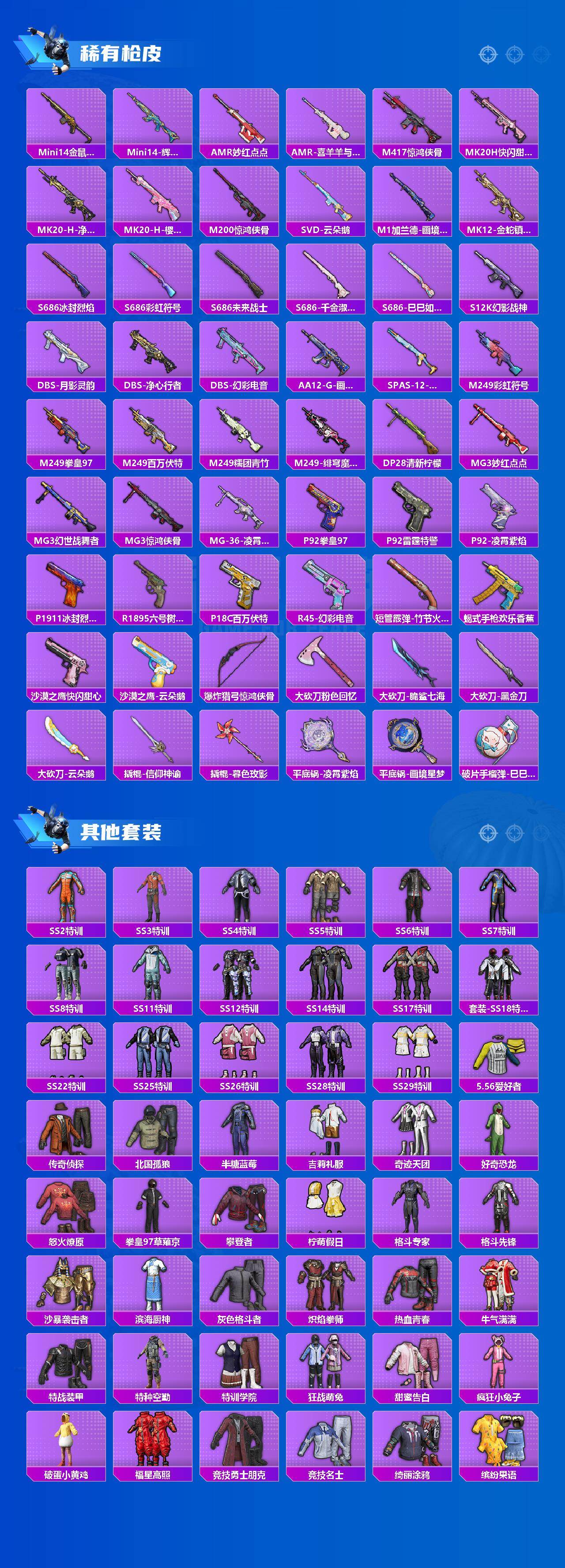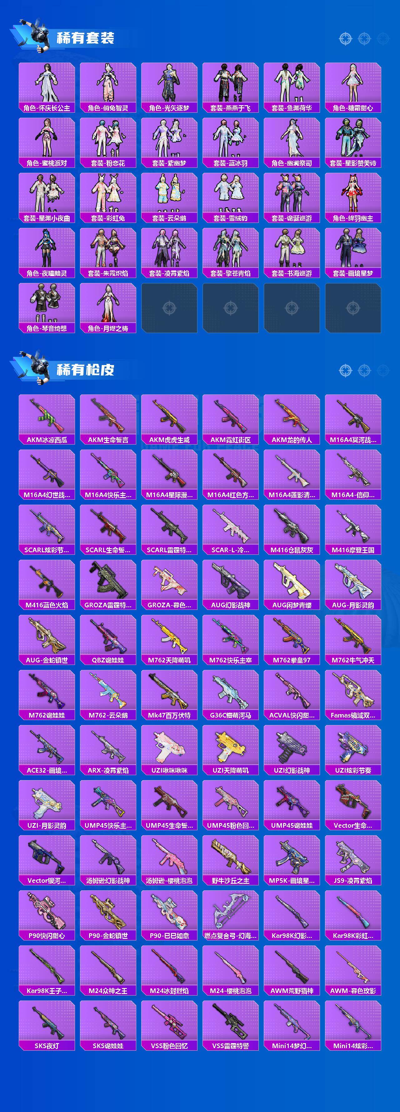 M416-五爪金龙,GROZA-镜光银凌,AUG-许七安,P90-沙丘之主,Kar98K-巳巳如意,Mk14-樱桃泡泡,SVD-月影灵韵