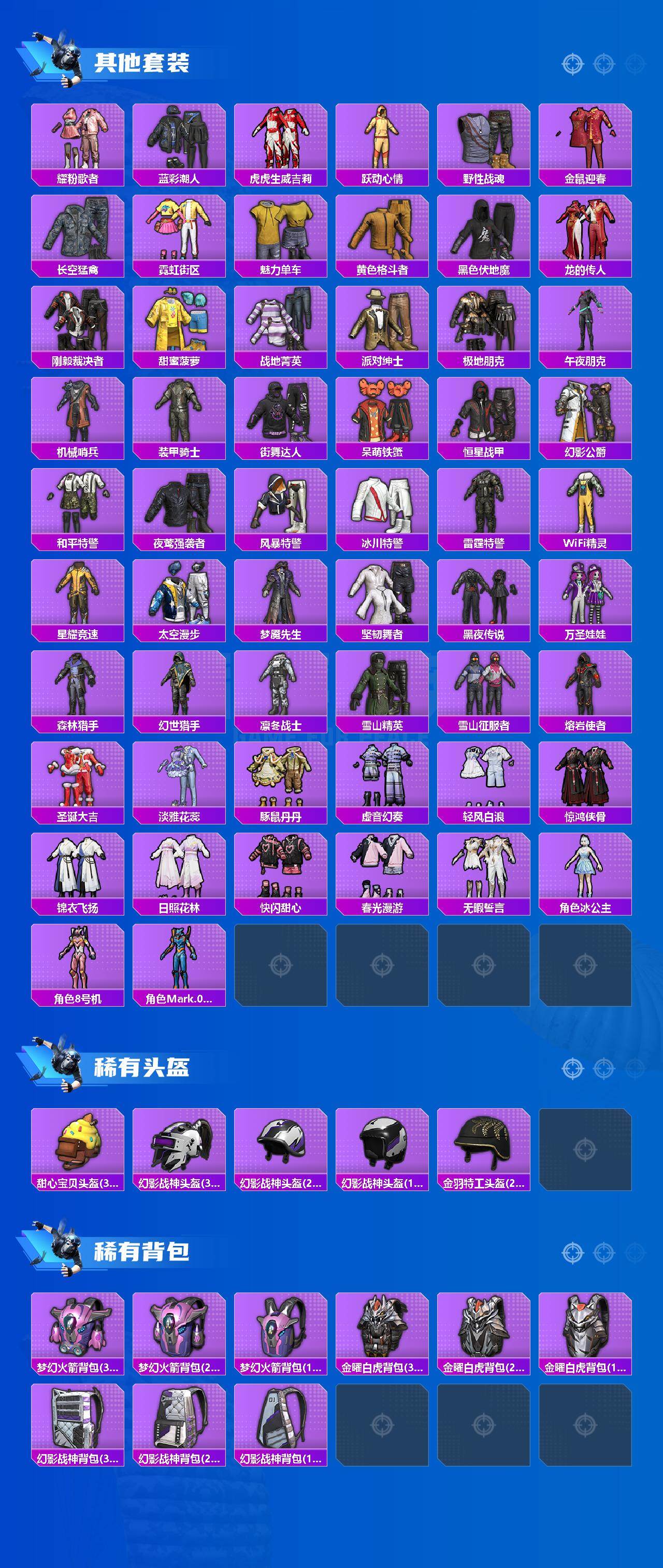 【稀有套装】:套装-巳巳如意,套装-雪国风尚,套装-雏菊兔兔,套装-萝兰蝴蝶,角色-拉斐尔,角色-达芬奇,套装-糖糖葫芦,套装-青团波波,套装-棉花软糖,角色-都市丽猫,套装-净心行者,角色-许七安,角色-临安公主,角色-怀庆长公主,角色-俏兔智灵,角色-光矢逐梦,套装-燕燕于飞,套装-鱼渊荷华,角色-糖霜甜心,角色-蜜桃派对,套装-粉恋花,套装-紫幽梦,套装-蓝冰羽,角色-幽澜祭司,套装-星影赞美诗,套装-