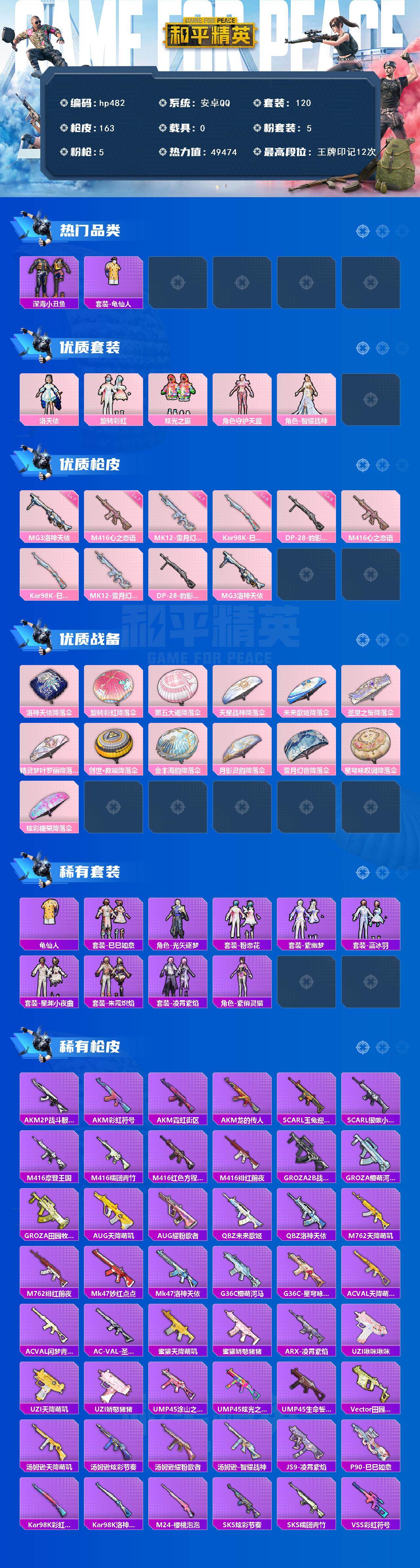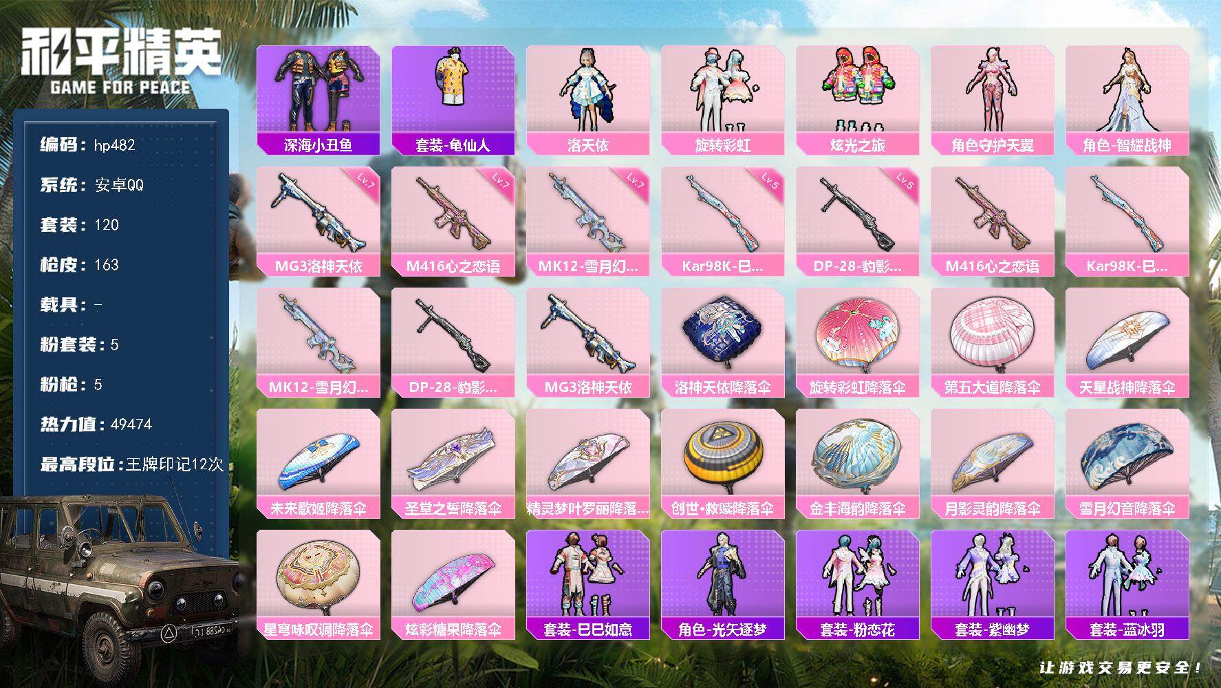[17188633]安卓 手Q-5粉装-5特效枪-0载具-0粉色飞行器-49474热力值-12王牌印记-120套装-163枪皮 【热门品类】:套装-深海小丑鱼,套装-龟仙人 【粉色套装】:角色-洛天依,粉装-旋转彩虹,粉装-炫光之旅,角色-守护天翼,角色-智耀战神 【粉色枪皮等级】:M416-心之恋语(七级),Kar98K-巳巳如意(五级),MK12-雪月幻音(七级),DP-28-豹影疾电(五级),MG3-洛神天依(七级) 【粉色枪皮】:M416-心之恋语,Kar98K-巳巳如意,MK12-雪月幻音,DP-28-豹影疾电,MG3-洛神天依 【粉色降落伞】:洛神天依降落伞,旋转彩虹降落伞,第五大道降落伞,天星战神降落伞,未来歌姬降落伞,圣堂之誓降落伞,精灵梦叶罗丽降落伞,创世·救赎降落伞,金丰海韵降落伞,月影灵韵降落伞,雪月幻音降落伞,星穹咏叹调降落伞,炫彩糖果降落伞 【稀有套装】:套装-龟仙人,套装-巳巳如意,角色-光矢逐梦,套装-粉恋花,套装-紫幽梦,套装-蓝冰羽,套装-星渊小夜曲,套装-朱霞炽焰,套装-凌霄紫焰,角色-紫俏灵猫 【稀有枪皮】:AKM-2P战斗服款,AKM-彩虹符号,AKM-霓虹街区,AKM-龙的传人,SCAR-L-玉兔迎春,SCAR-L-银碳小老虎,M416-摩登王国,M416-糯团青竹,M416-红色方程式,M416-绯红前夜,GROZA-2B战斗服款,GROZA-懵萌河马,GROZA-田园牧歌,AUG-天降萌叽,AUG-耀粉歌者,QBZ-未来歌姬,QBZ-洛神天依,M762-天降萌叽,M762-绯红前夜,Mk47-妙红点点,Mk47-洛神天依,G36C-懵萌河马,G36C-星穹咏叹调,AC-VAL-天降萌叽,AC-VAL-闲梦青缨,AC-VAL-圣辉之星,蜜獾-天降萌叽,蜜獾-娇憨猪猪,ARX-凌霄紫焰,UZI-啾咪啾咪,UZI-天降萌叽,UZI-娇憨猪猪,UMP45-涂山之恋,UMP45-炫光之旅,UMP45-生命誓言,Vector-田园牧歌,汤姆逊-天降萌叽,汤姆逊-炫彩节奏,汤姆逊-耀粉歌者,汤姆逊-智耀战神,JS9-凌霄紫焰,P90-巳巳如意,Kar98K-彩虹符号,Kar98K-洛神天依,M24-樱桃泡泡,SKS-炫彩节奏,SKS-糯团青竹,VSS-彩虹符号,VSS-田园牧歌,Mini14-旋转彩虹,Mini14-涂山之恋,Mini14-耀粉歌者,S