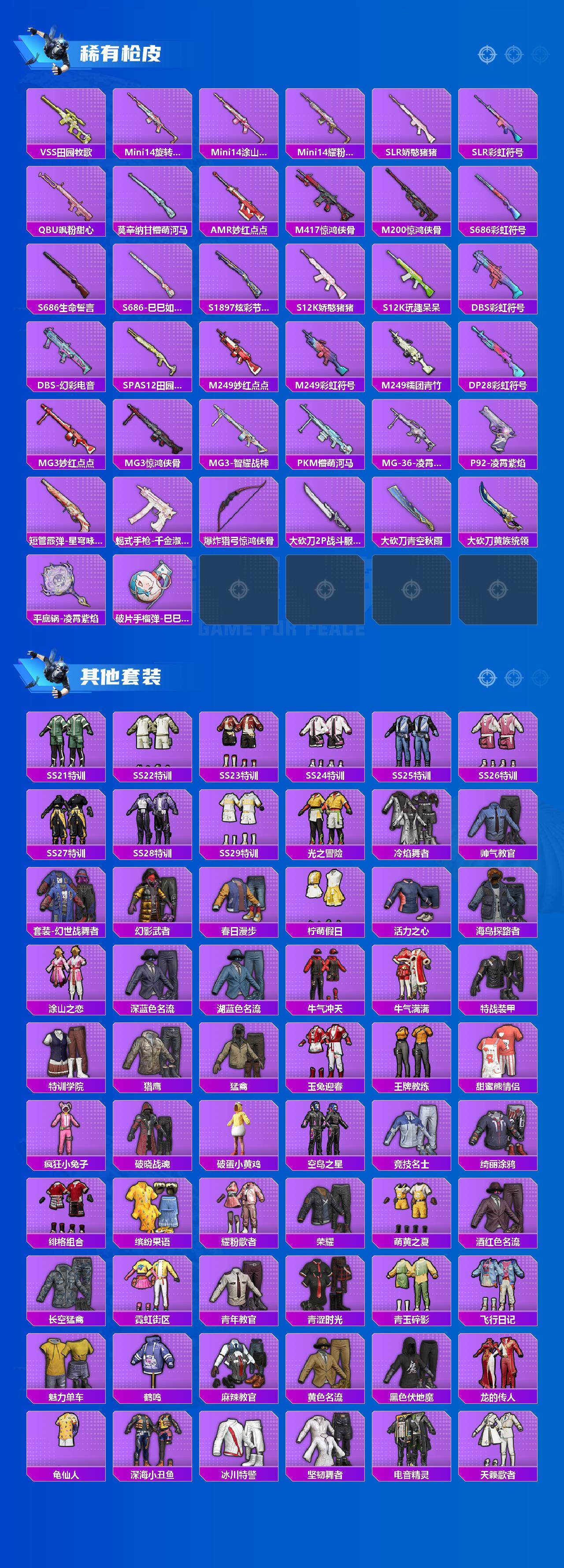 【稀有枪皮】:AKM-2P战斗服款,AKM-彩虹符号,AKM-霓虹街区,AKM-龙的传人,SCAR-L-玉兔迎春,SCAR-L-银碳小老虎,M416-摩登王国,M416-糯团青竹,M416-红色方程式,M416-绯红前夜,GROZA-2B战斗服款,GROZA-懵萌河马,GROZA-田园牧歌,AUG-天降萌叽,AUG-耀粉歌者,QBZ-未来歌姬,QBZ-洛神天依,M762-天降萌叽,M762-绯红前夜,Mk47-妙红点点,Mk47-洛神天依,G36C-懵萌河马,G36C-星穹咏叹调,AC-VAL-天降萌叽,AC-VAL-闲梦青缨,AC-VAL-圣辉之星,蜜獾-天降萌叽,蜜獾-娇憨猪猪,ARX-凌霄紫焰,UZI-啾咪啾咪,UZI-天降萌叽,UZI-娇憨猪猪,UMP45-涂山之恋,UMP45-炫光之旅,UMP45-生命誓言,Vector-田园牧歌,汤姆逊-天降萌叽,汤姆逊-炫彩节奏,汤姆逊-耀粉歌者,汤姆逊-智耀战神,JS9-凌霄紫焰,P90-巳巳如意,Kar98K-彩虹符号,Kar98K-洛神天依,M24-樱桃泡泡,SKS-炫彩节奏,SKS-糯团青竹,VSS-彩虹符号,VSS-田园牧歌,Mini14-旋转彩虹,Mini14-涂山之恋,Mini14-耀粉歌者,S