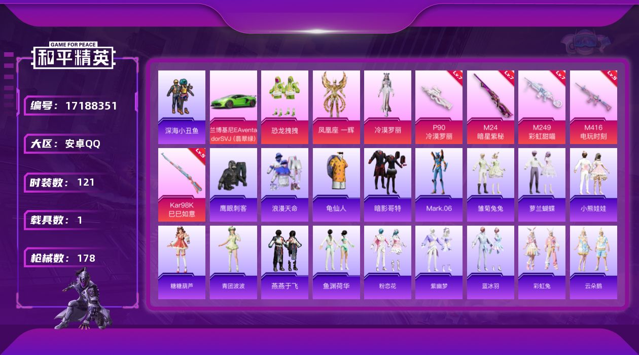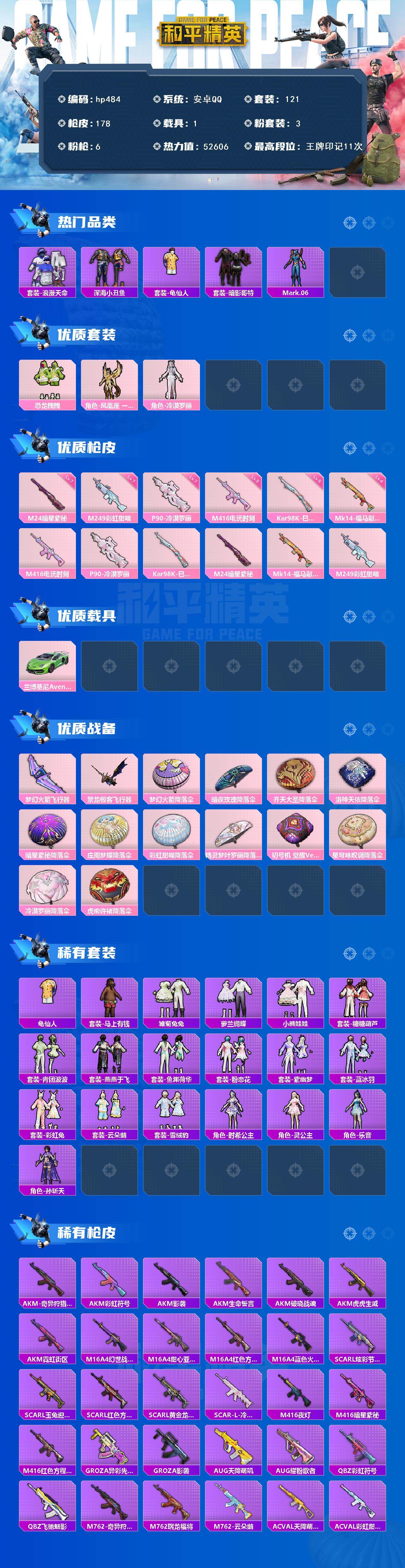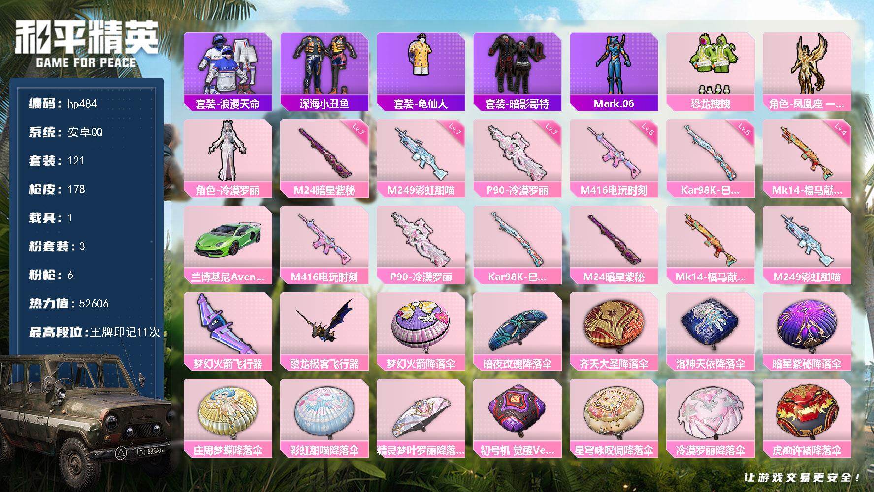 [17188351]安卓 手Q-3粉装-6特效枪-1载具-2粉色飞行器-52606热力值-11王牌印记-121套装-178枪皮 【热门品类】:套装-浪漫天命,套装-深海小丑鱼,套装-龟仙人,套装-暗影哥特,角色-Mark.06 【粉色套装】:粉装-恐龙拽拽,角色-凤凰座 一辉,角色-冷漠罗丽 【粉色枪皮等级】:M416-电玩时刻(五级),P90-冷漠罗丽(七级),Kar98K-巳巳如意(五级),M24-暗星紫秘(七级),Mk14-福马献瑞(四级),M249-彩虹甜喵(七级) 【粉色载具】:兰博基尼Aventador SVJ(翡翠绿) 【粉色枪皮】:M416-电玩时刻,P90-冷漠罗丽,Kar98K-巳巳如意,M24-暗星紫秘,Mk14-福马献瑞,M249-彩虹甜喵 【粉色飞行器】:梦幻火箭飞行器,繁龙极客飞行器 【粉色降落伞】:梦幻火箭降落伞,暗夜玫瑰降落伞,齐天大圣降落伞,洛神天依降落伞,暗星紫秘降落伞,庄周梦蝶降落伞,彩虹甜喵降落伞,精灵梦叶罗丽降落伞,初号机 觉醒Ver.降落伞,星穹咏叹调降落伞,冷漠罗丽降落伞,虎痴许褚降落伞 【稀有套装】:套装-龟仙人,套装-马上有钱,套装-雏菊兔兔,套装-萝兰蝴蝶,套装-小熊娃娃,套装-糖糖葫芦,套装-青团波波,套装-燕燕于飞,套装-鱼渊荷华,套装-粉恋花,套装-紫幽梦,套装-蓝冰羽,套装-彩虹兔,套装-云朵鹅,套装-雪绒豹,角色-时希公主,角色-灵公主,角色-乐音,角色-孙斩天 【稀有枪皮】:AKM-奇异狩猎者,AKM-彩虹符号,AKM-影袭,AKM-生命誓言,AKM-破晓战魂,AKM-虎虎生威,AKM-霓虹街区,M16A4-幻世战舞者,M16A4-甜心亚梦,M16A4-红色方程式,M16A4-蓝色火焰,SCAR-L-炫彩节奏,SCAR-L-玉兔迎春,SCAR-L-红色方程式,SCAR-L-黄金龙骨,SCAR-L-冷漠罗丽,M416-夜灯,M416-暗星紫秘,M416-红色方程式,GROZA-异彩先驱,GROZA-影袭,AUG-天降萌叽,AUG-耀粉歌者,QBZ-彩虹符号,QBZ-飞驰魅影,M762-奇异狩猎者,M762-瑞龙福将,M762-云朵鹅,AC-VAL-天降萌叽,AC-VAL-彩虹甜喵,AC-VAL-甜心亚梦,蜜獾-天降萌叽,蜜獾-娇憨猪猪,UZI-天降萌叽,UZI-娇憨猪猪,UZI-影袭,UZI-炫彩节奏,UZI-红色方程式,